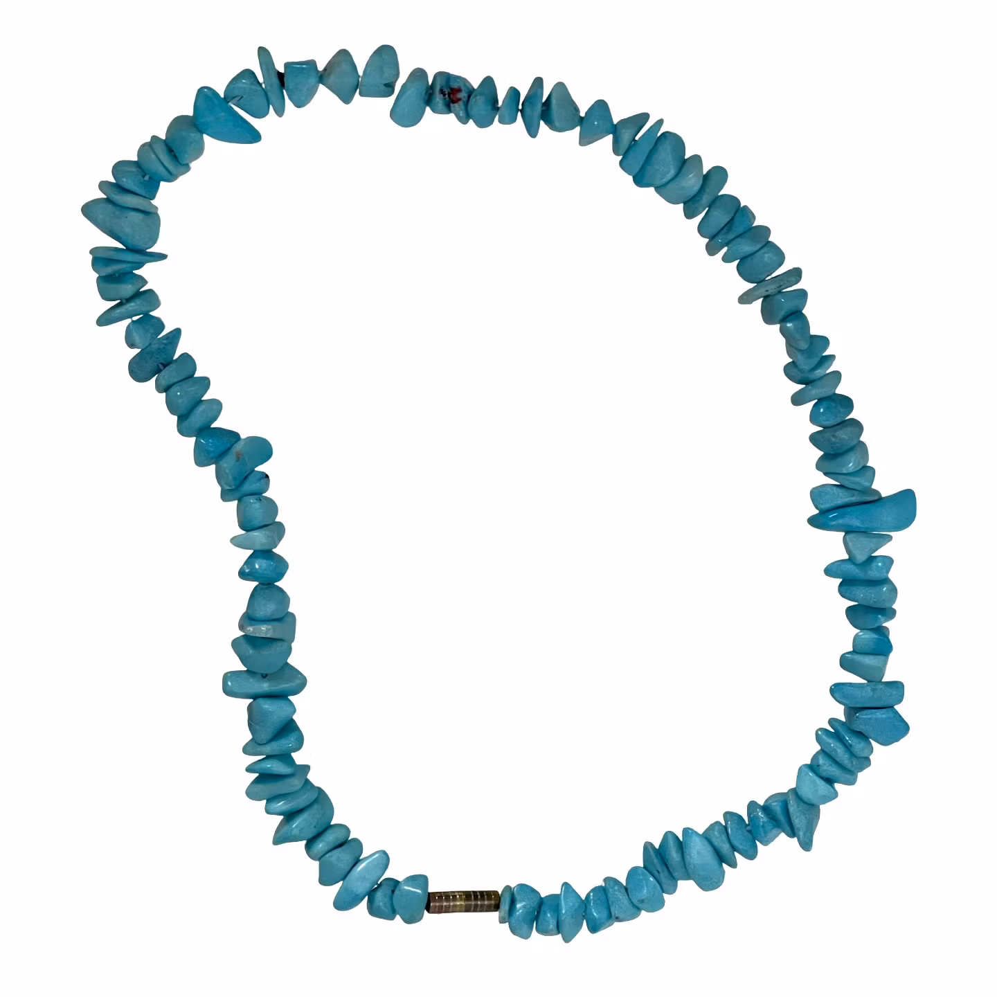 Dekorativt vintage halsband med turkosfärgade chips av Howlit/Magnesit. Typiskt smycke från 1960-1980-talet med klassiskt skruvlås i metall. Perfekt som retro accessoar stil.