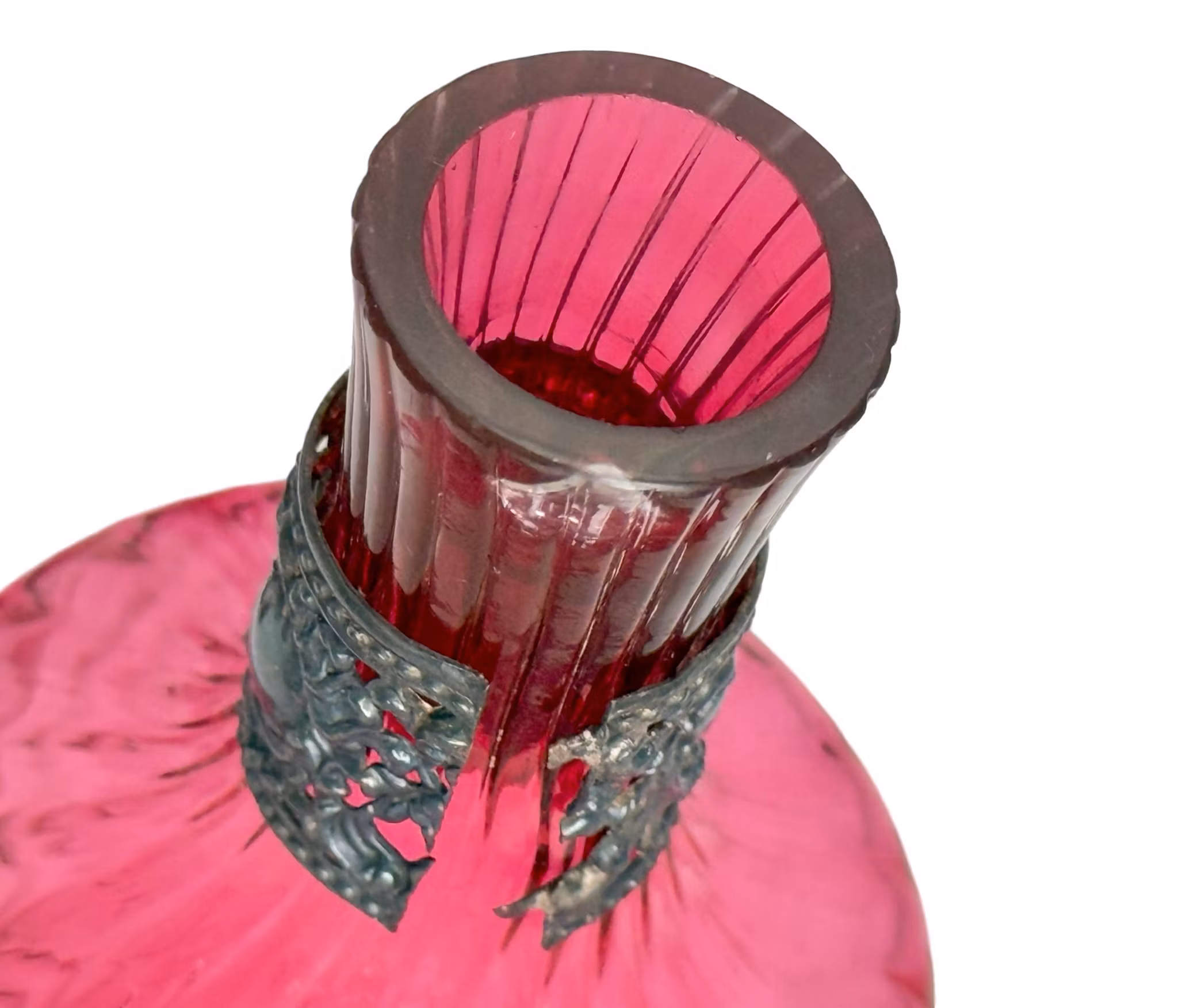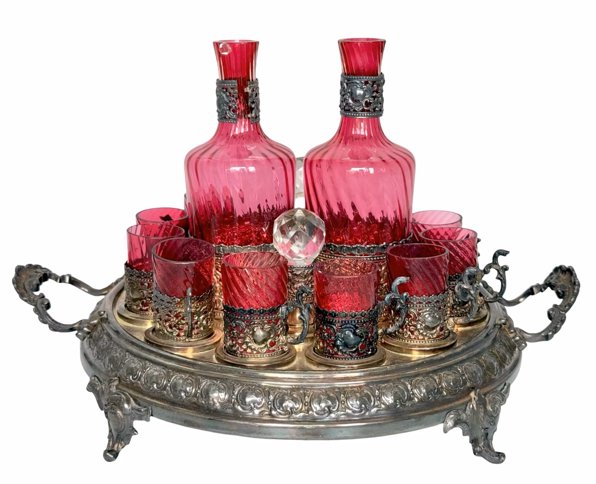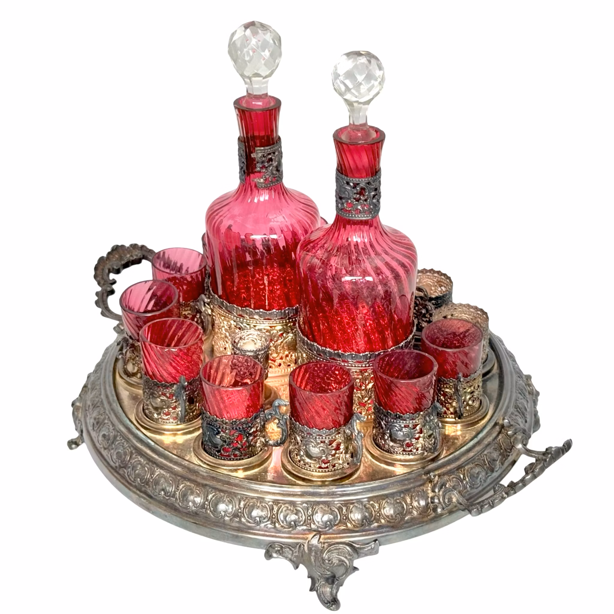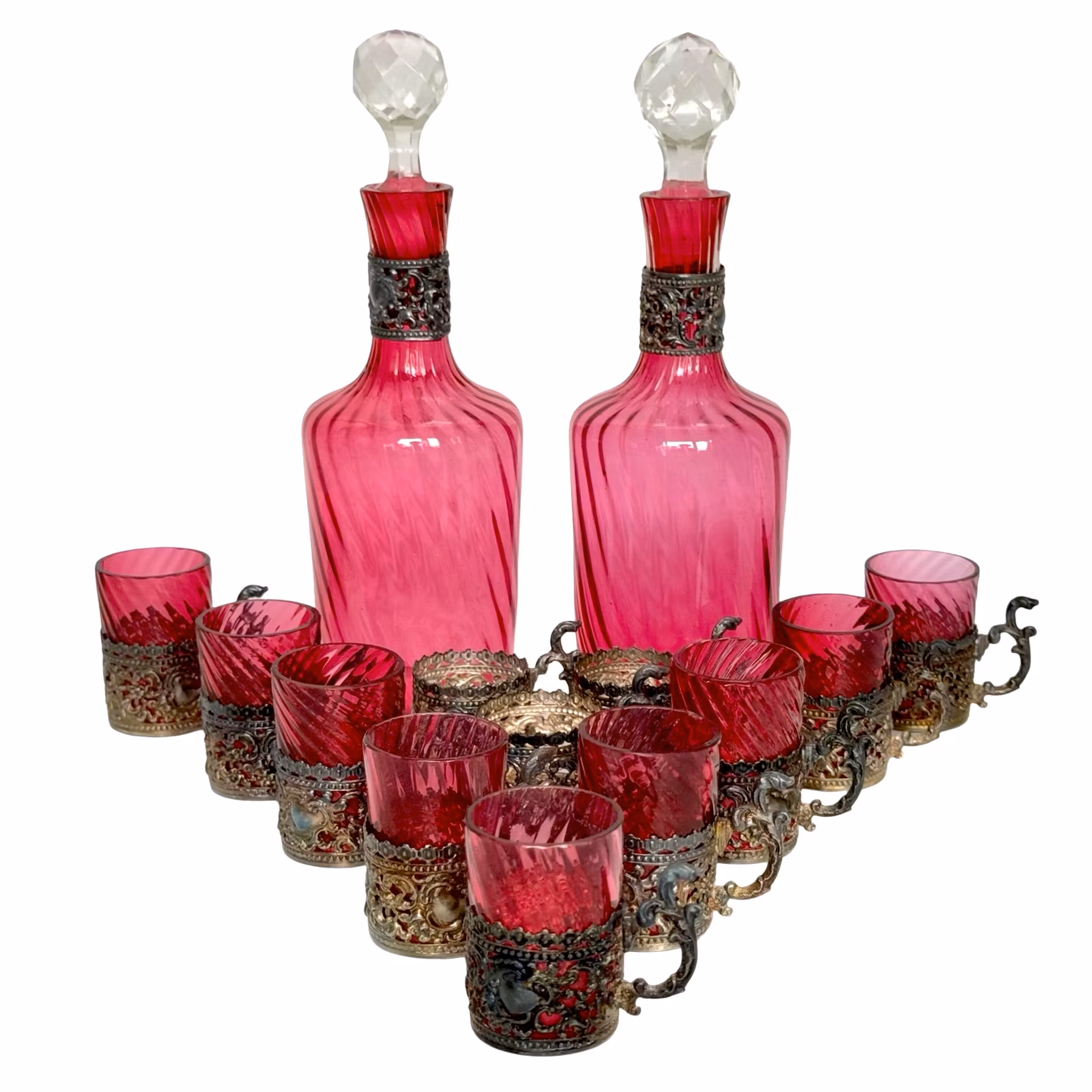 Antik uppsättning karaffer med koppar, färgat glas med nysilver