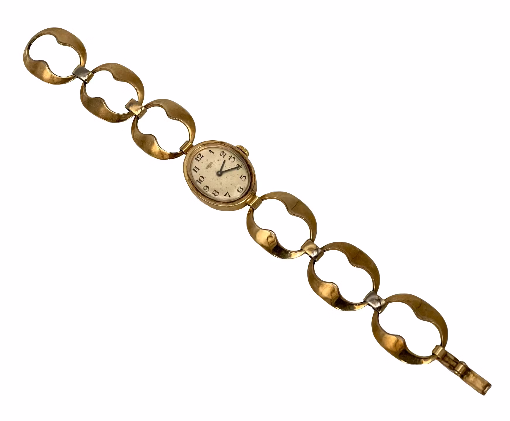 Stilrent vintage damur från Ankra med elegant oval boett och dekorativ guldfärgad länk. Klassisk ljus urtavla med tydliga arabiska siffror. Ett tidstypiskt armbandsur från ca 1940-50-tal som passar både samlare och som unik accessoar.
