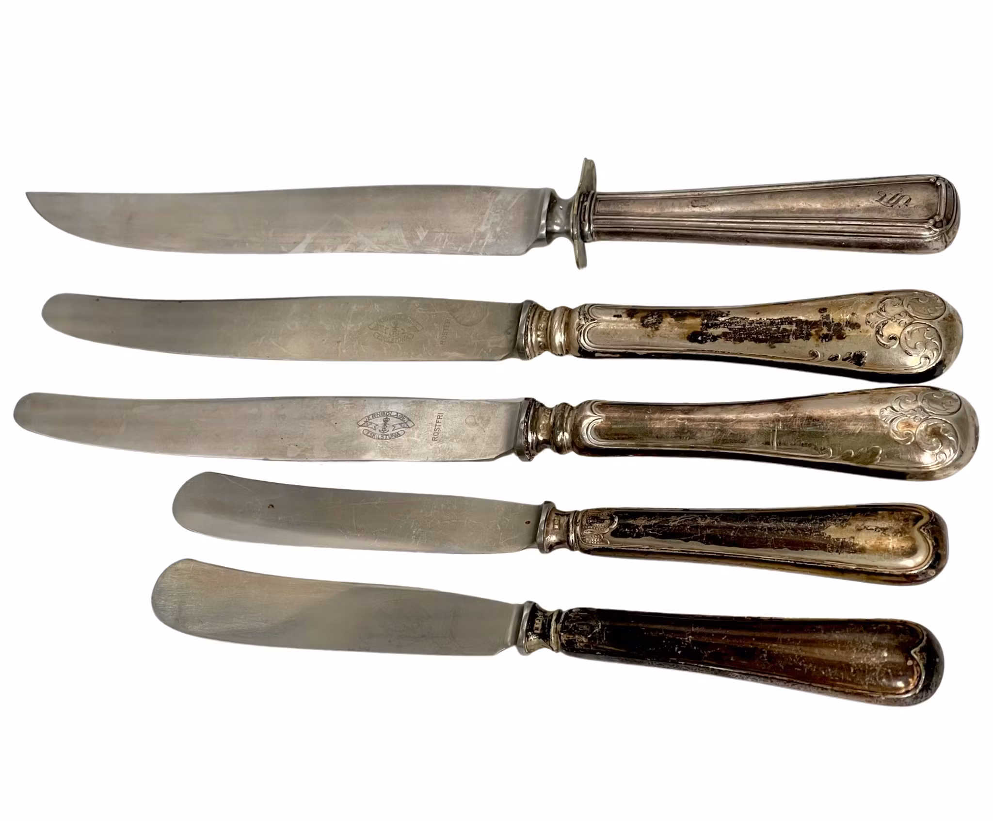 Diferentes modelos de cuchillos plateados con hoja de acero de 383 g aprox. 180,00 € Slutsåld Información Olika modeller av silver matknivar med stålblad Totalvikt: ca 383 g.