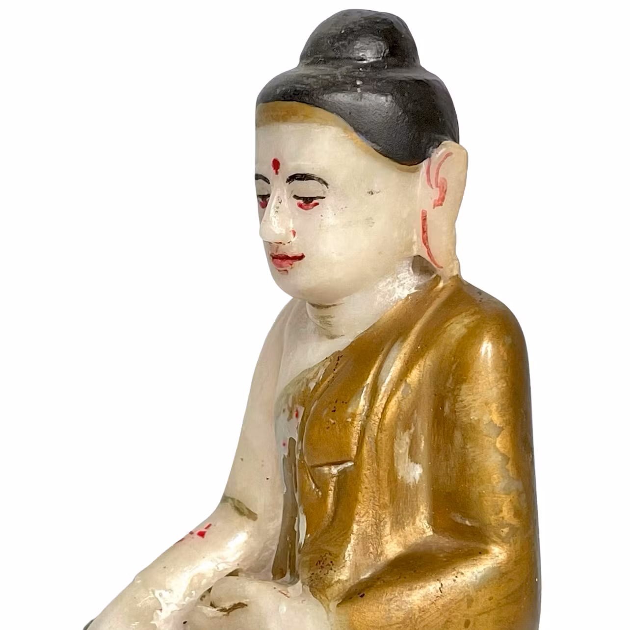 Denna typ av alabasterstaty användes traditionellt i tempel och privata altaren i regionen Mandalay och är uppskattad för sitt lugna uttryck och äkta hantverk.