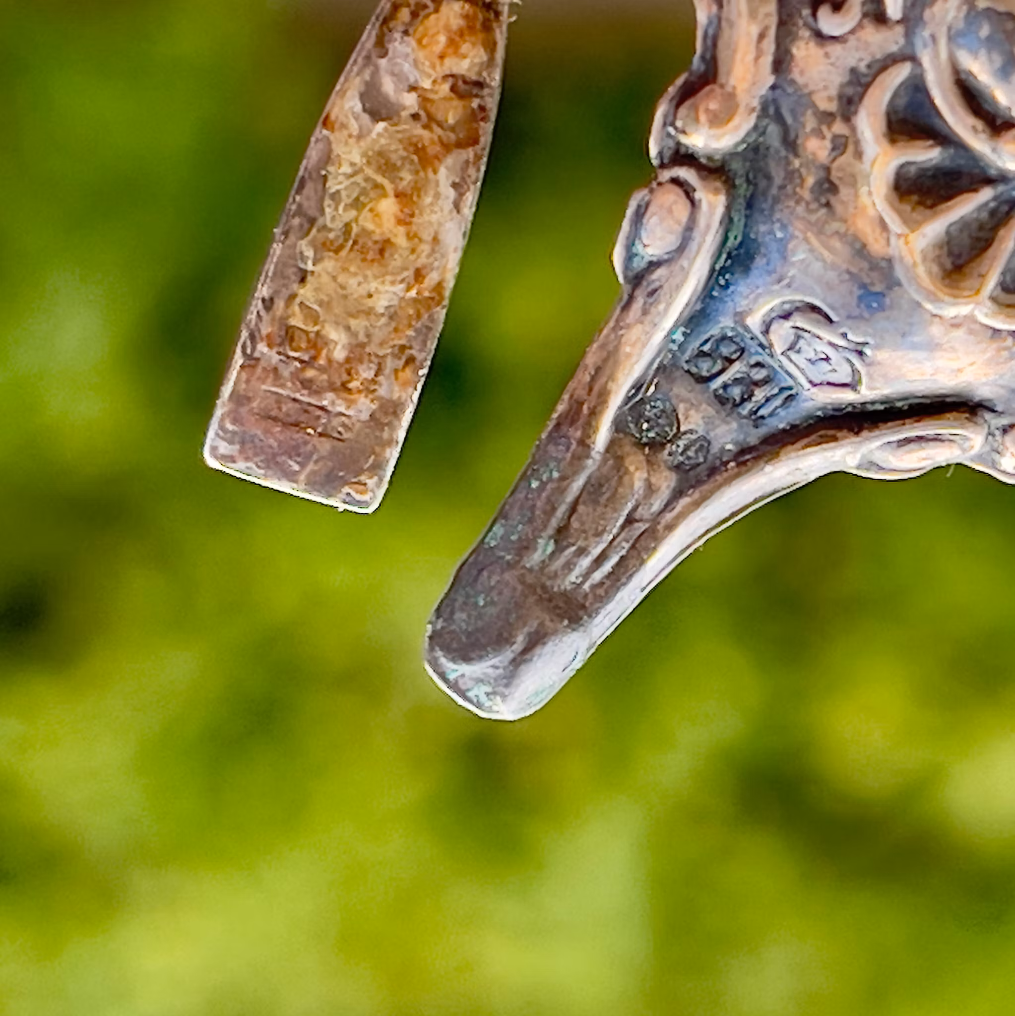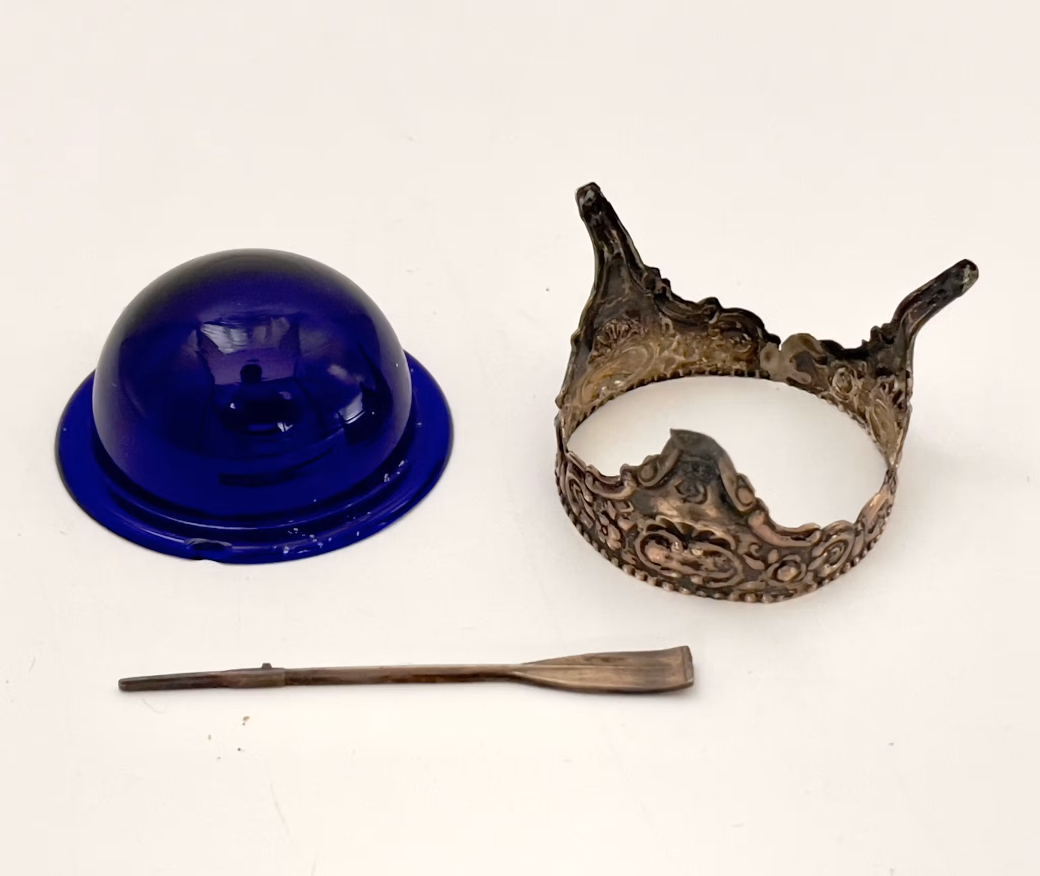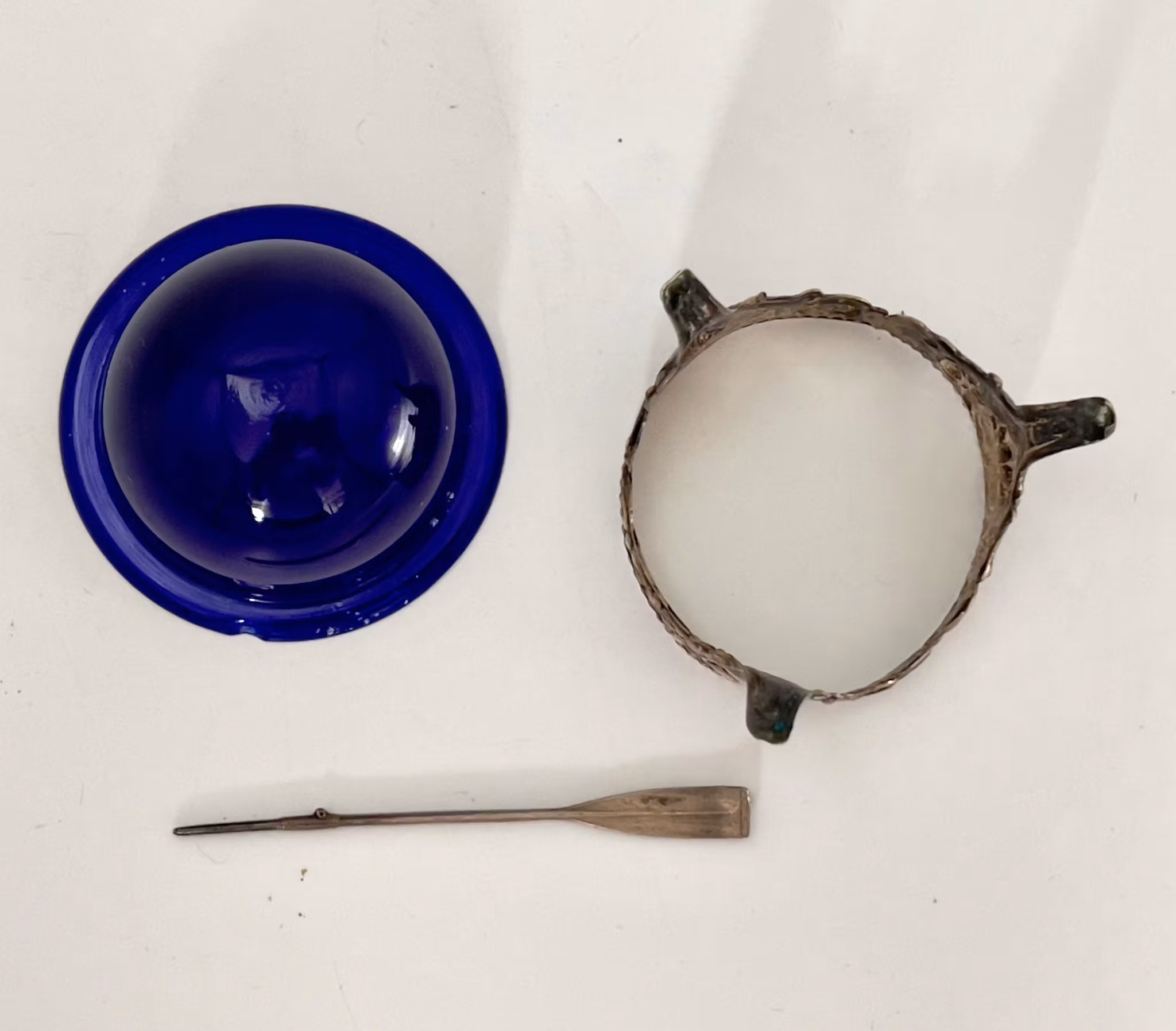En liten Saltkar med saltspadar, silver 880, blått glas, 1800-talet