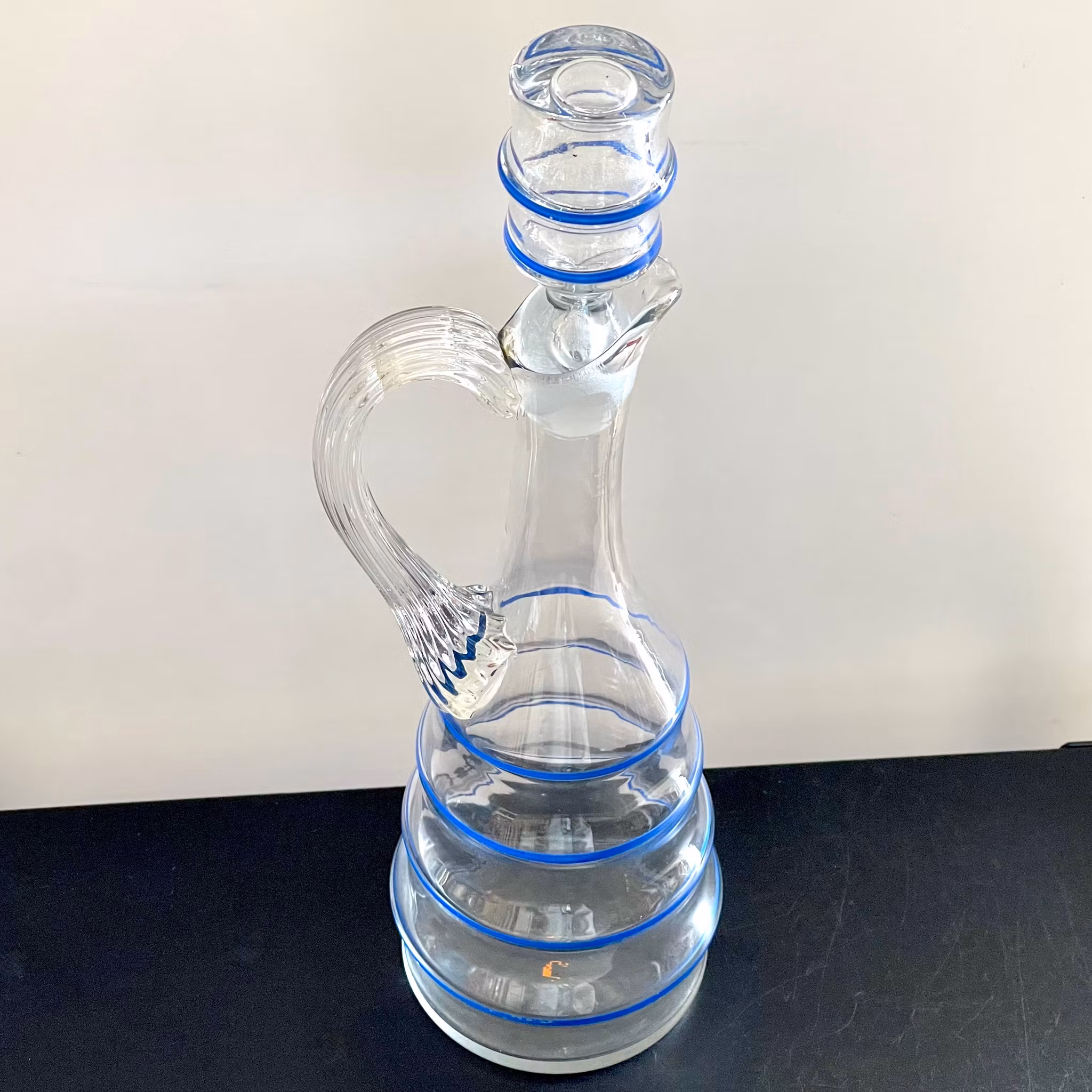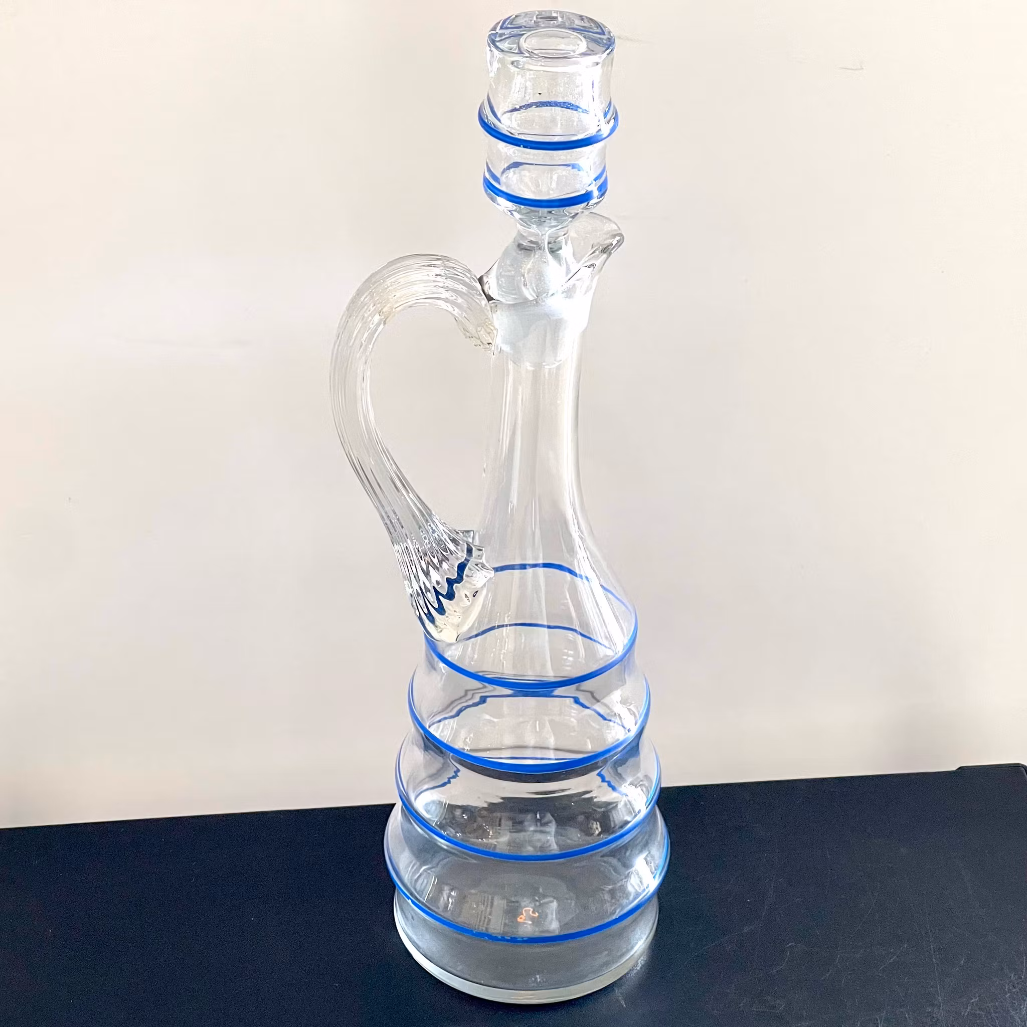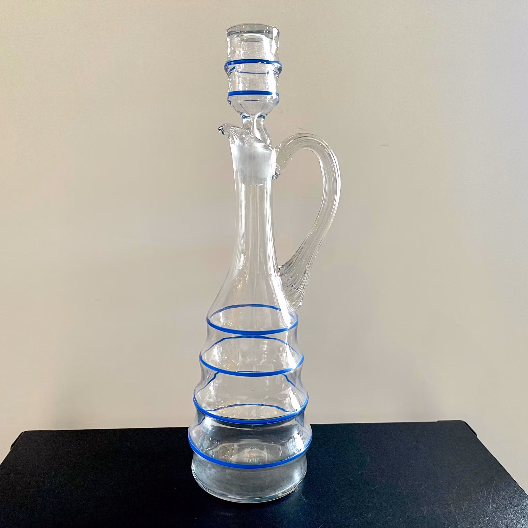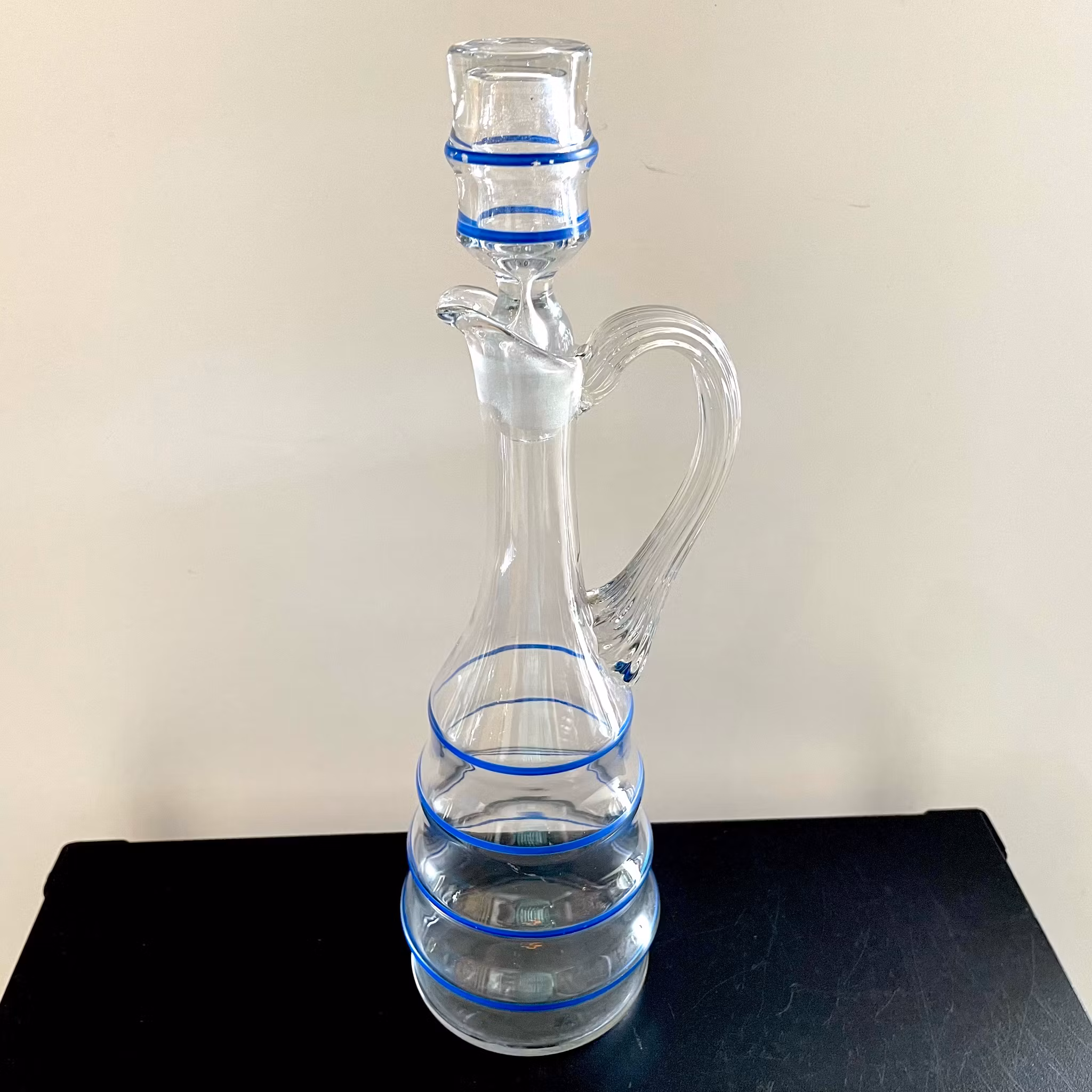 Handblåst med Blå handmålade ränder/linjer runt kork och karaff.