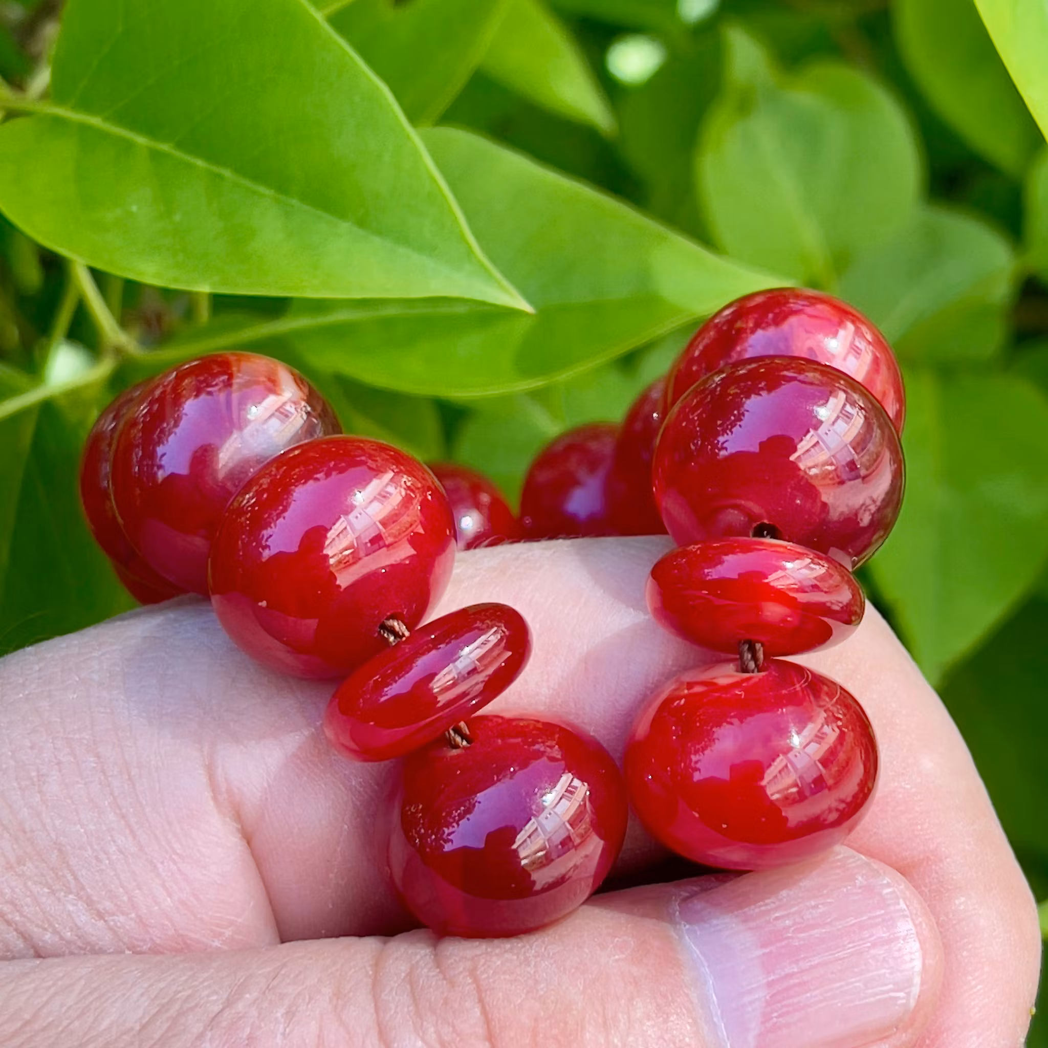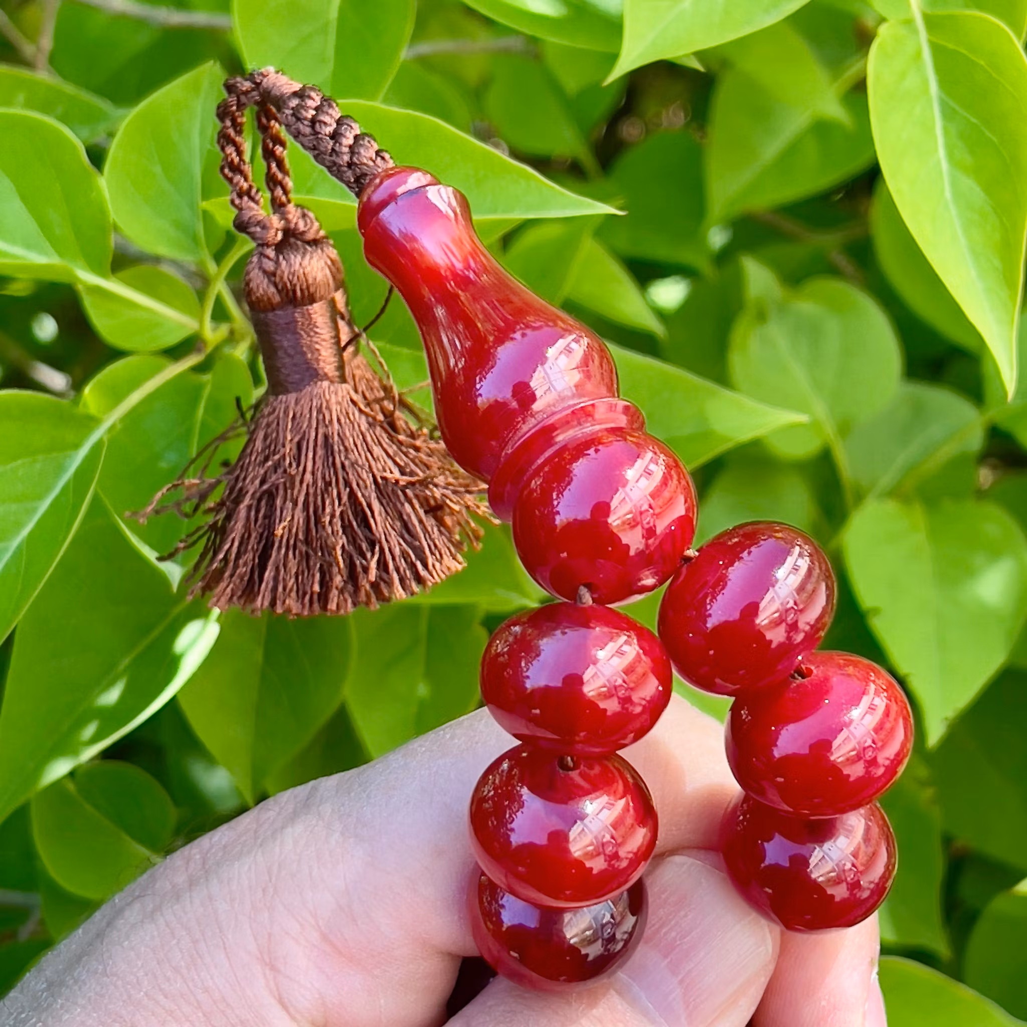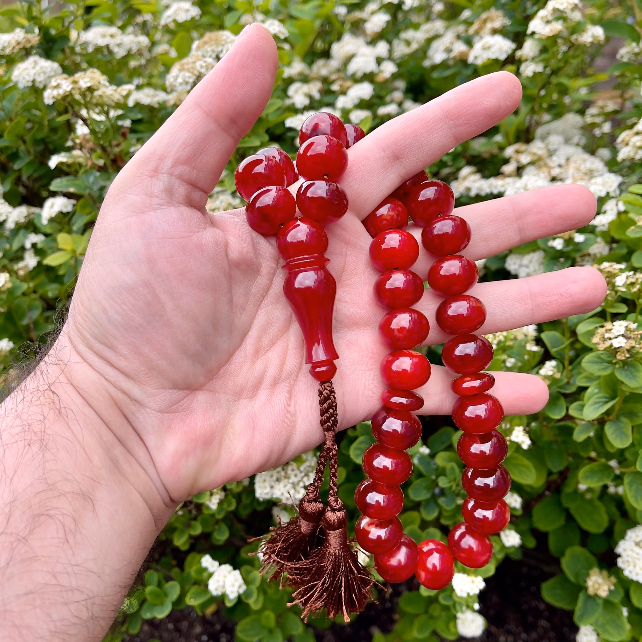 Körsbärs bakelit radband, 137 g $308.00 Añadir al carrito Información Körsbärs bakelit radband, 33 pärlorTotalt vikt: 137,8 gramPärlor: ca 18 x 15 mm