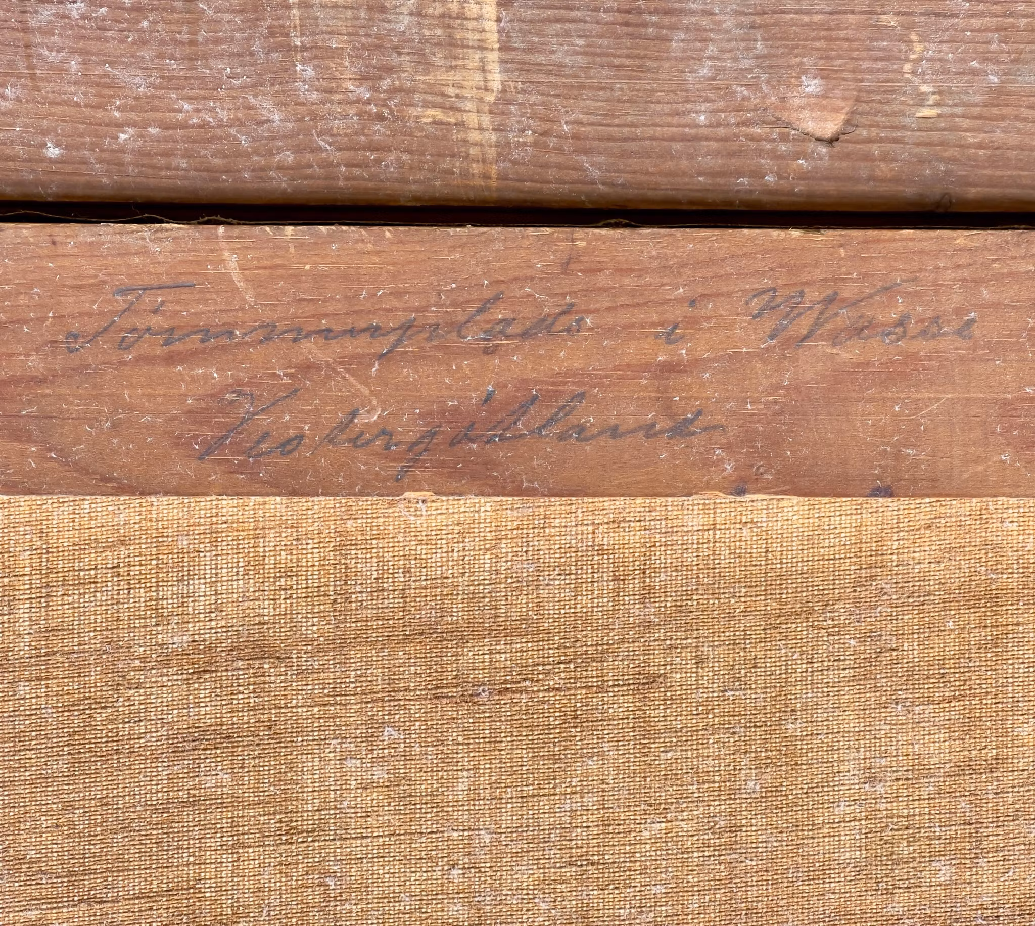 - Ram: Originalram i massivt trä med förgylld yta i tidig 1900-talsstil. Profilerad med ornamenterad ytterkant och pärlstavsmönster. Matt guldfinish med naturlig patina. Något lös konstruktion – behöver limmas eller stabiliseras för att bli helt stadig. Baksidan har metalltråd för upphängning.