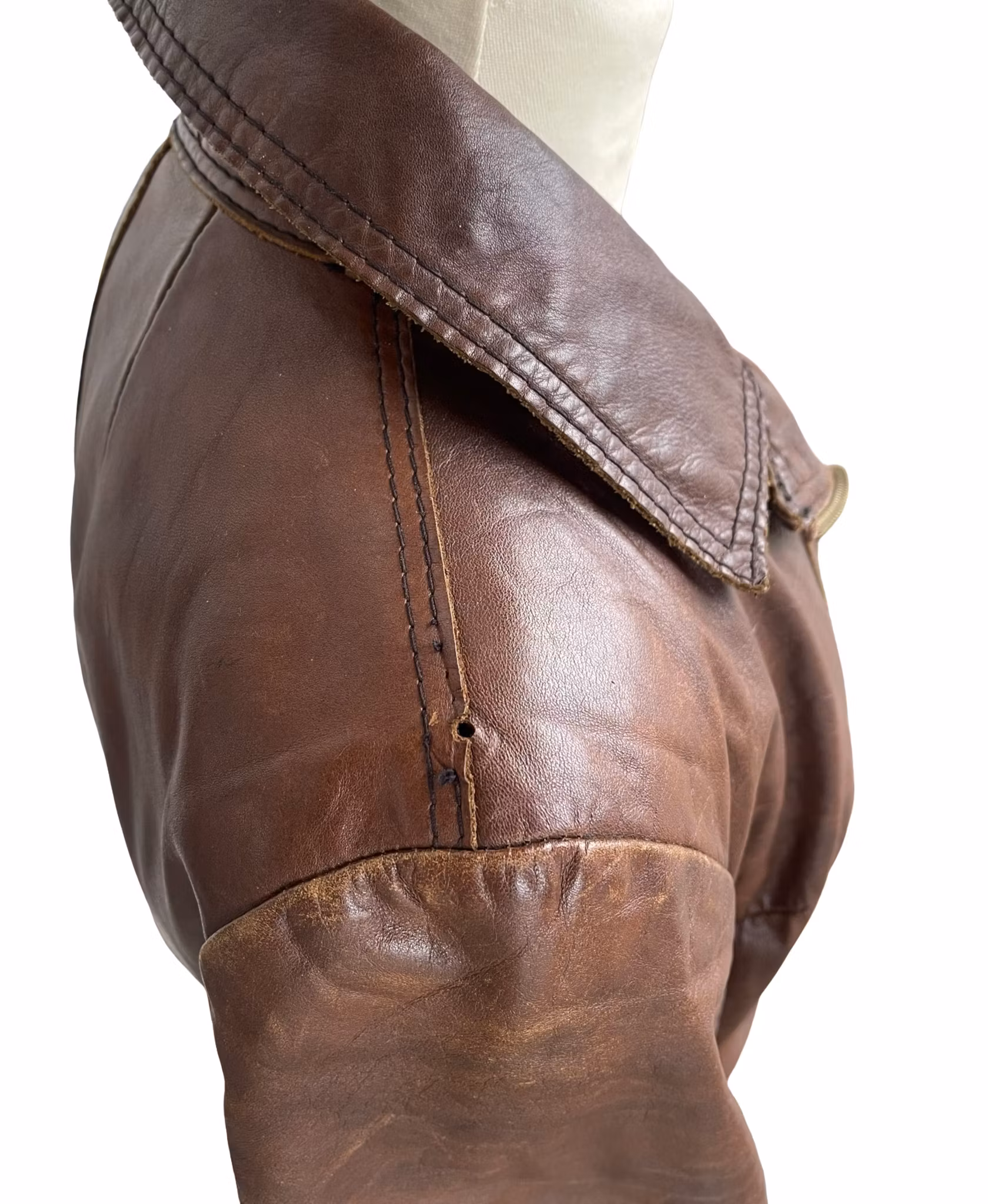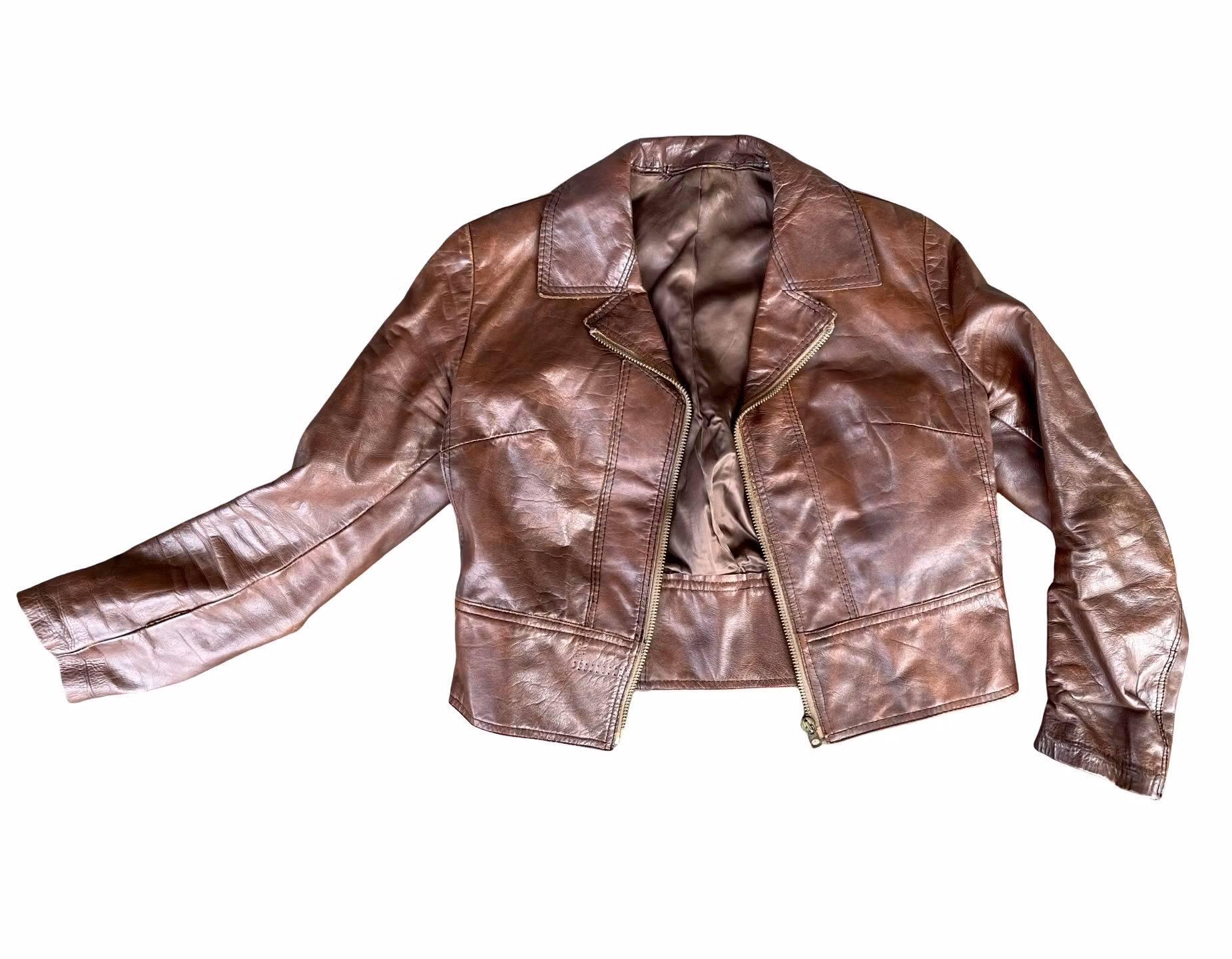 Klassisk och stilren äkta skinn jacka från MOLLTAN, tillverkad i mjukt brunt läder med vacker naturlig patina. En tidlös modell som passar både vardag och elegant stil. Jackan har hög kvalitet i material och sömmar och är fortfarande fullt användbar.