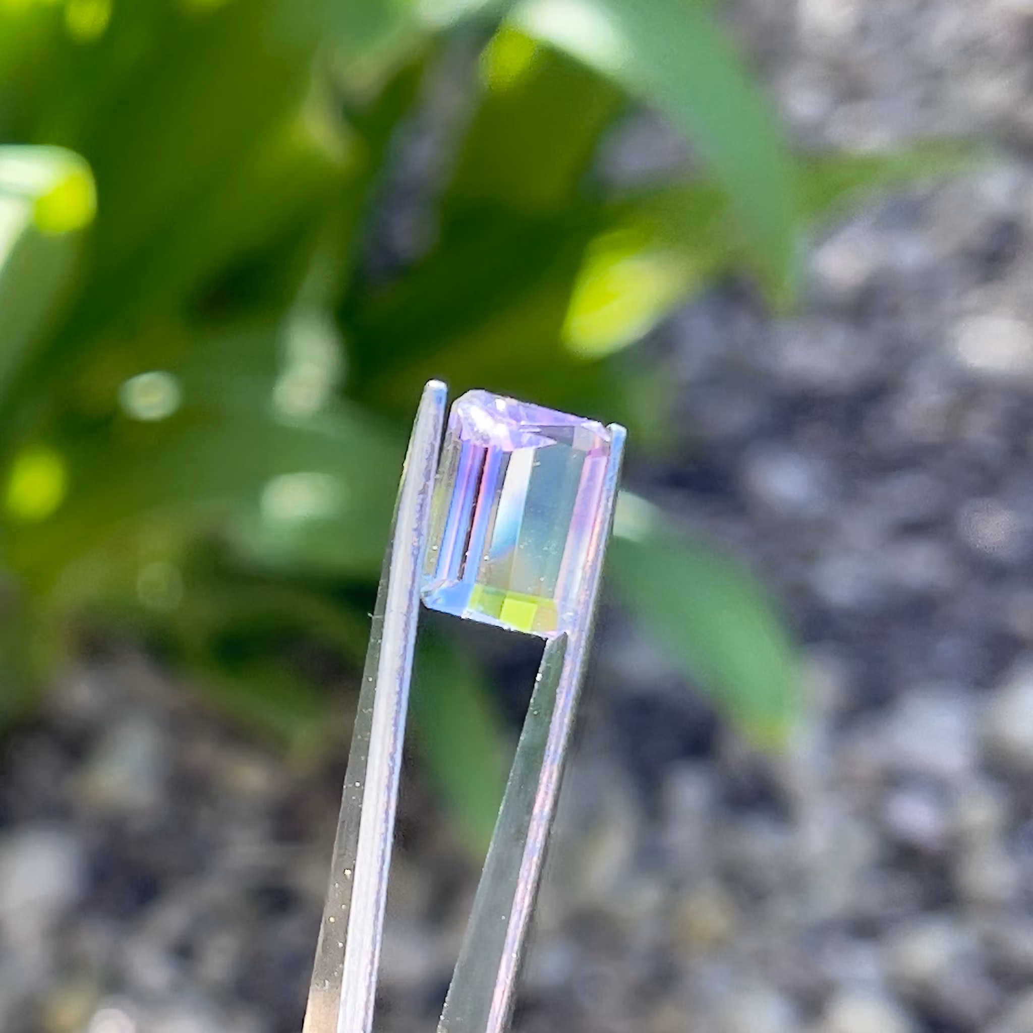 Stenen spelar levande i rosa, violett toner, vilket ger ett exklusivt, levande och lyxigt uttryck. Den klassiska smaragd slipningen (Emerald Cut) framhäver både klarhet, färgdjup och stenens naturliga karaktär på ett mycket elegant sätt.