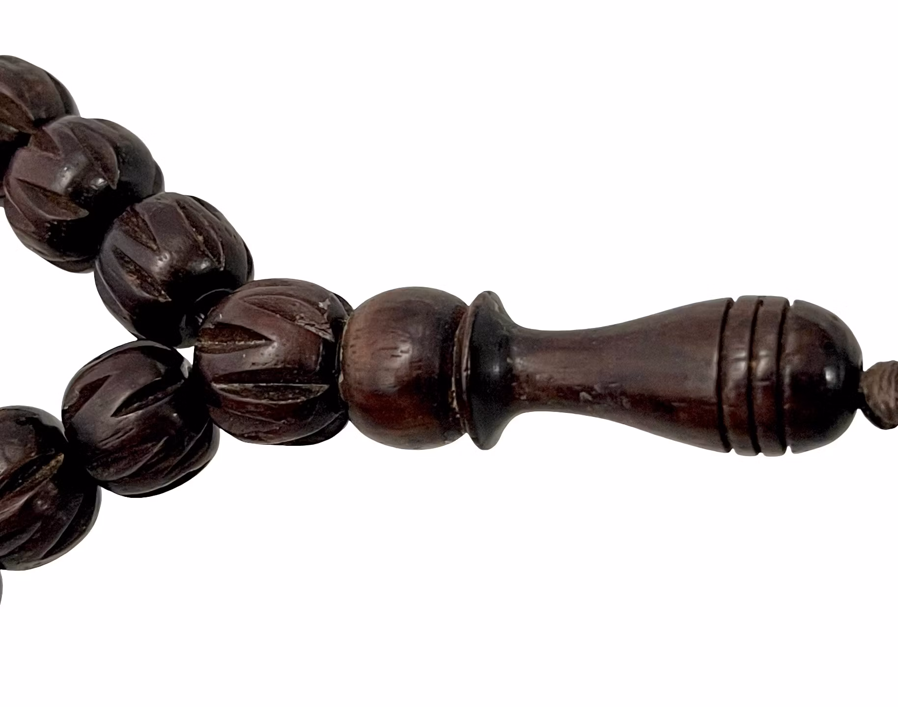 Handskuret osmanskt radband. Mörkt tropiskt hårdträ, troligen padauk/kuka.
