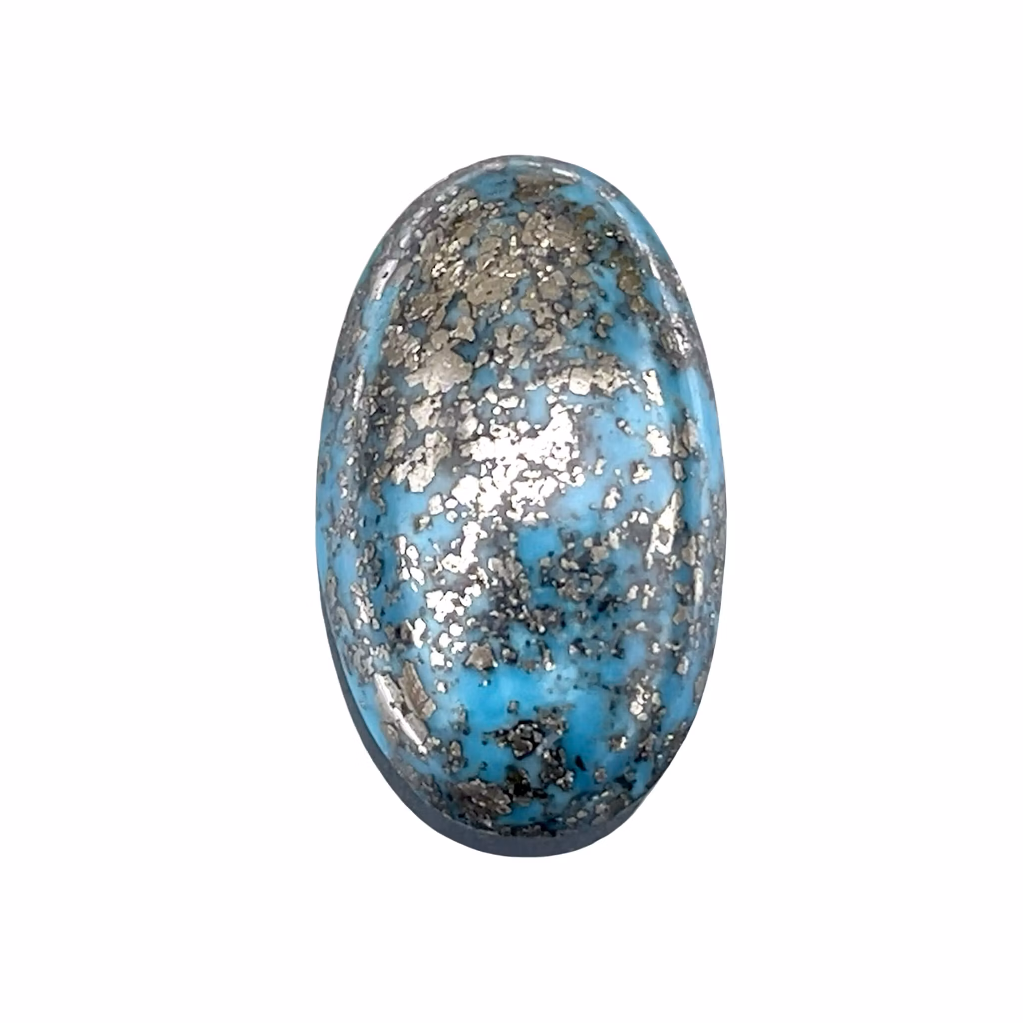 Stenen har en attraktiv blå/turkos ton med metalliska pyrit/matrix inslag, vilket ger den ett exklusivt och levande utseende. Den ovala cabochon slipningen gör den mycket lämplig för både ring, hänge, silver smide eller samling.
