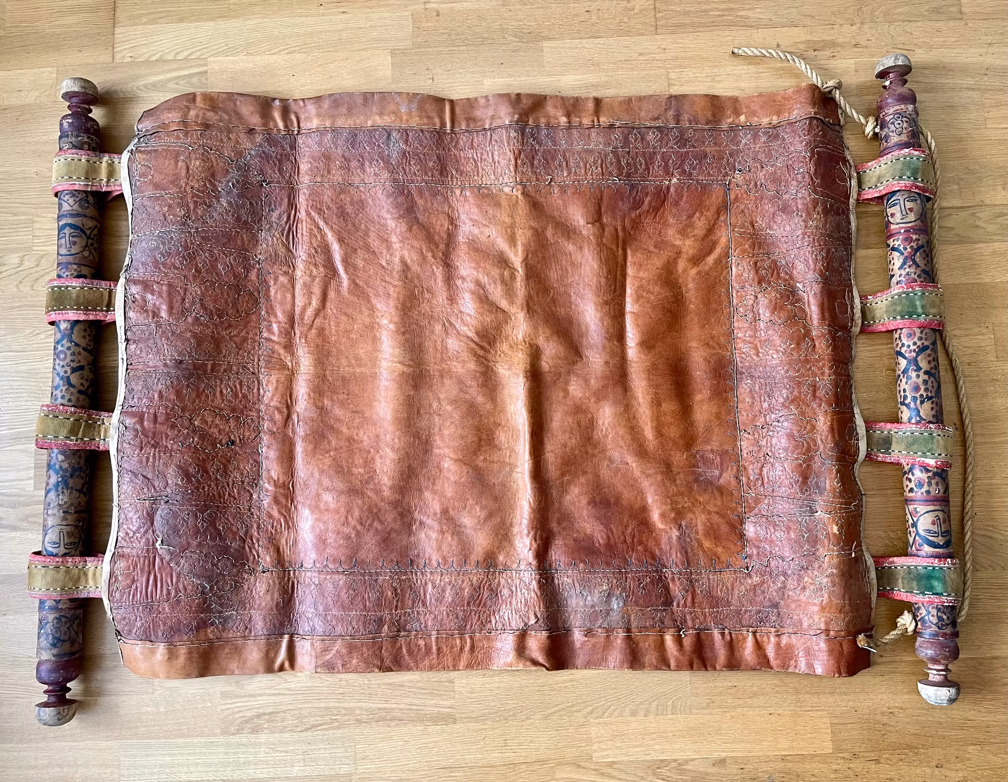 Antikk teppe, fløyel og skinn $220.00 Utsolgt Informasjon Antik mattan, sammet och skinn, bemålad träMått: ca 145 x 100 cm, slitage