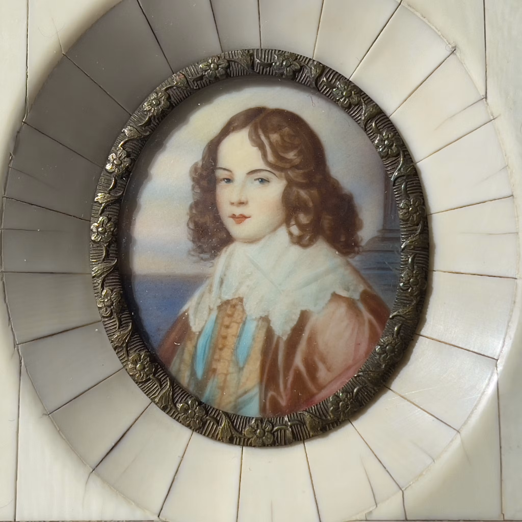 Miniaturowy obraz sygnowany, rama z kości $198.00 Slutsåld Informacja Antik Miniatyrtavla bär signatur, ram av ben ca 10 X 9 cm inkl ram.