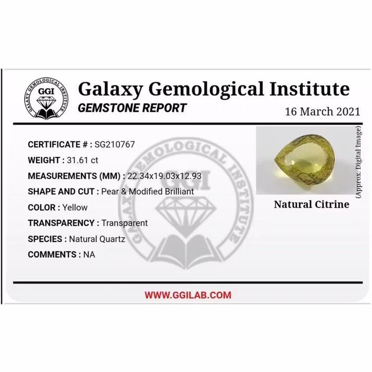 Naturalny cytryn o masie 31,61 karata z certyfikatem