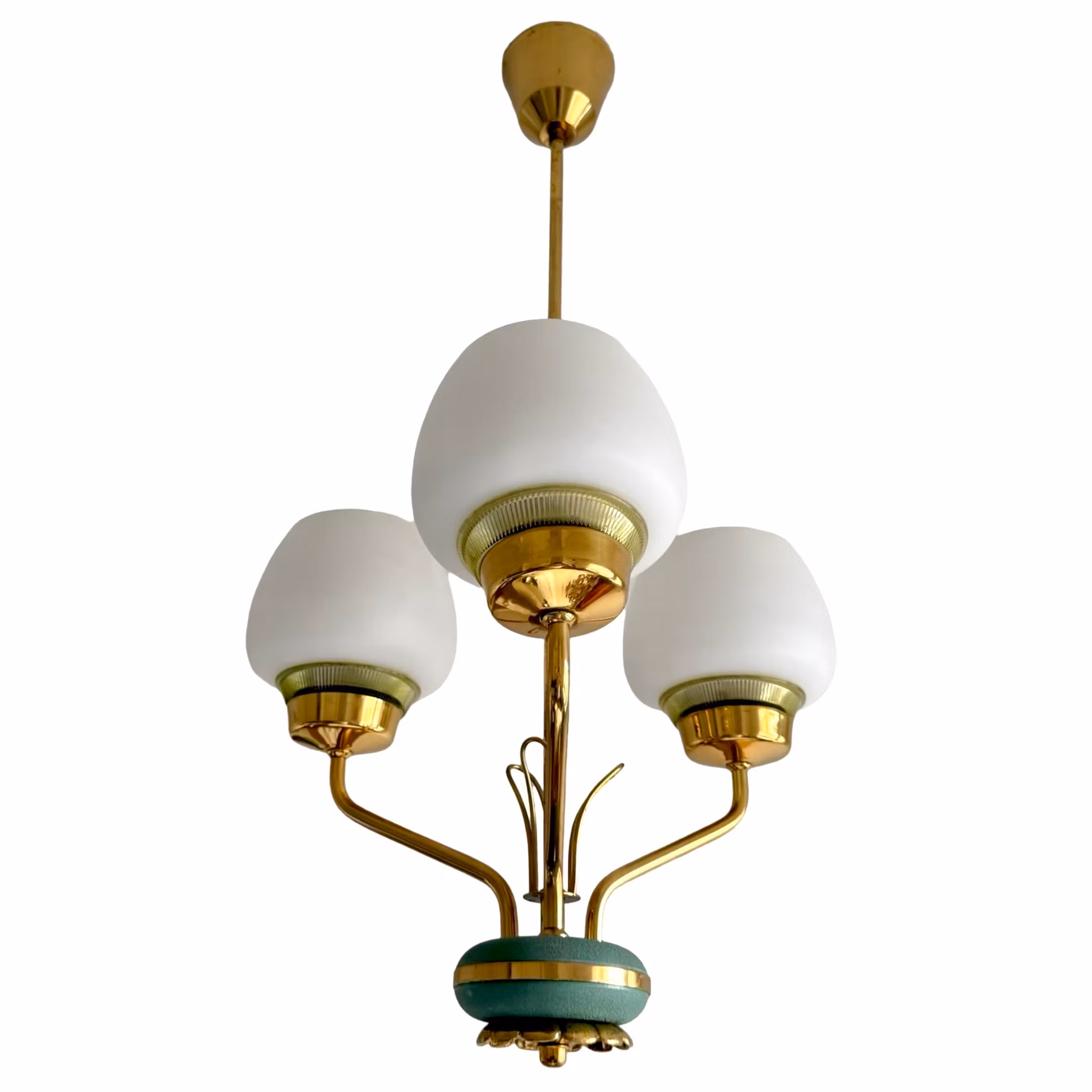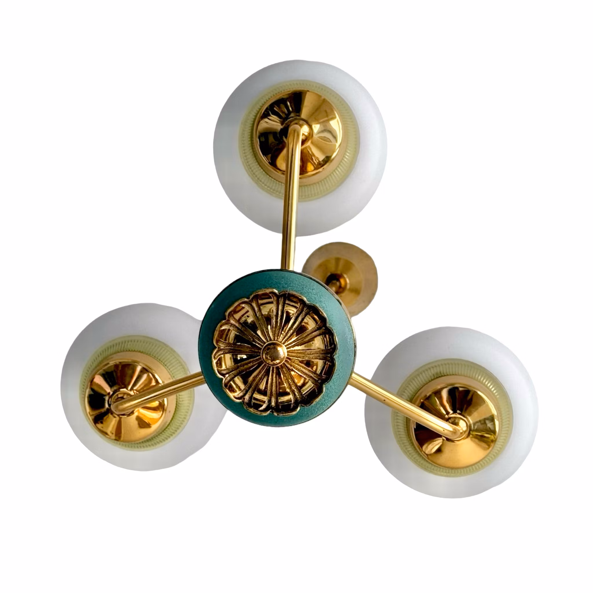 Lampa sufitowa AJH 4, rama mosiężna z trzema kloszami z opalowego szkła