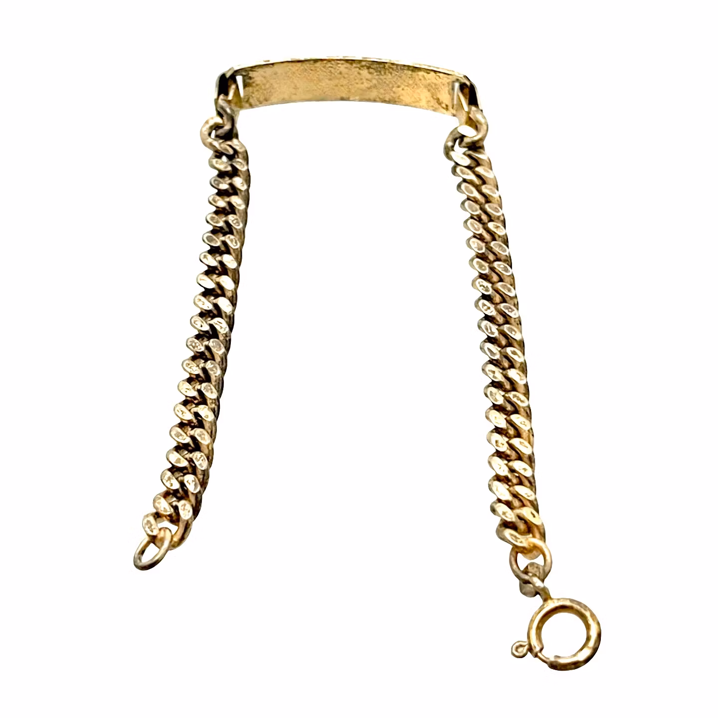 Elegant ID armband i guldpläterat 925 sterling silver. Armbandet har en kraftig, tät länkkedja och en stilren bricka som lämpar sig för gravyr. Stabilt fjäderlås. I gott vintage skick med normalt ytslitage.