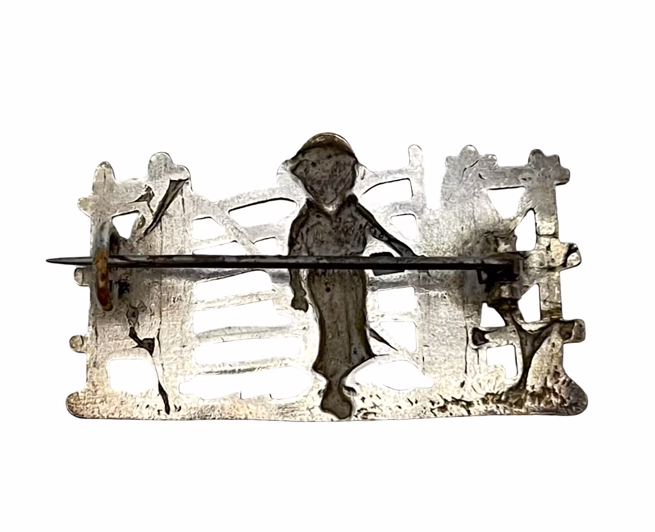 Vacker brosch i vitmetall med motiv av en flicka i klänning och huva, stående vid en grind med staket