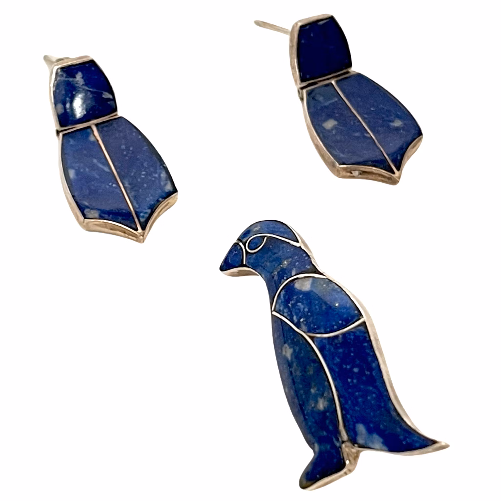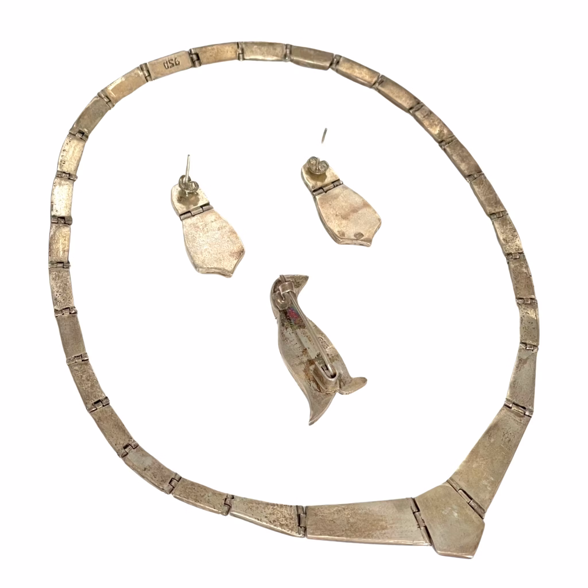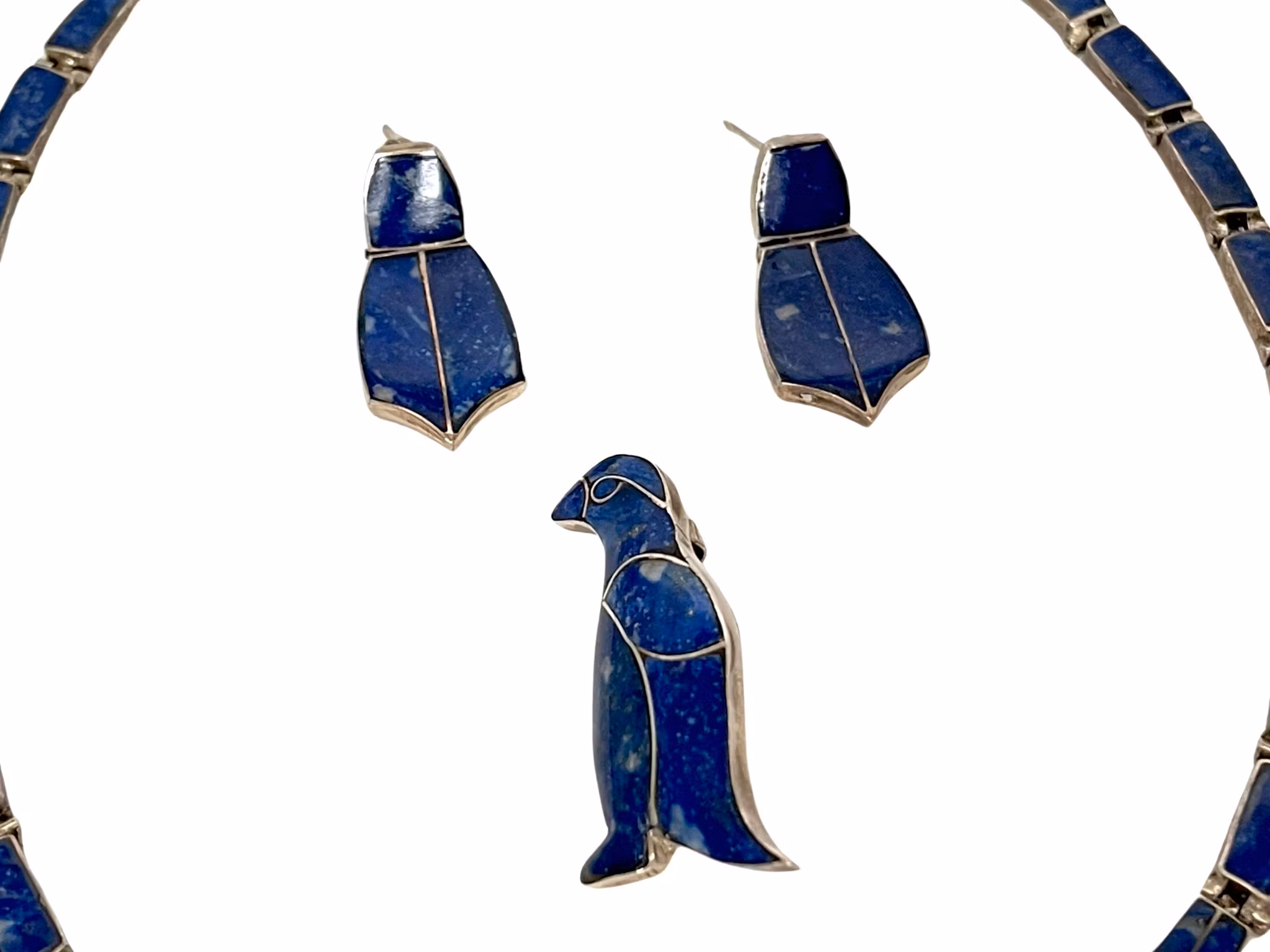 Sterling Silver 950 smycke med Inlägg blå Lapis Lazuli Halsband, Örhänge set med brosch.