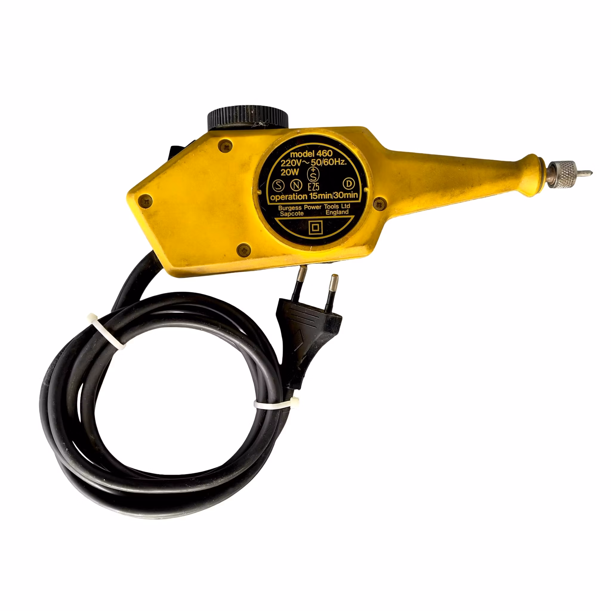 Klassisk elektrisk gravyr penna / gravyr verktyg från Burgess Power Tools Ltd, England. Denna modell, Handy Engraver Powerline Model 460, är ett praktiskt vintage verktyg för gravering av olika material som metall, glas, plast och trä. Den karakteristiska gula designen gör den även attraktiv för samlare av vintage verktyg.