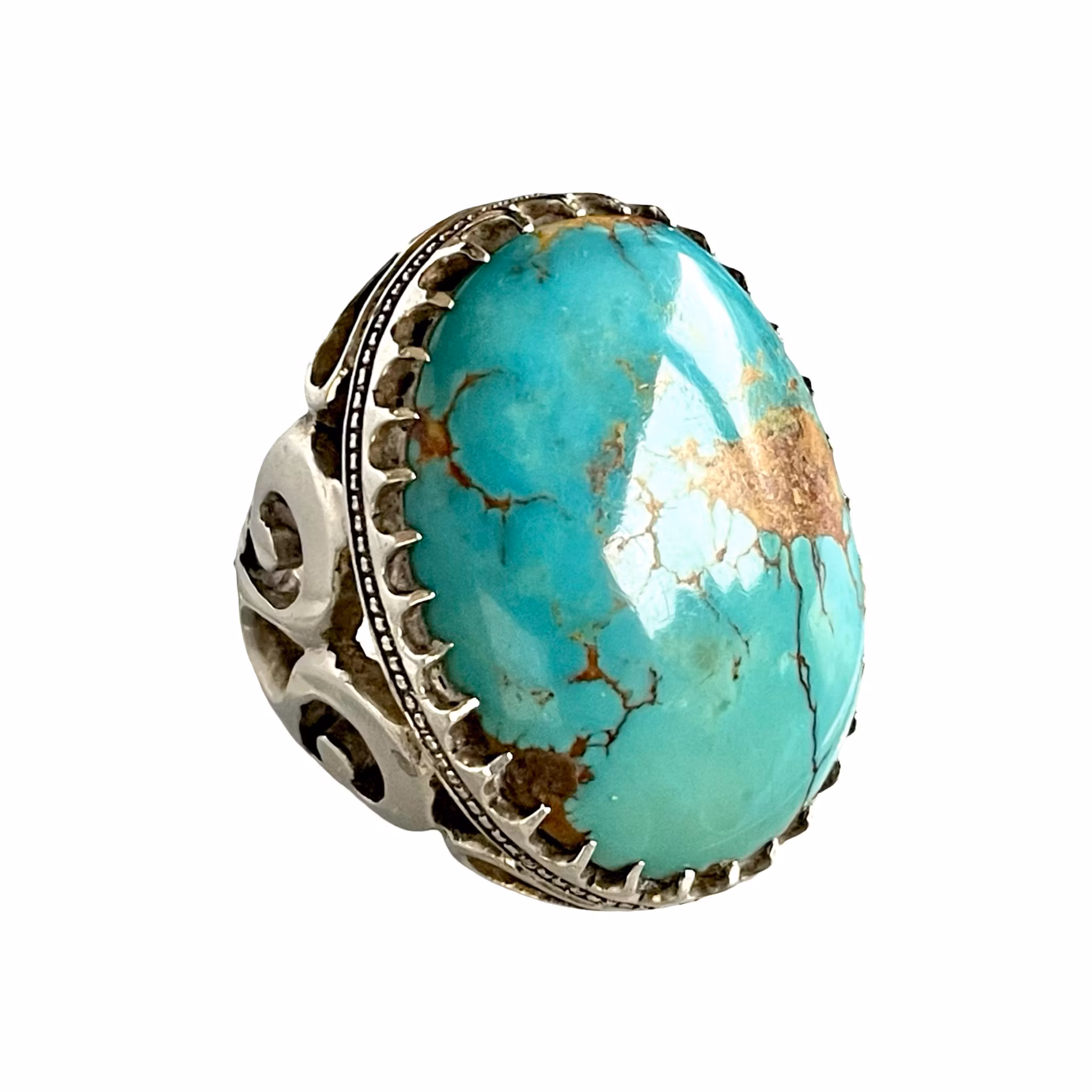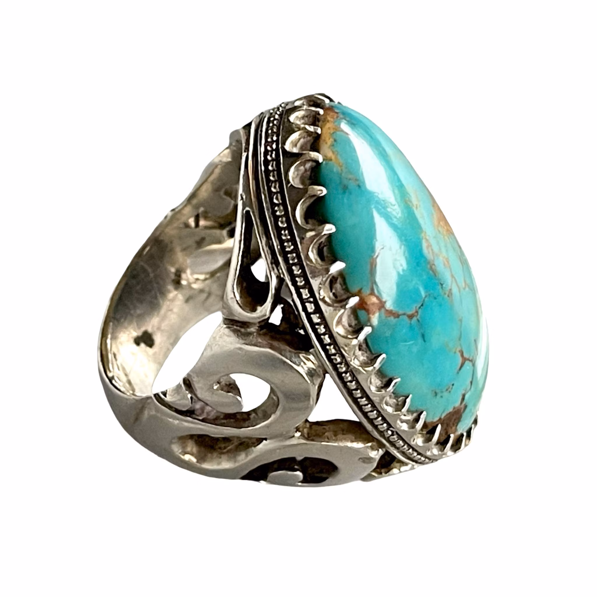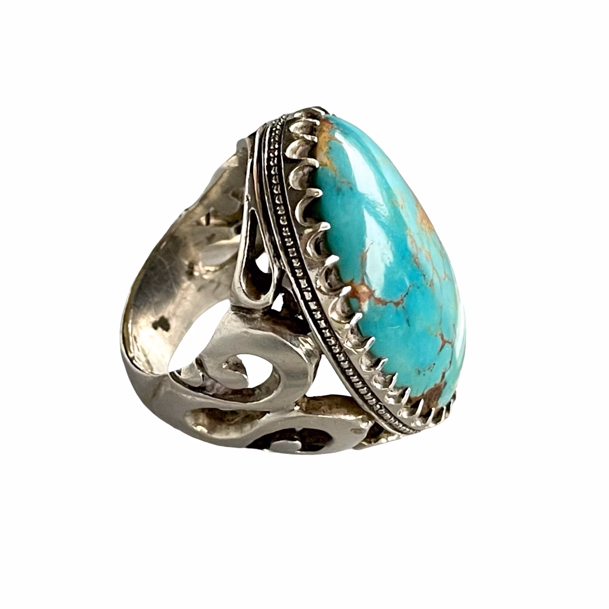 Kraftig och mycket imponerande vintage ring med naturlig, obehandlad Nishapuri turkos i en rikt ornamenterad infattning av sterling silver 925. Ringen är stämplad och hantverksmässigt utförd. Stenen är stor, cabochon slipad och har vacker naturlig matrix. Ett exklusivt statement smycke med tydlig närvaro och samlar värde.