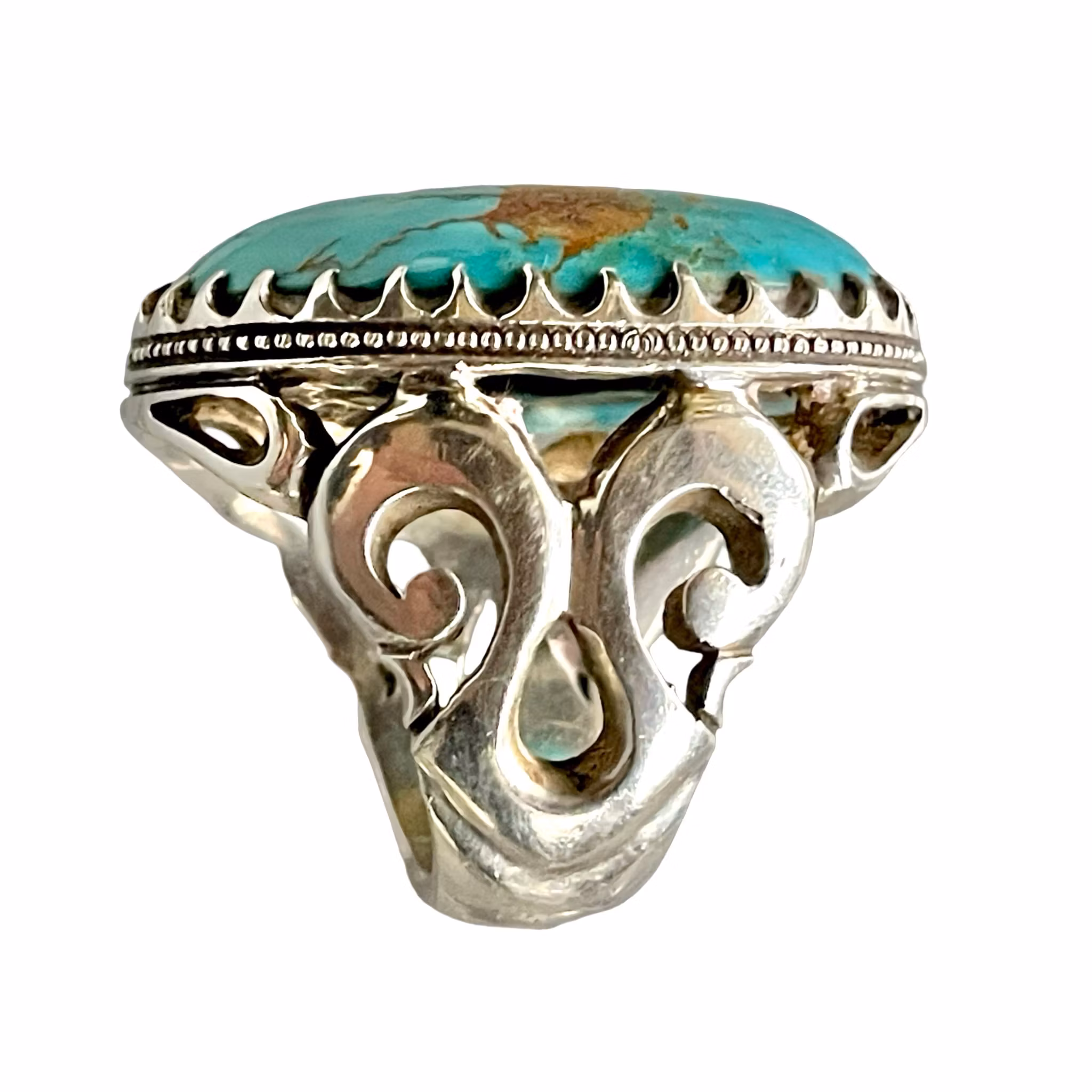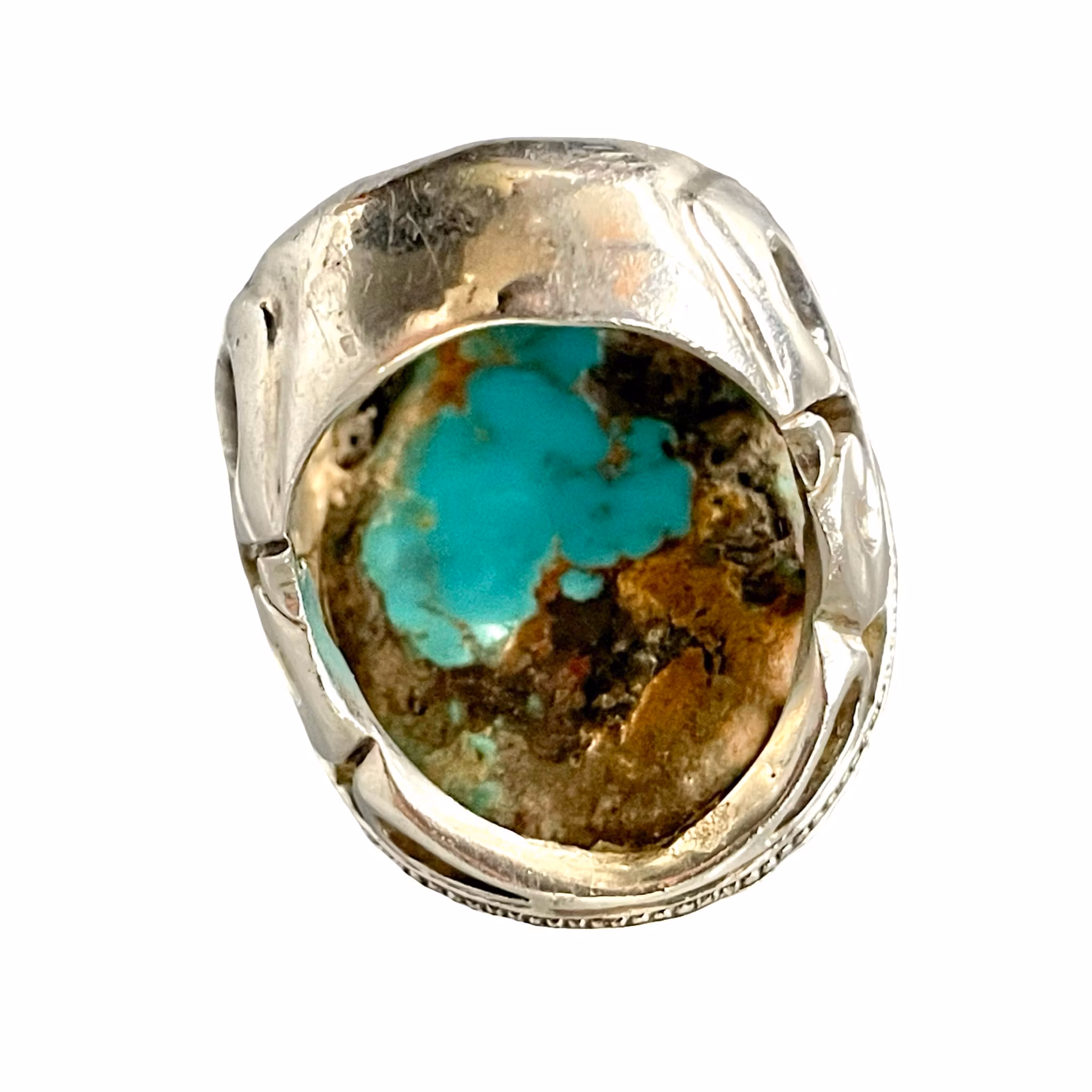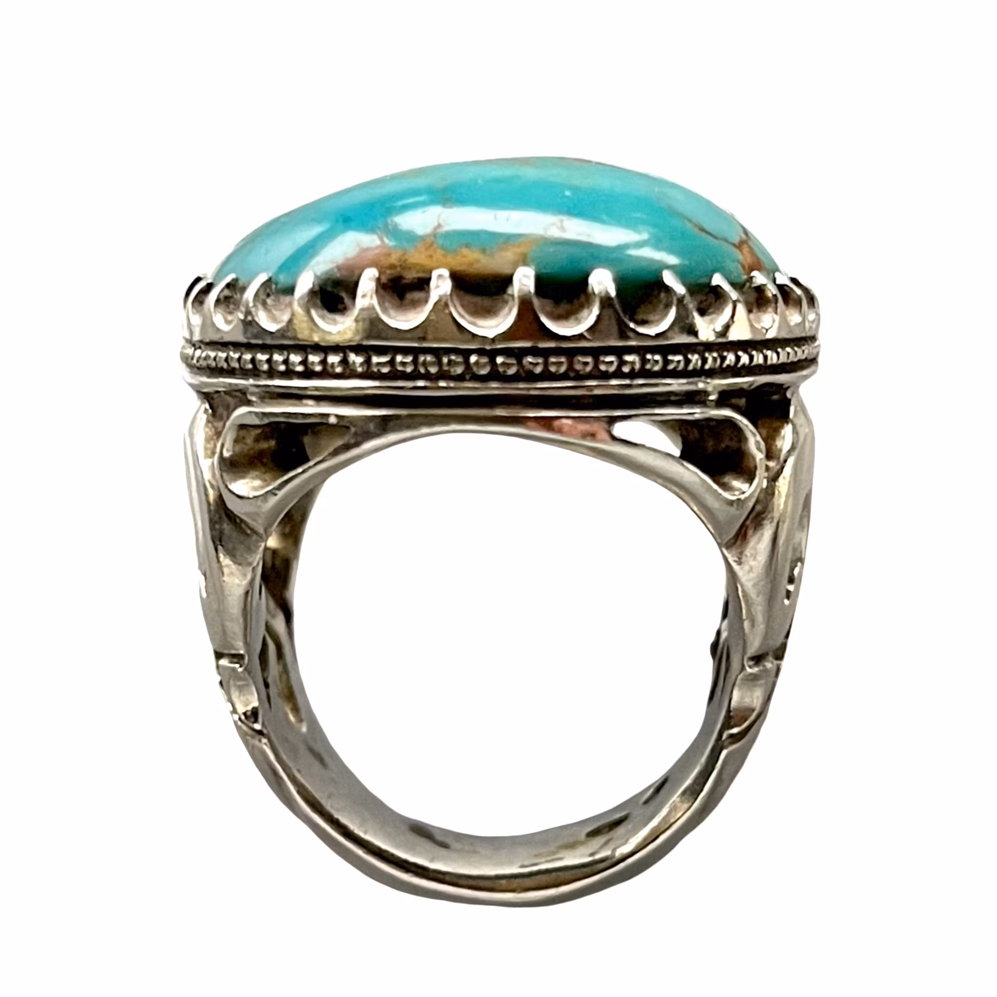 Kraftig och mycket imponerande vintage ring med naturlig, obehandlad Nishapuri turkos i en rikt ornamenterad infattning av sterling silver 925. Ringen är stämplad och hantverksmässigt utförd. Stenen är stor, cabochon slipad och har vacker naturlig matrix. Ett exklusivt statement smycke med tydlig närvaro och samlar värde.