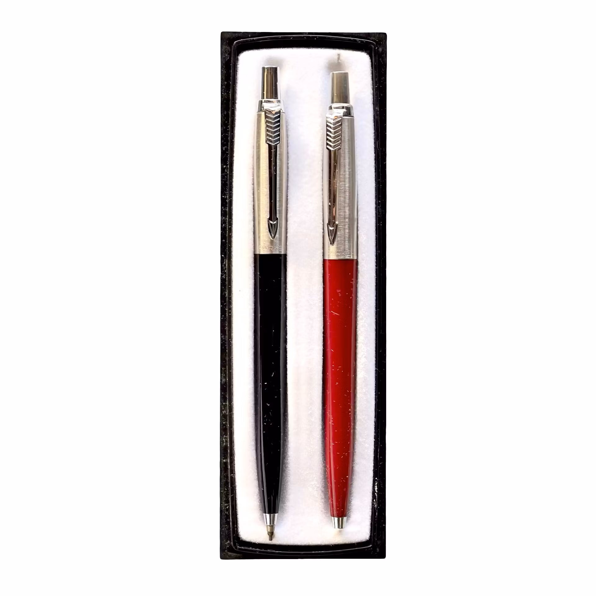 Ett klassiskt Parker set med två kulspetspennor i olika färger, levererade i originalförpackning. Pennorna har den välkända Parker-clipsdesignen och metallöverdelar.