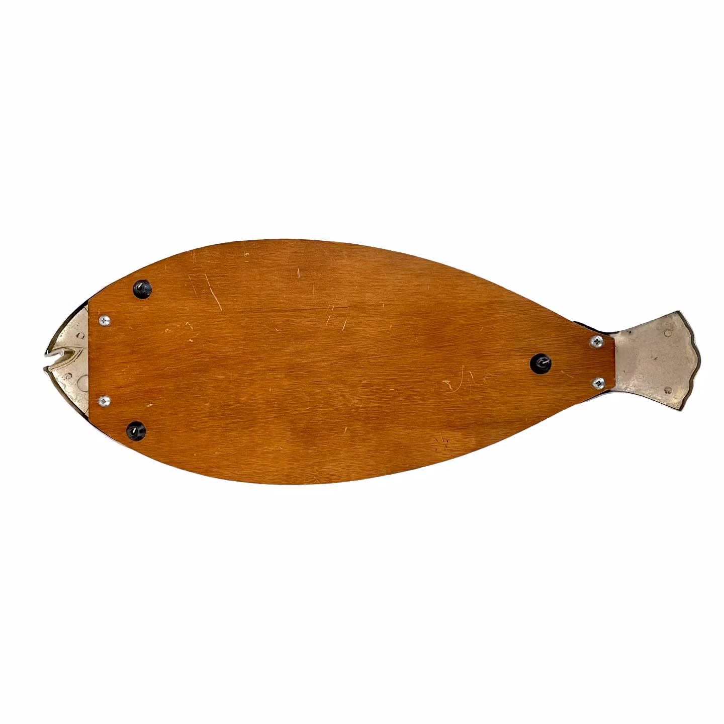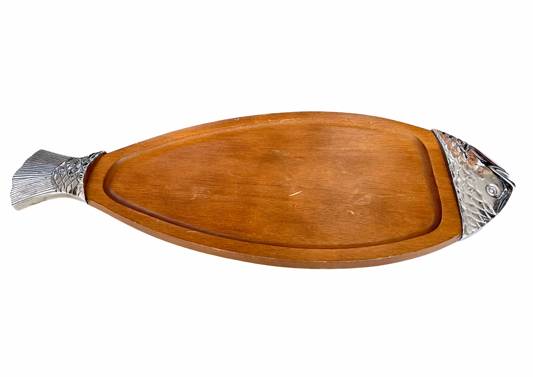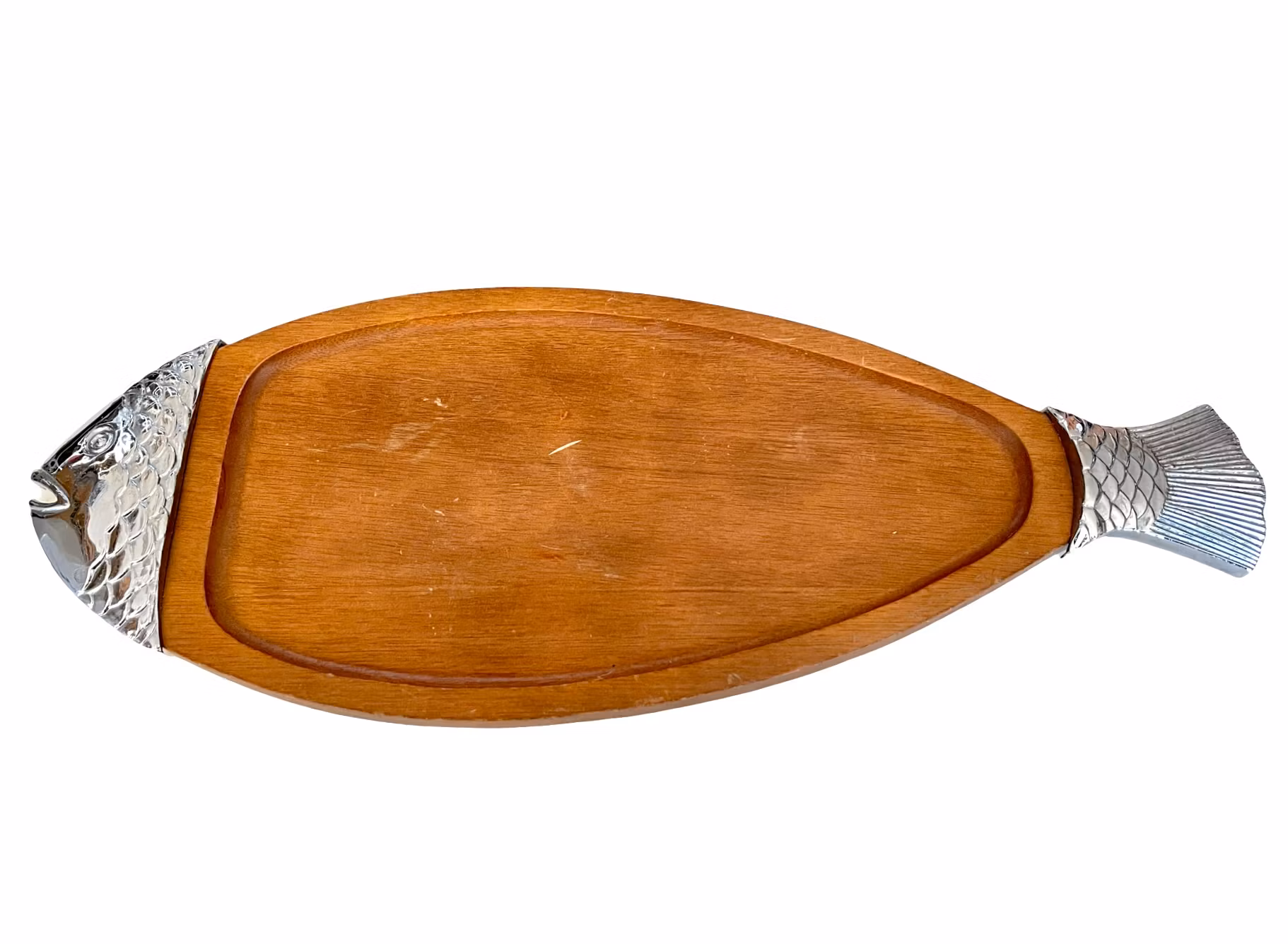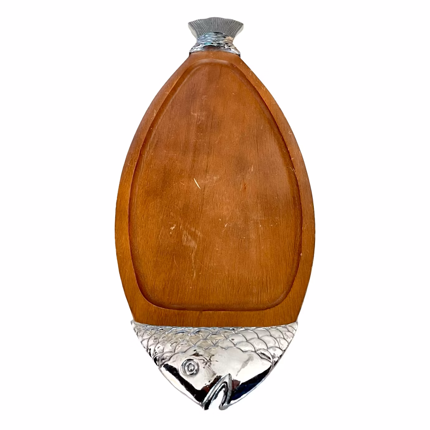 Elegant retroserveringsbricka i form av en fisk, tillverkad i trä med förnicklade metalländar utformade som fiskhuvud och stjärt.