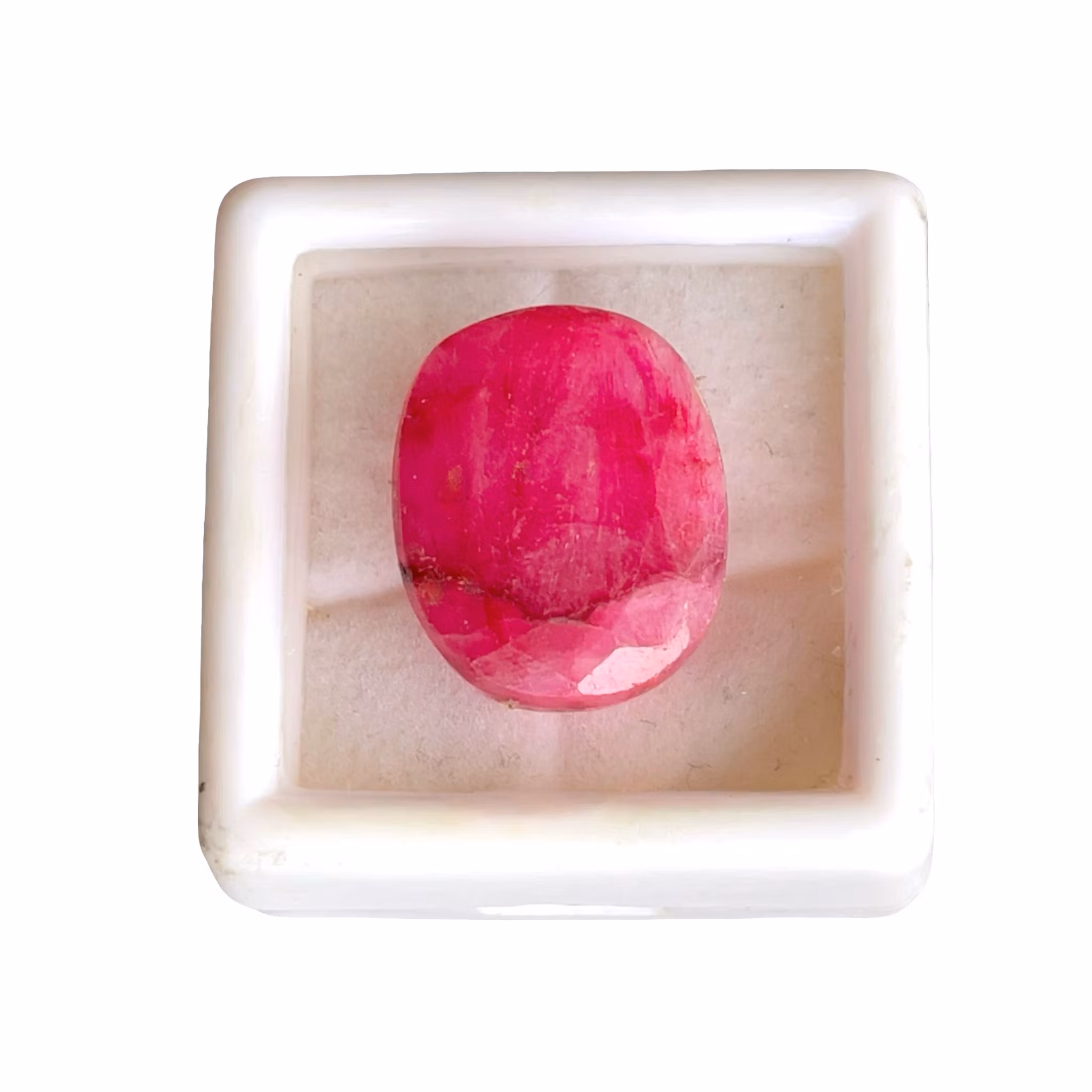 Här säljs en naturlig, äkta rubin med vikt 12,2 carat i oval fasetterad slipning. Färgen är röd till rosa röd. Stenen har synliga inneslutningar och interna strukturer, vilket är vanligt för naturliga rubiner i denna storlek och kvalitet.