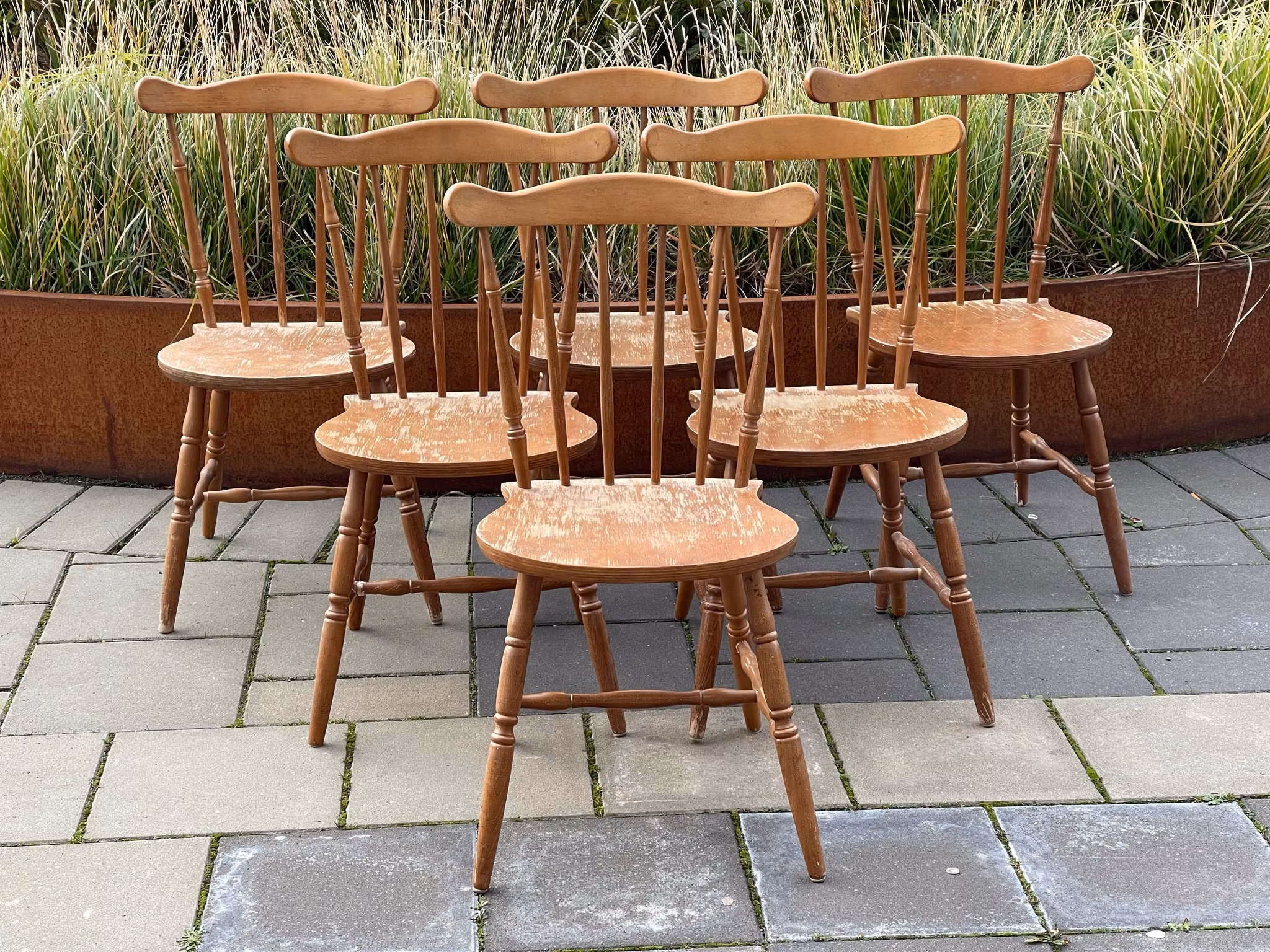 Ett charmigt set med sex klassiska svenska pinnstolar i trä, troligen tillverkade under 1940–50-talet.