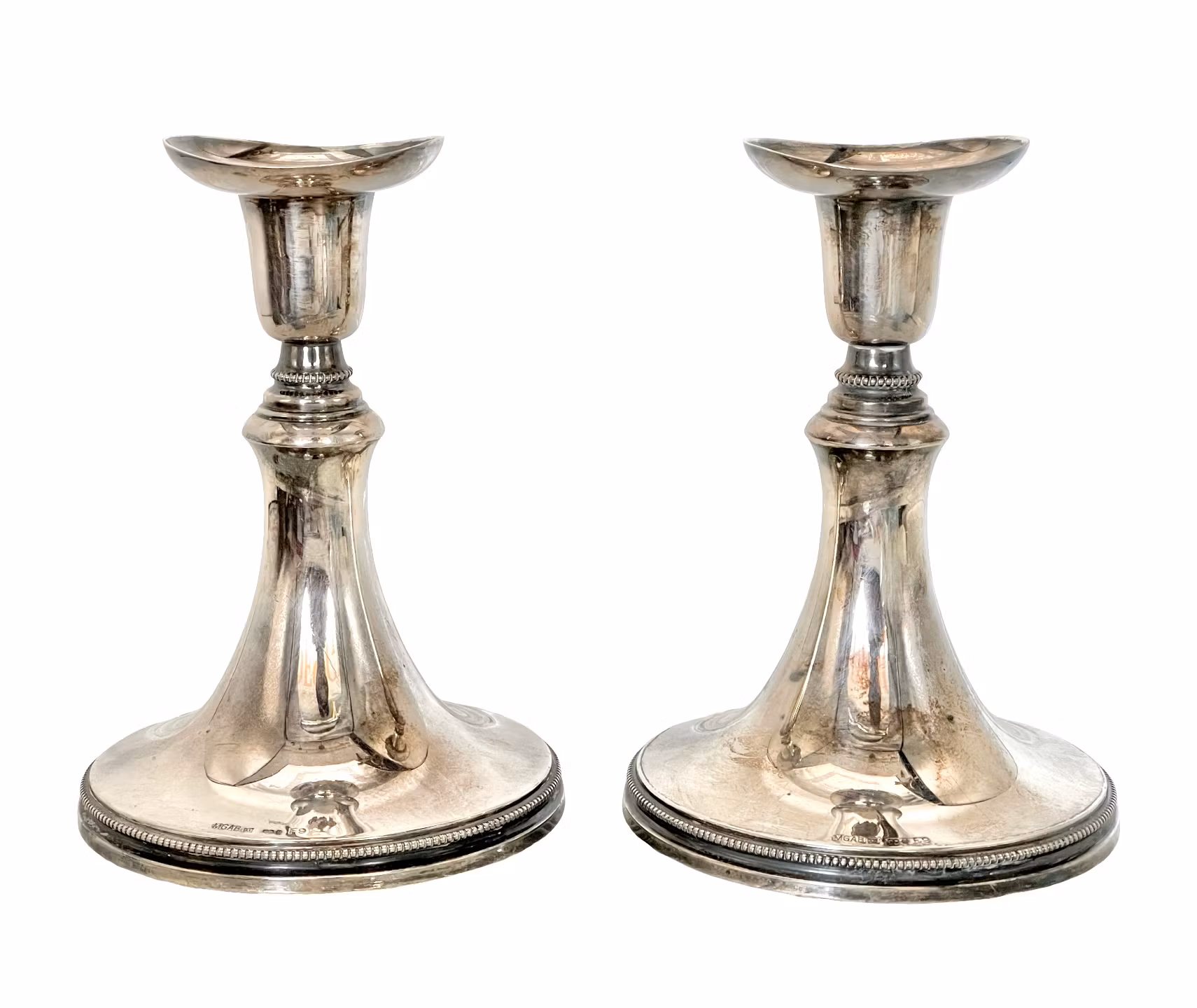 Eleganta ljusstakar i äkta silver tillverkade av Malmö Guldsmeds Aktiebolag (MGAB), Årsstämplade F9 = 1956. Klassisk svensk design med pärlstavsdekor runt foten och svagt klockformad kropp.