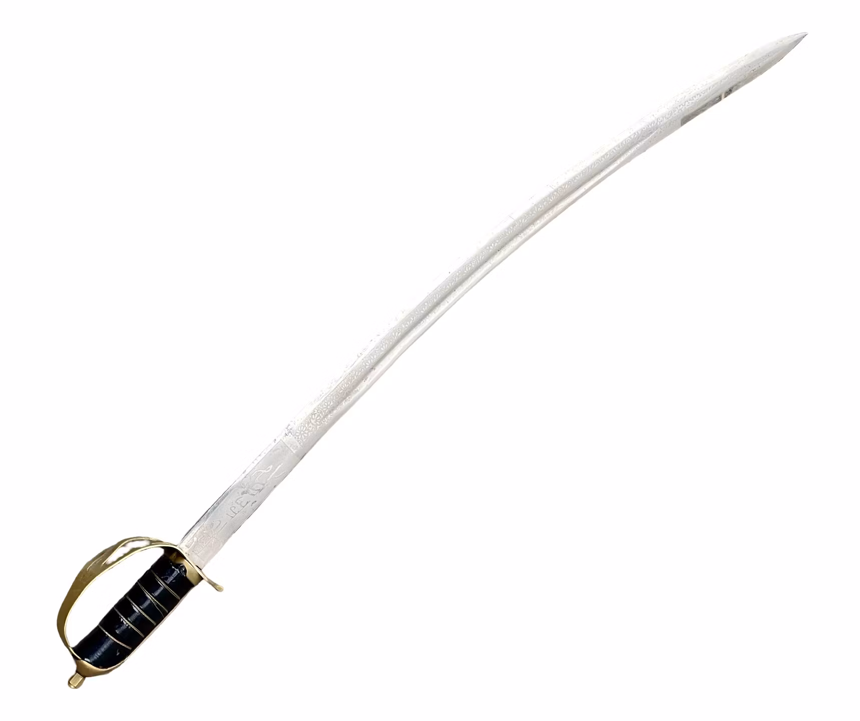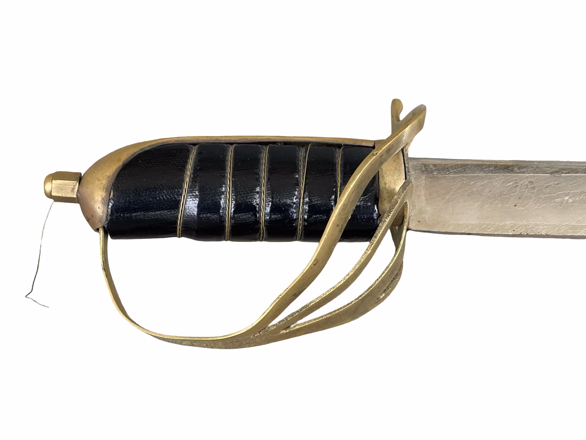 Ett Vintage sabelliknande prydnadsvärd med etsad dekor på båda sidor av klingan. Svärdet har ett svagt böjt, långt blad och ett grepp i svart lindat material samt ett handskydd i mässing. Klingan har flera områden med etsade blom och rankmotiv samt text/gravyr inslag. Detta är ett barn eller dekorativt, prydnadsvärd, tillverkat för ceremoniellt bruk eller som väggdekoration.