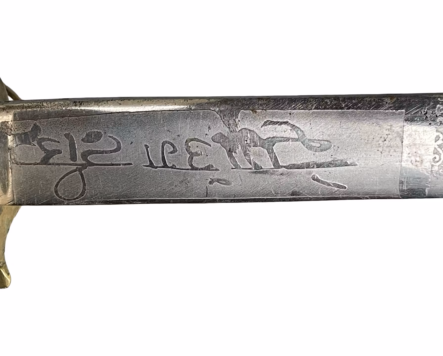 Vintage dekorativt sabelliknande svärd - etsad klinga - mässingskavel