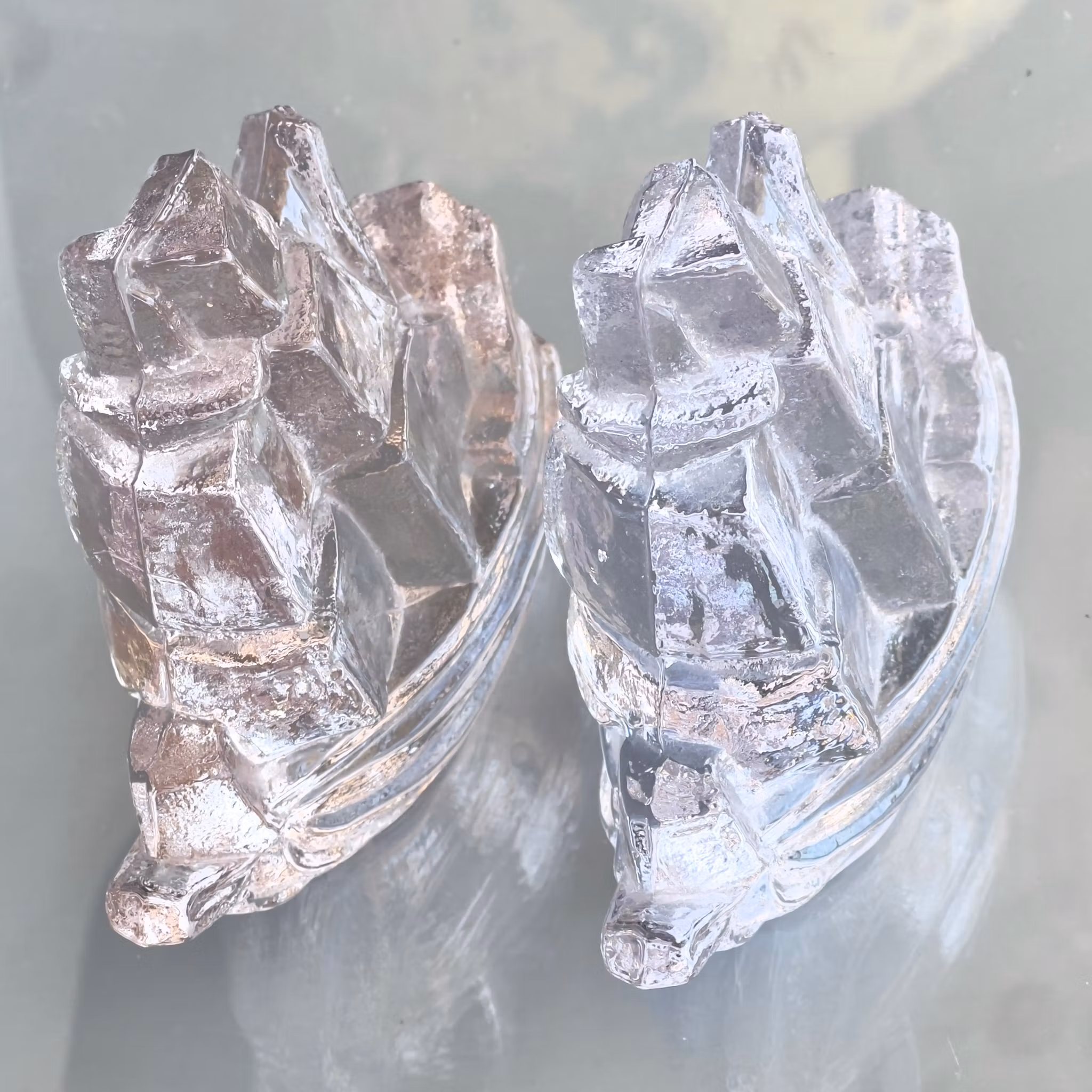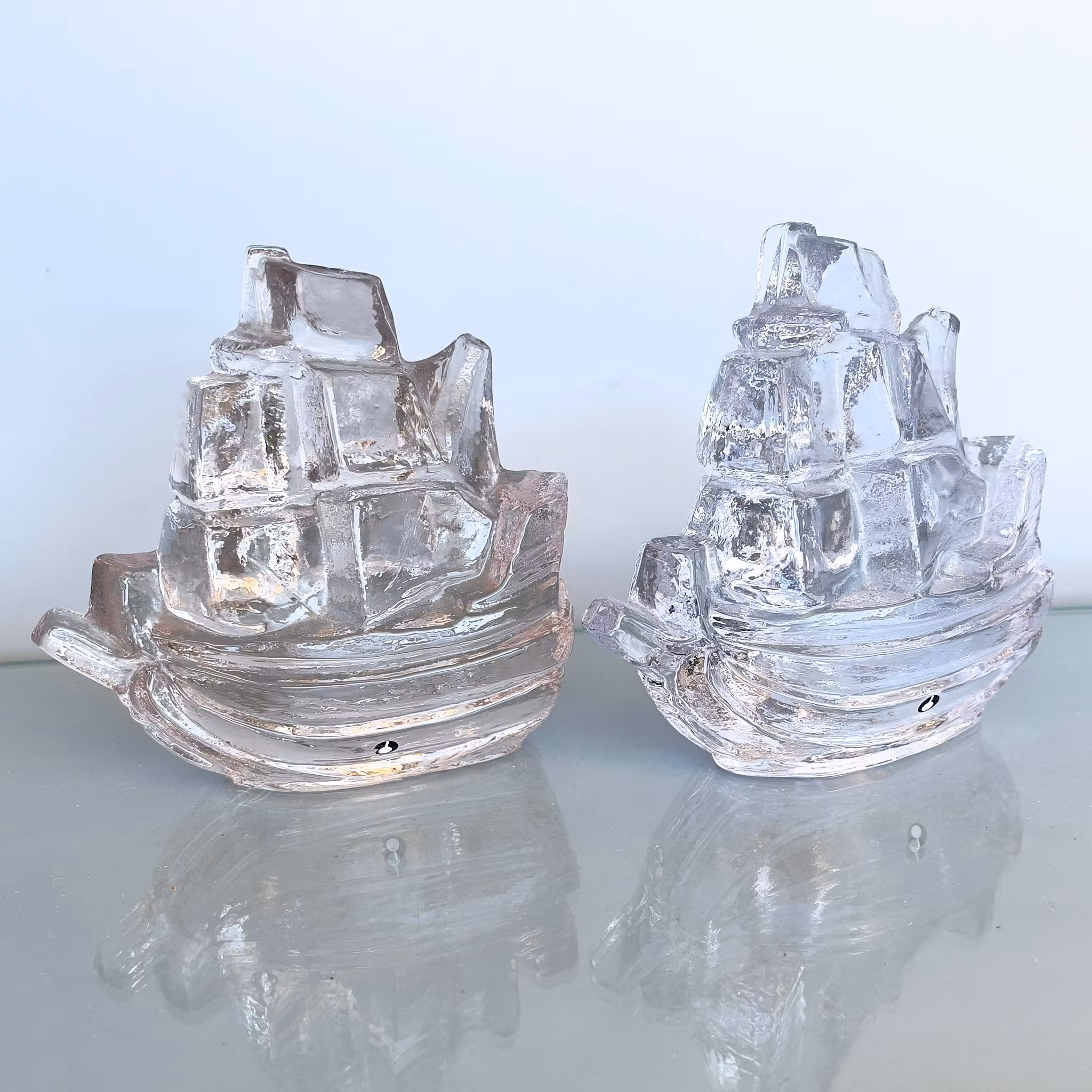 Säljer två dekorativa glasfartyg designade av Uno Westerberg för Pukeberg Glasbruk. Klassiska svenska designföremål i massiv glas med stiliserad form av segelfartyg. Mycket fina samlarobjekt och uppskattade inom svensk glaskonst.