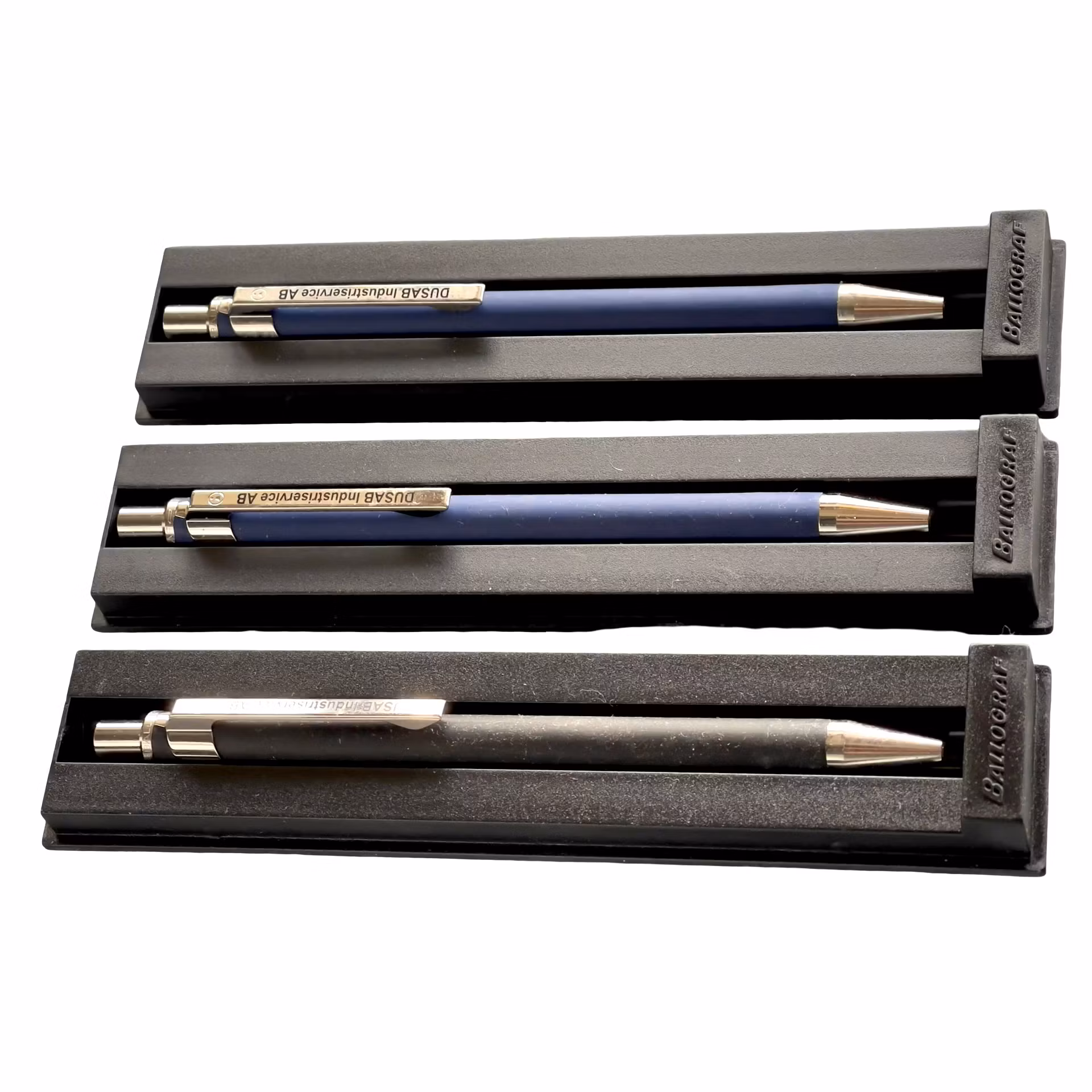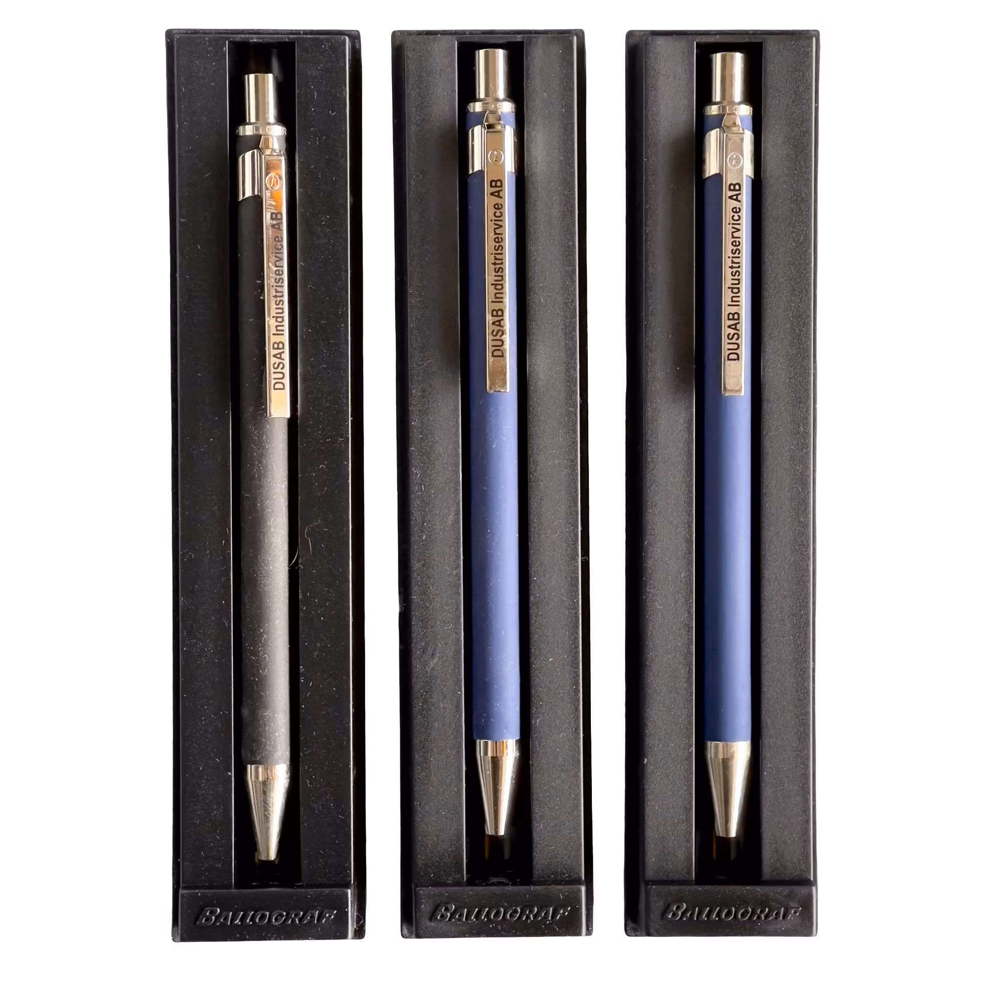 Tre original Ballograf pennor, reklam eller företagsutgåvor från DUSAB Industriservice AB. Samtliga ligger i sina originalaskar från Ballograf. Pennorna är av den äldre typen som inte längre tillverkas.