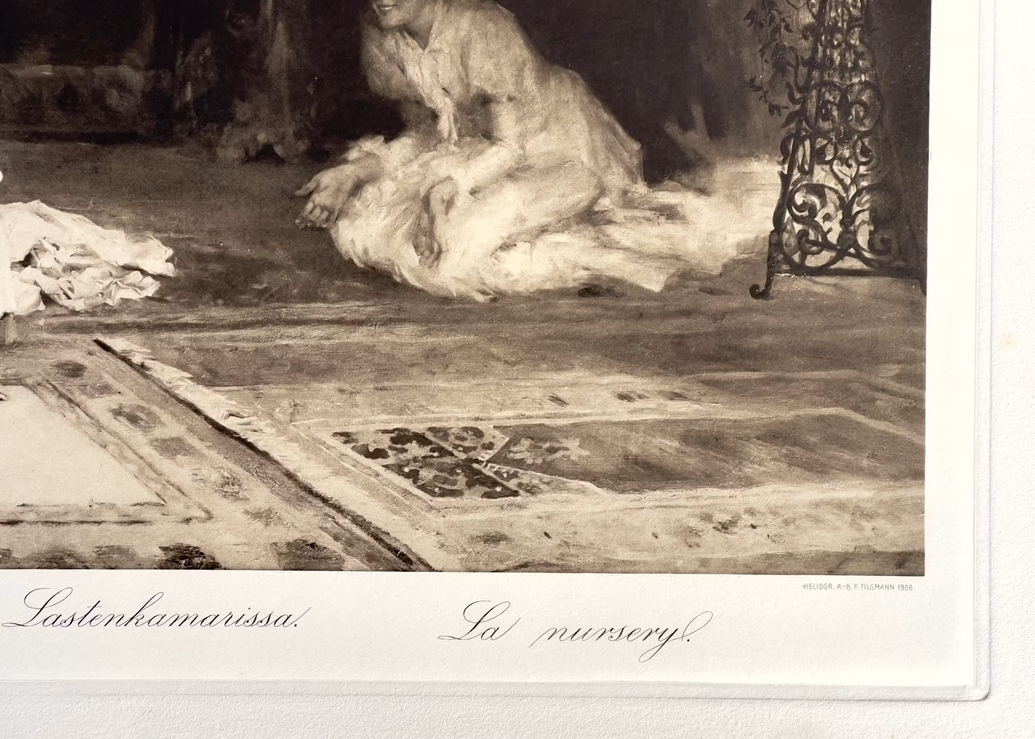 Sällsynt och vacker heliogravyr från 1906 efter målningen I barnkammaren av den berömda finländska konstnären Albert Edelfelt (1854-1905). Trycket är utfört av A. B. F. Tilgmann, Helsingfors, känt för sin höga tryckkvalitet vid sekelskiftet.
