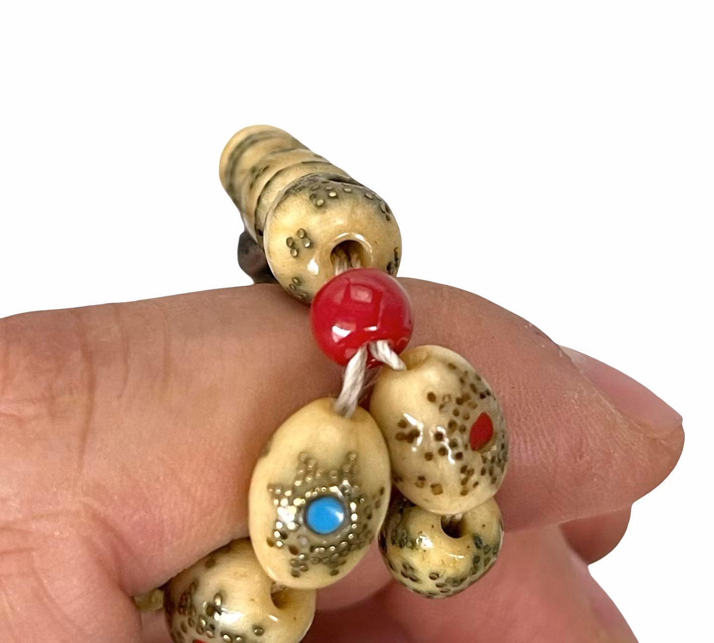 Radbandet är handgjort i ben, med varje pärla rikt dekorerad med små metallinläggningar och infattade röda och turkosblå stenar.