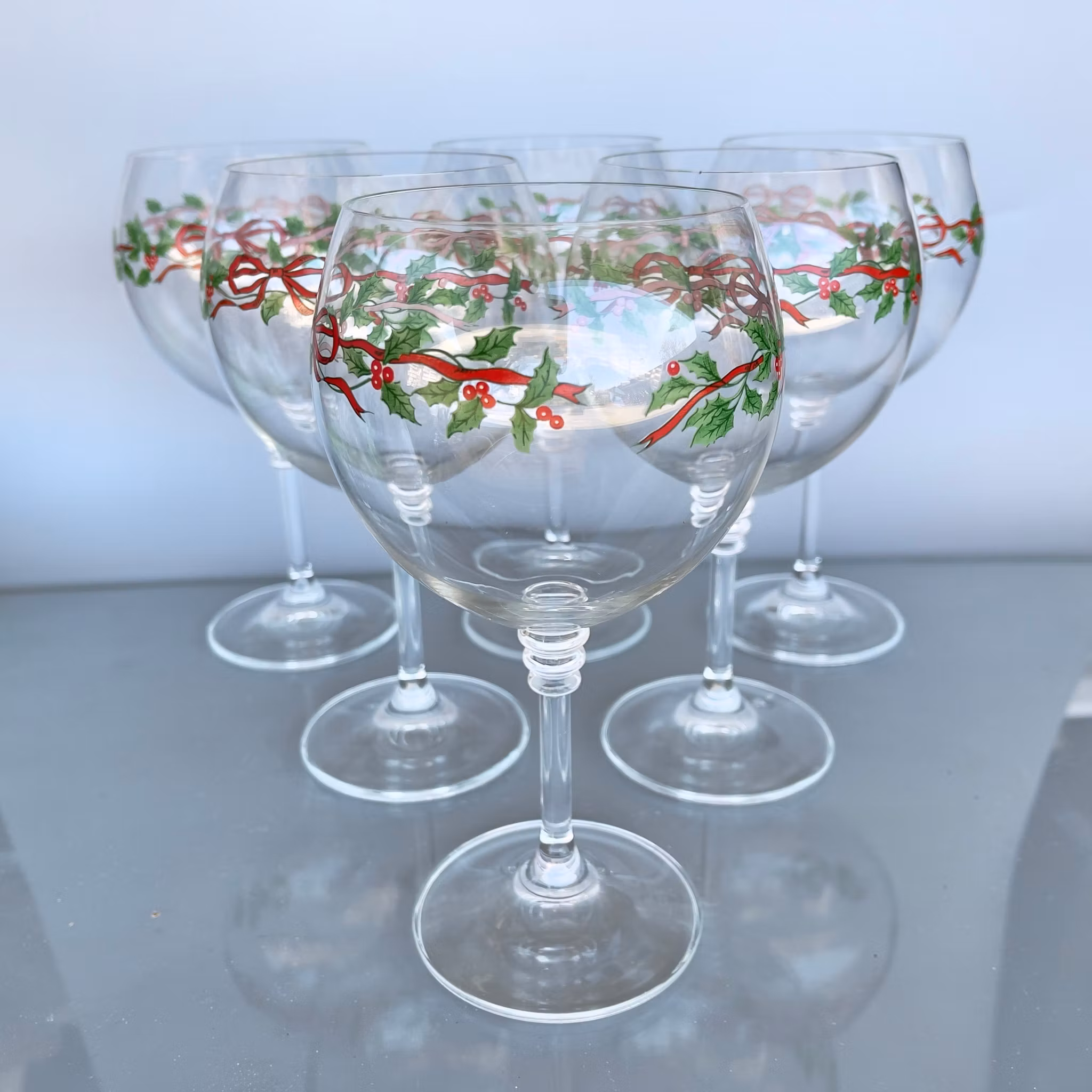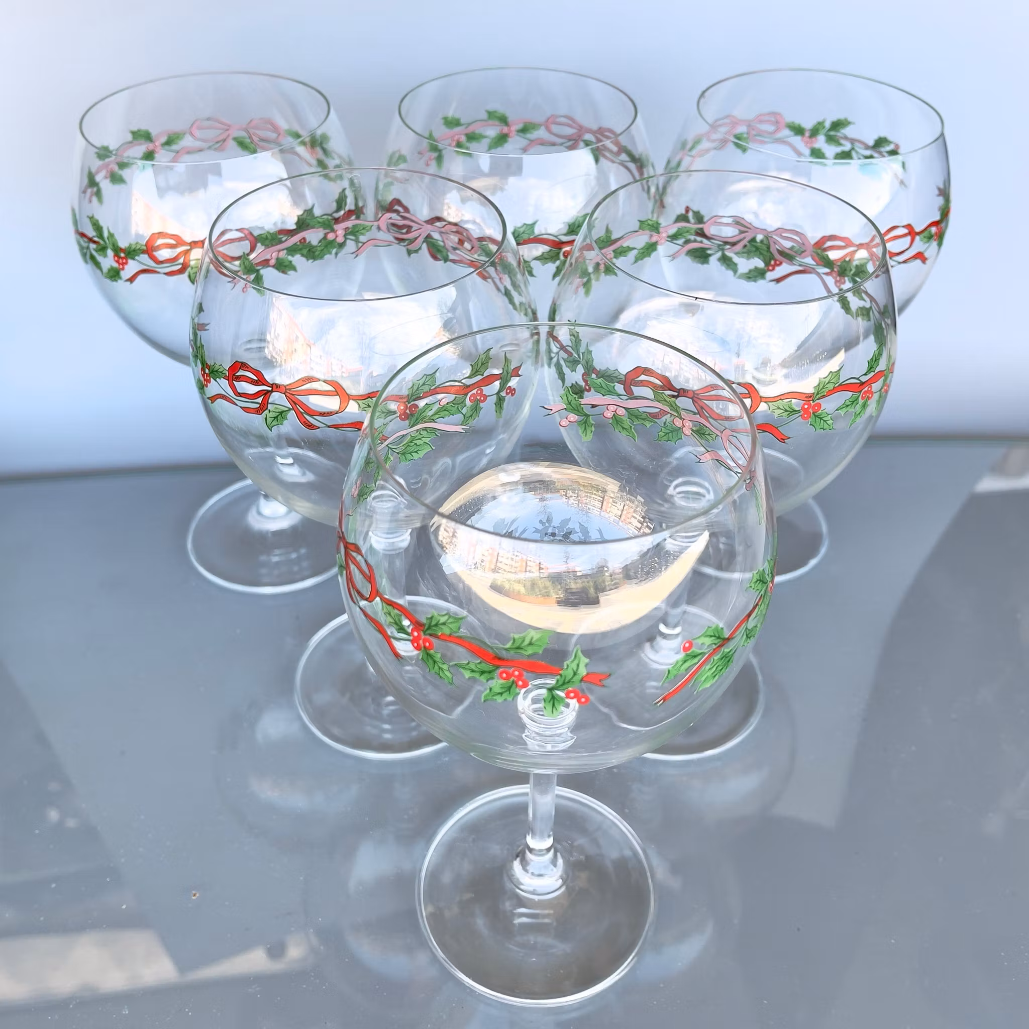 Säljer ett vackert set om 6 glas på fot med dekorativt julmotiv runt kupan i form av järnek, röda bär och rosetter. Stilfulla och tidlösa glas som passar perfekt till jul dukningen, glögg, vin, dessert eller festliga drinkar.