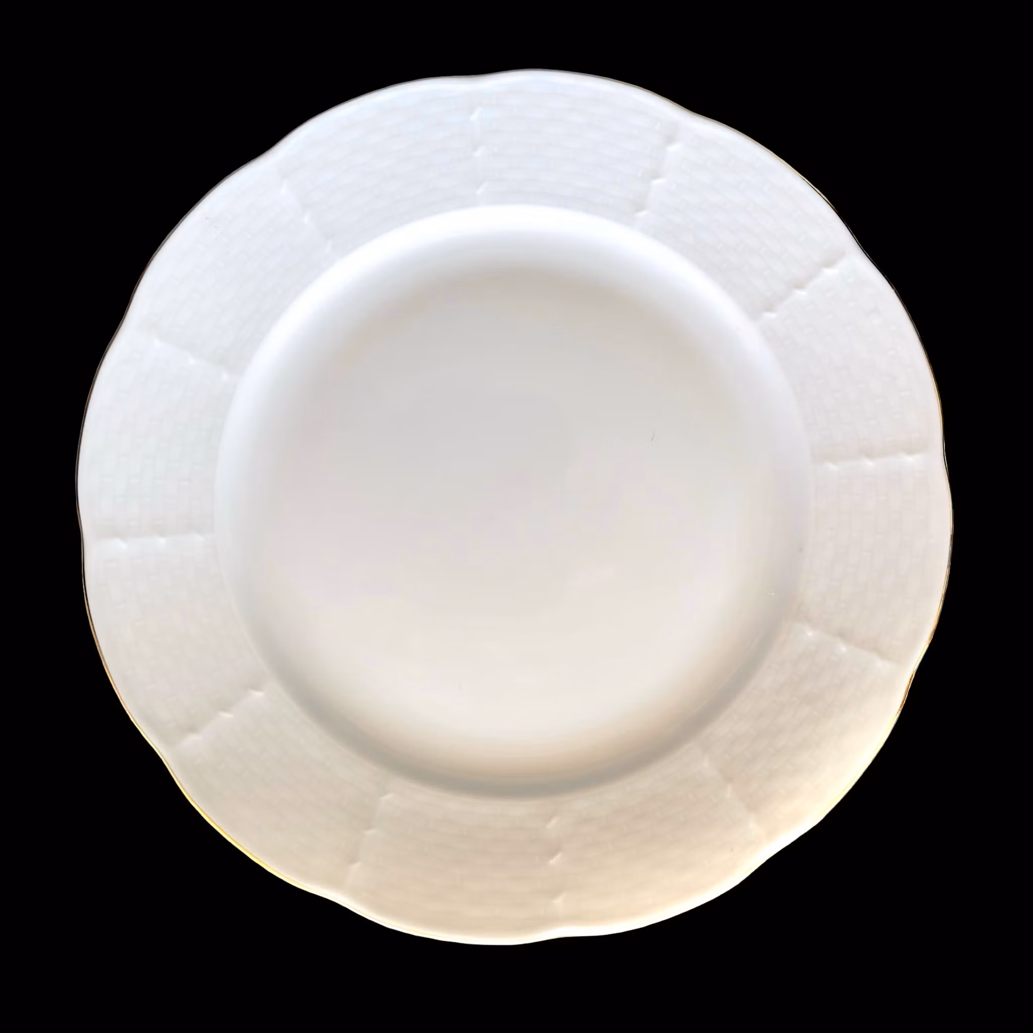 Säljer ett vackert set om 6 assietter/förrätts tallrikar från Thun, Czechoslovakia. Klassisk tidlös design i vitt porslin med diskret relief mönster och fin guldkant. Passar både till vardag, fika och festdukning.