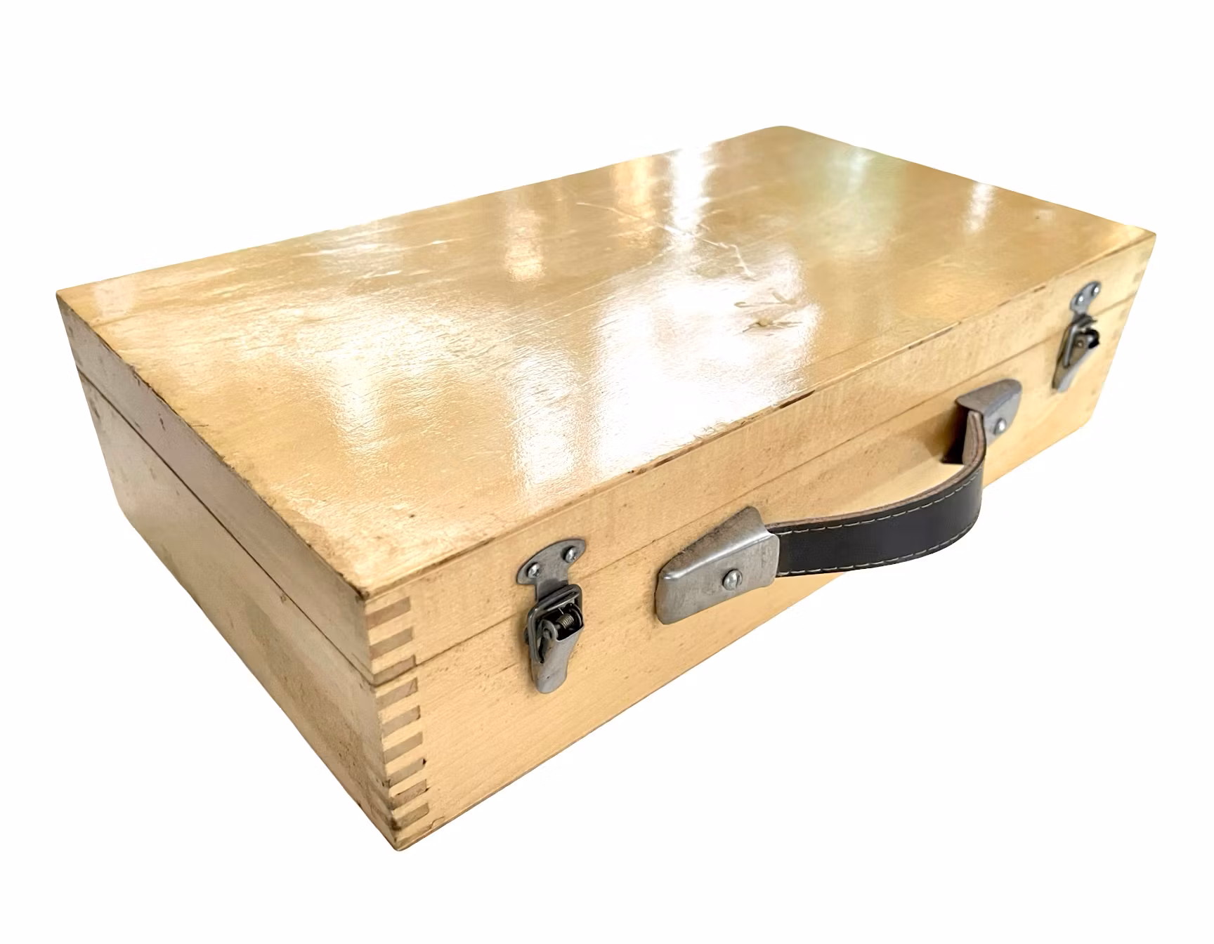 Kloten är i mycket gott skick, knappt använda. Trälådan med visst yttre slitage (se bilder). Spännen och handtag hela.