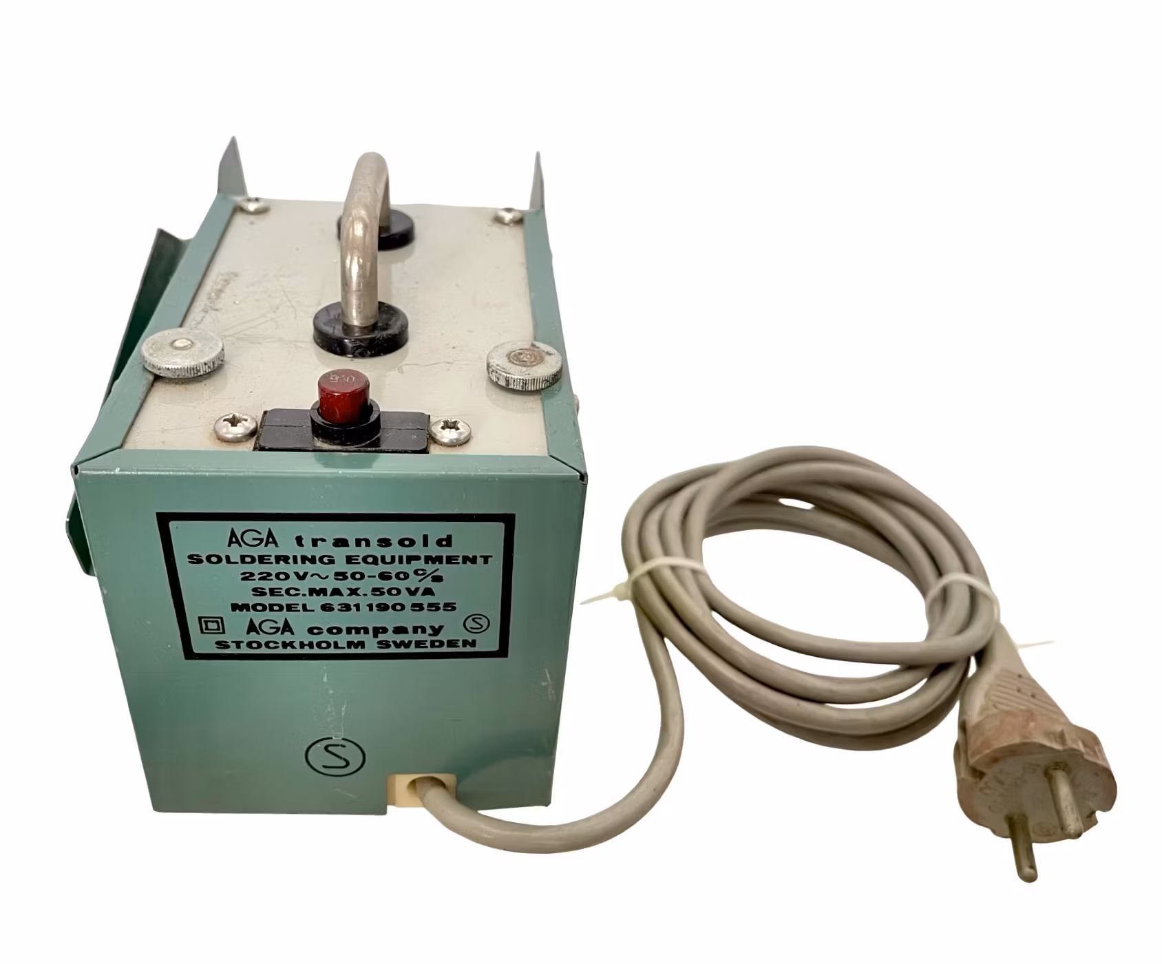 Professionell lödutrustning från AGA Company, Stockholm, troligen tillverkad under 1960–1970-talet. Robust industriell modell med kraftig transformator och flera utgångar för olika spänningar. Utrustad med original fjäderställ för lödkolv och metallfot med tennskål.
