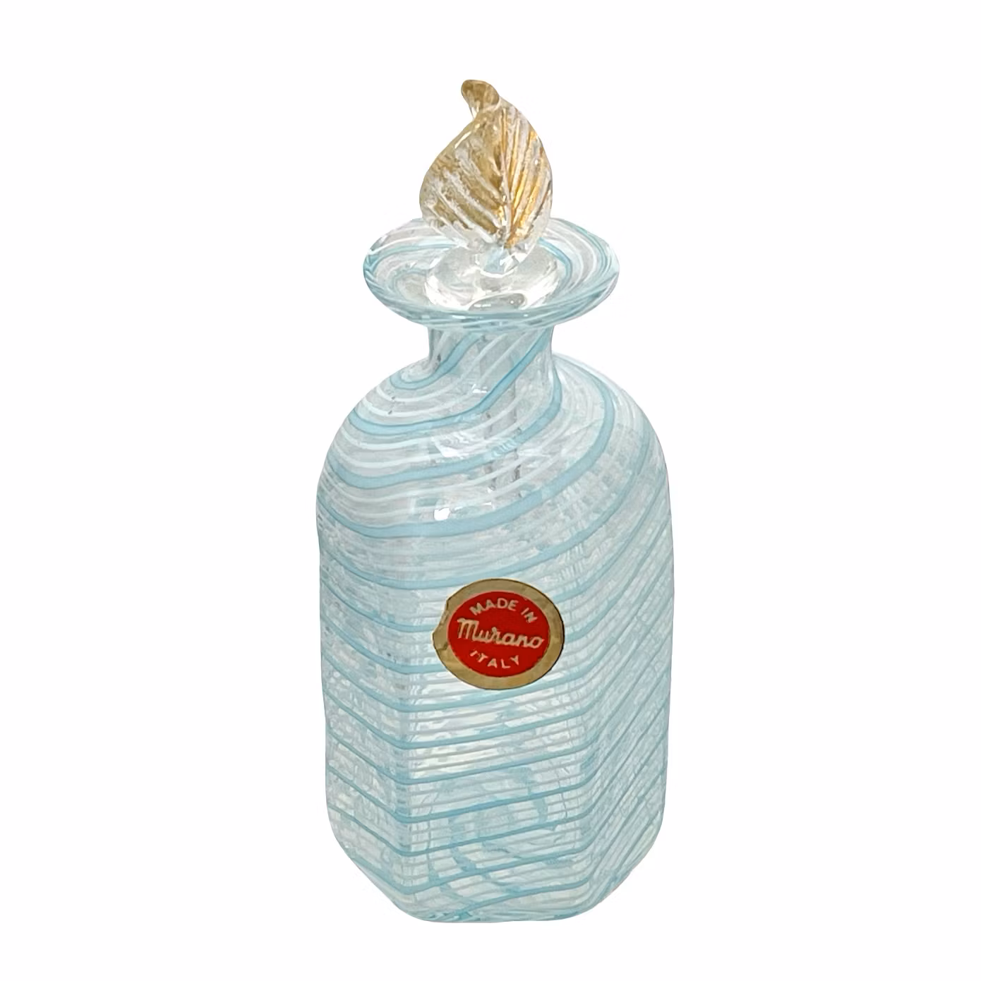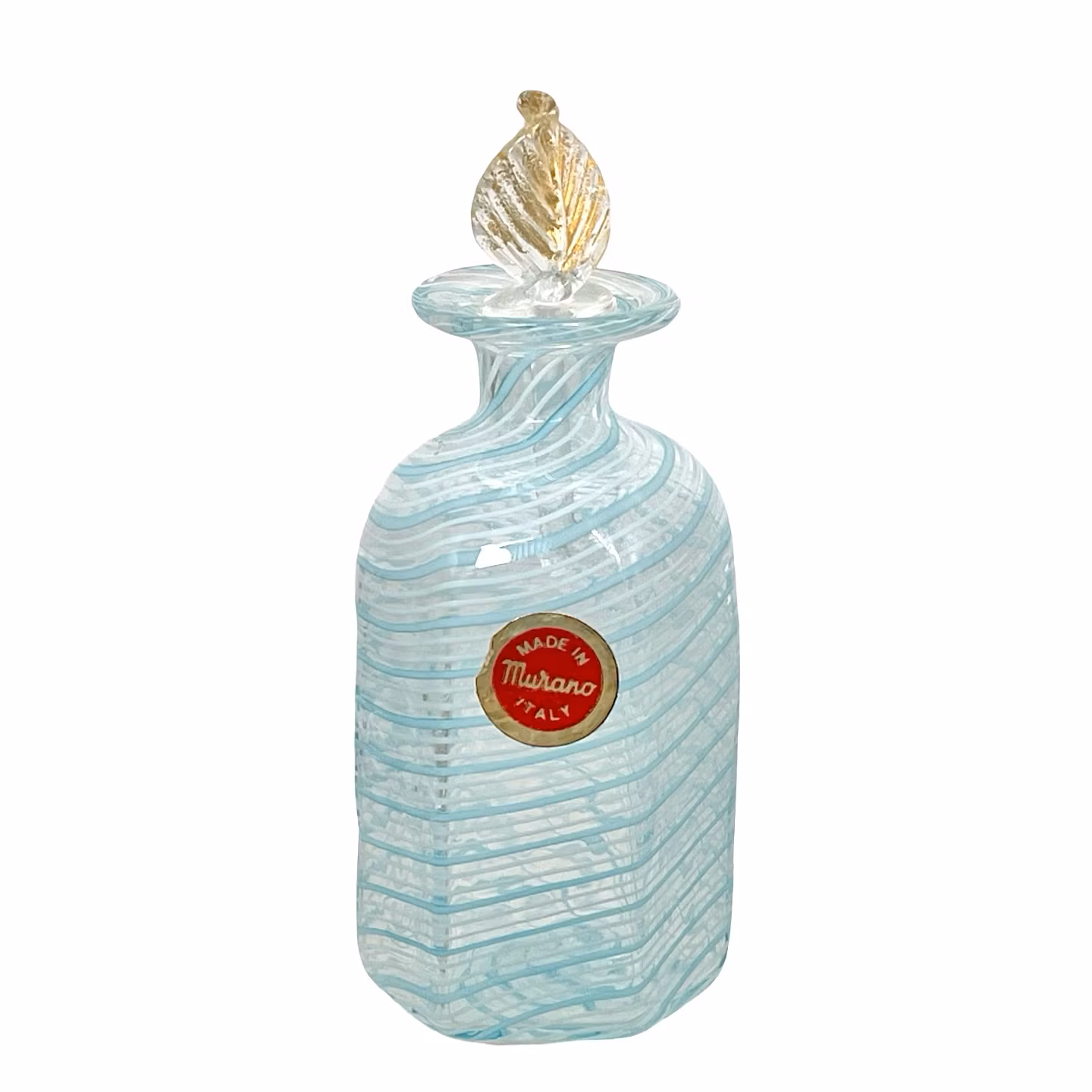 Elegant parfymflaska i äkta Murano glas, handgjord i Italien. Flaskan är utförd i klassisk filigranateknik med spiral formade turkosa och vita glaslinjer som ger ett levande och exklusivt uttryck.