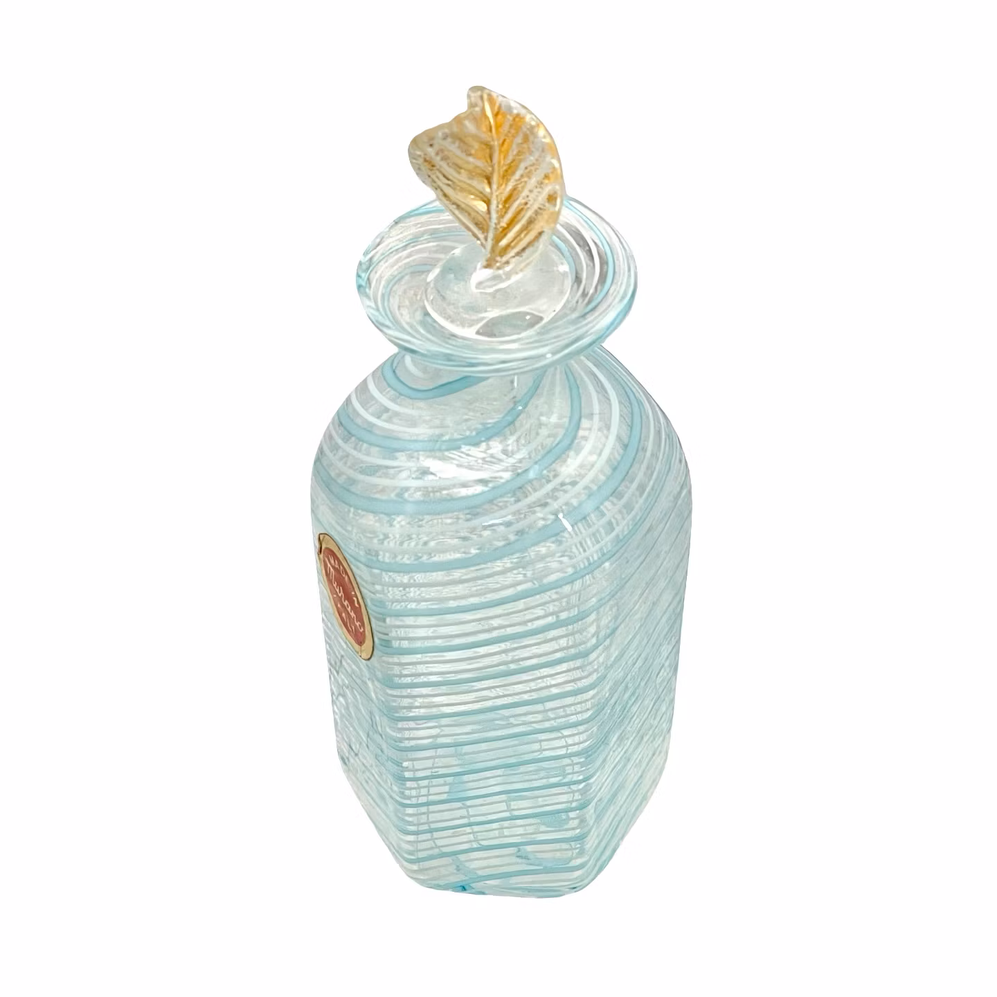 Det tillhörande glaslocket är dekorerat med ett stiliserat blad i guldton, vilket förstärker känslan av lyx. En autentisk Murano pjäs med original etikett - perfekt som samlar föremål, present eller dekorativ detalj.