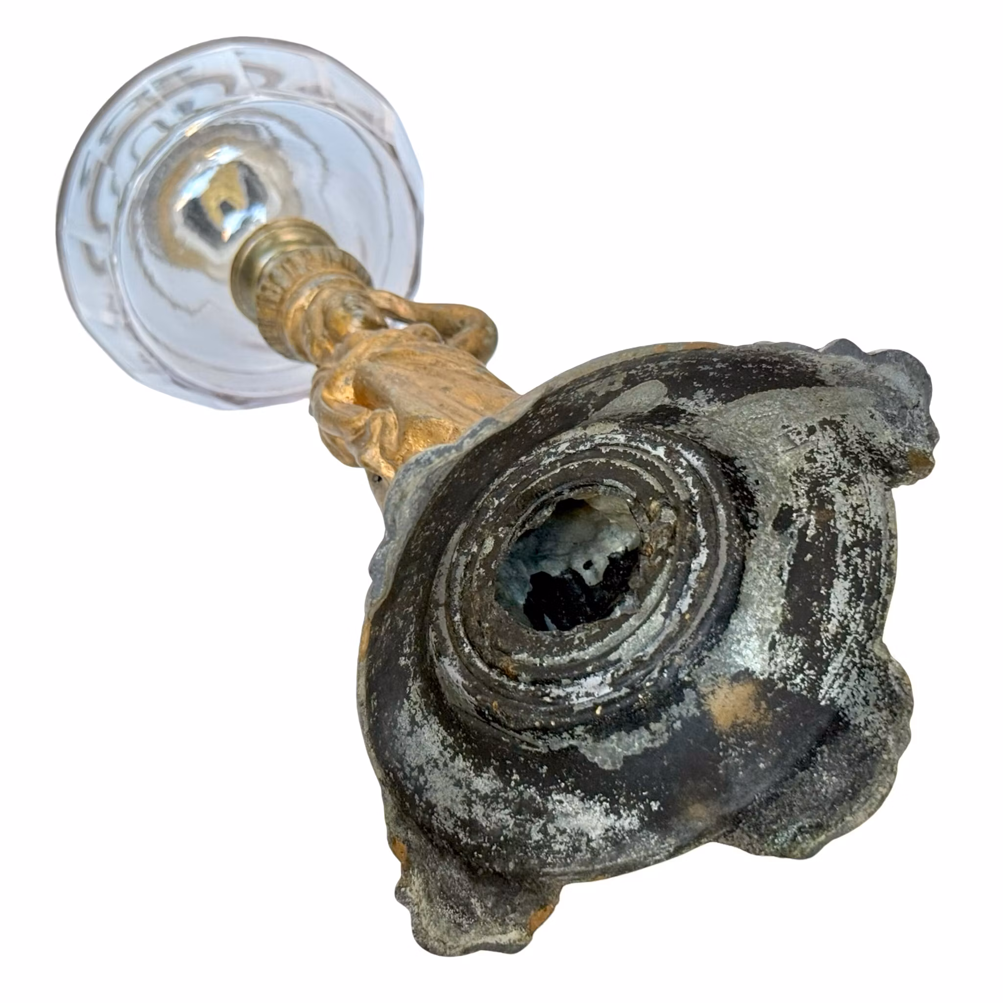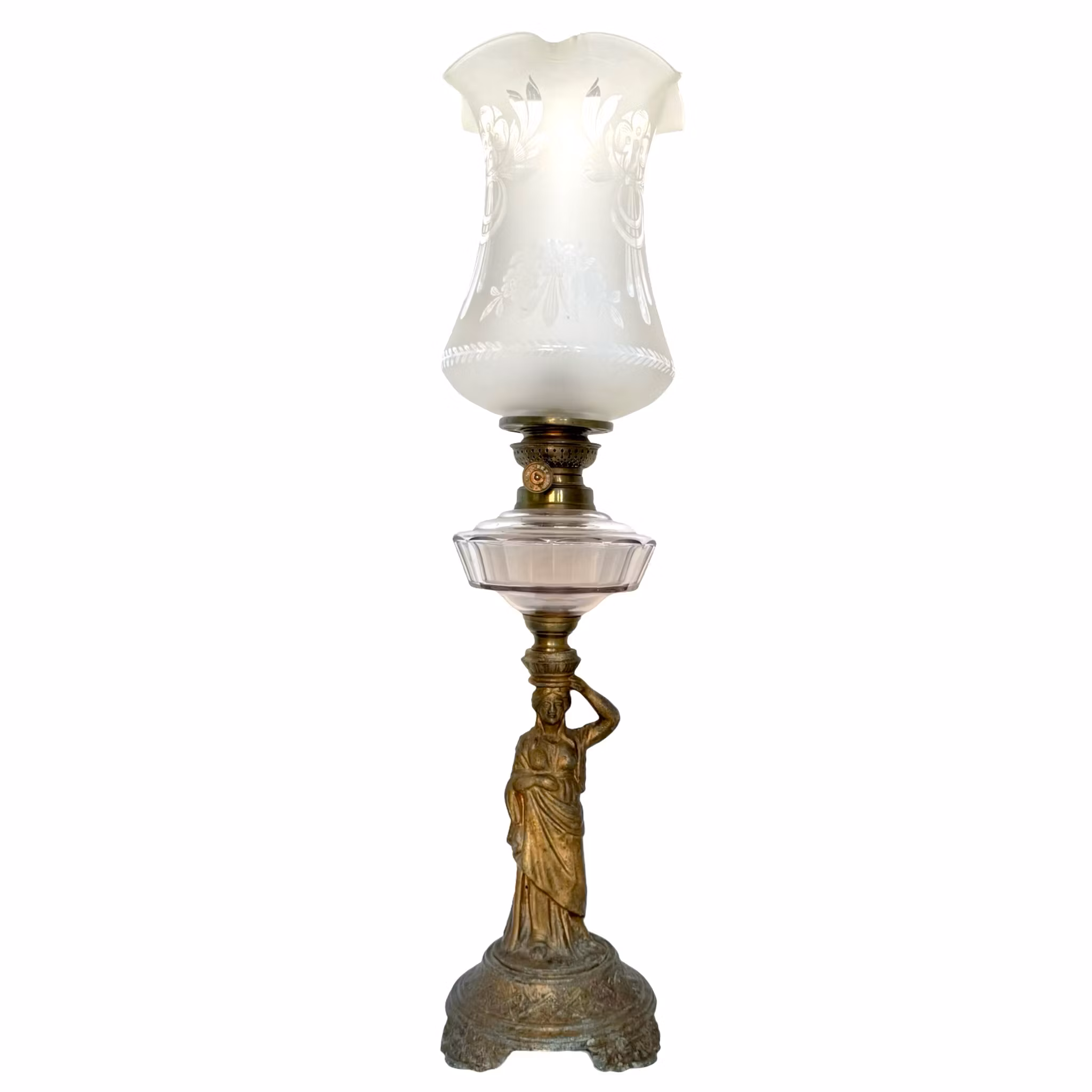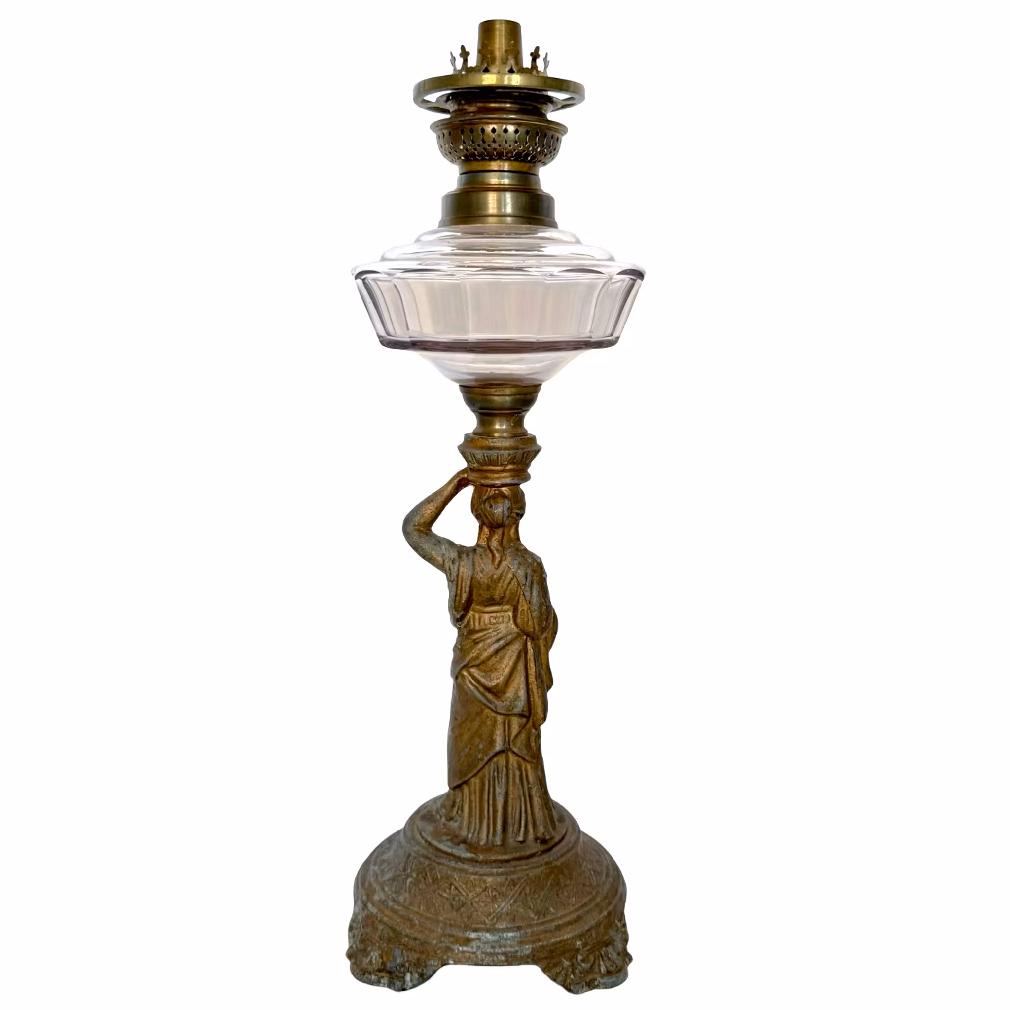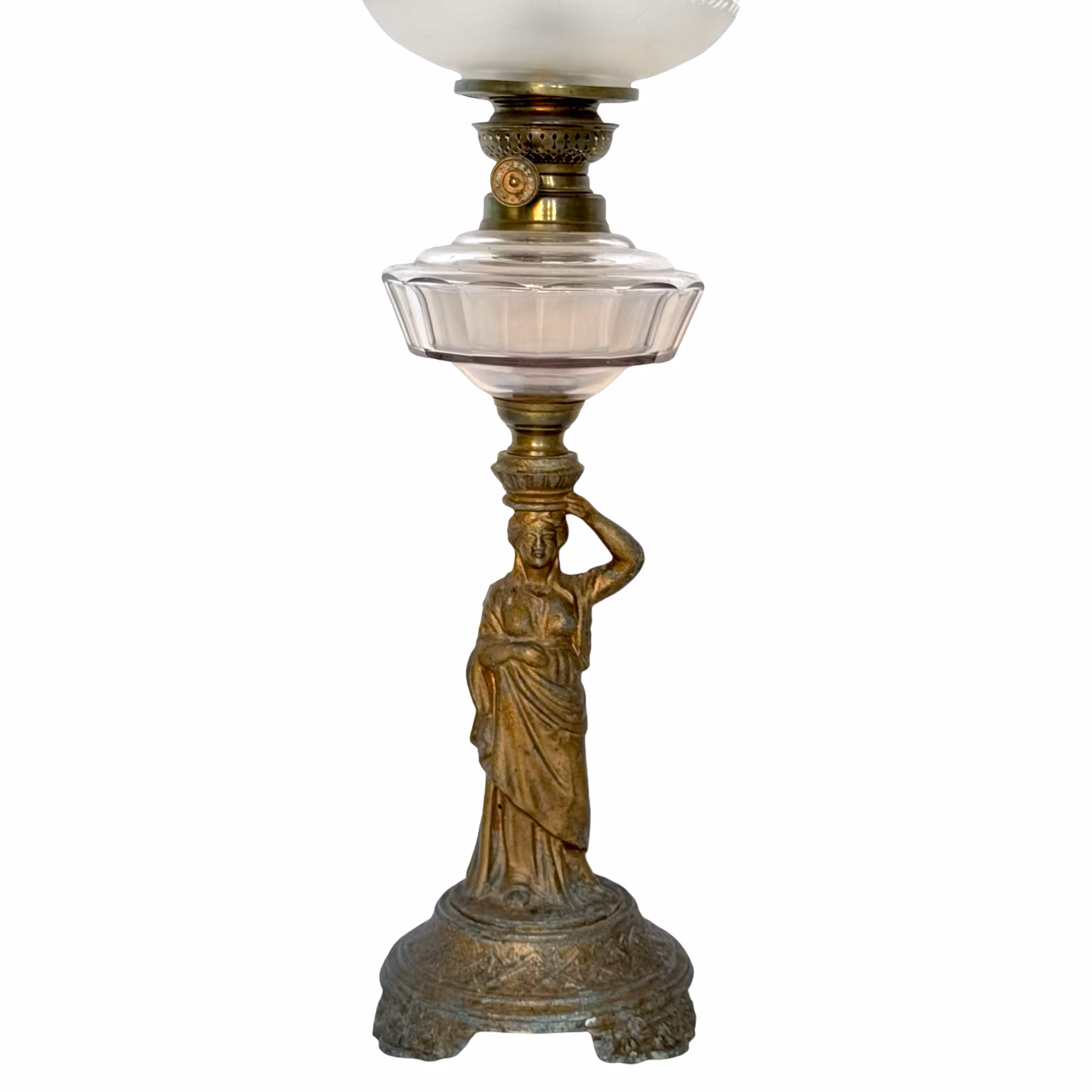 Antik Bordsfotogenlampa, zink, i form av stående kvinna