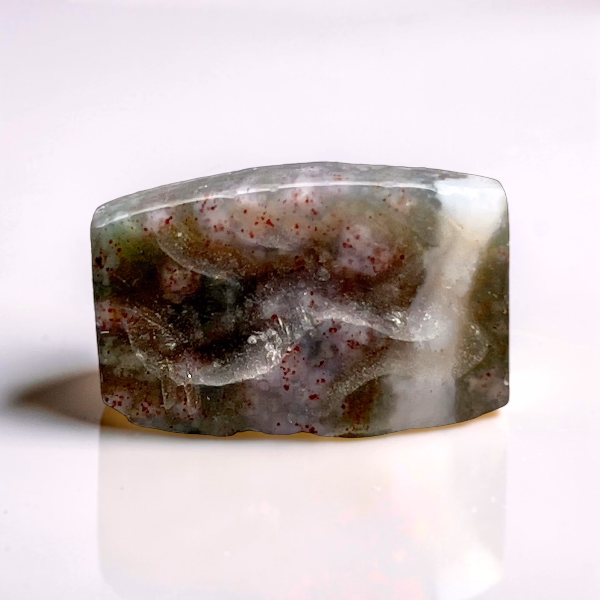 Unik, Antik hand bearbetad sten i agat med naturliga färgskiftningar och röda mineral inklusioner. Stenen är polerad och formad i en klassisk orientalisk stil som ofta förekommer på sigill och samlar stenar från Mellanöstern/Indien/Centralasien.