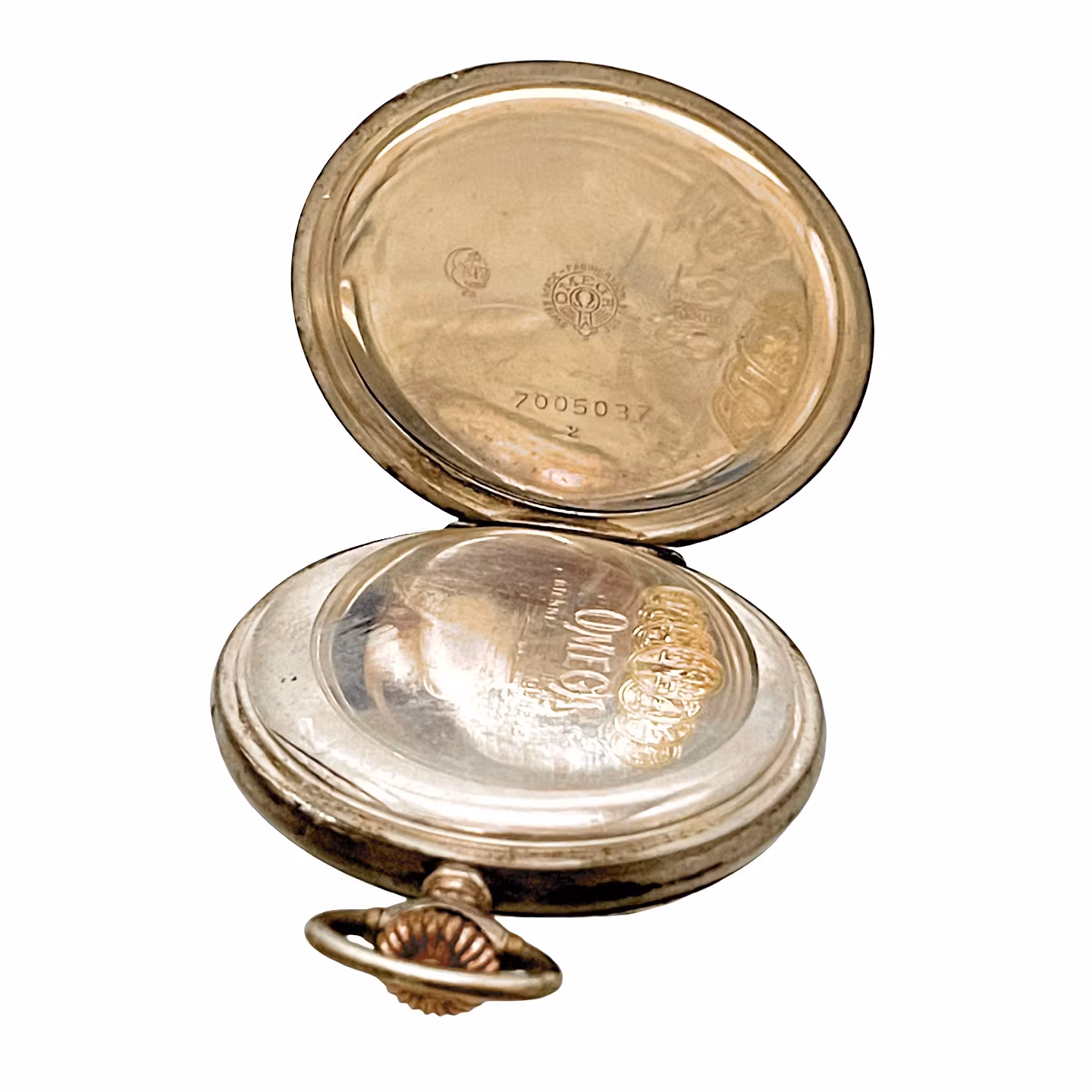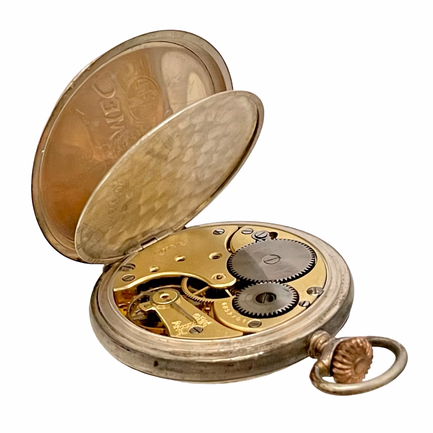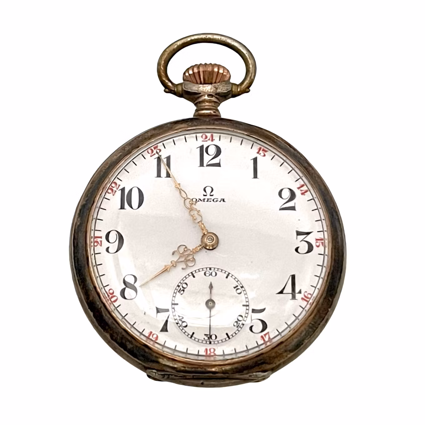 Ett vackert antikt fickur från Omega, tillverkat i Schweiz under tidigt 1900-tal. Uret är komplett med sitt ursprungliga ornamentala metallställ, vilket gör det till ett elegant bordsur. Mekanismen fungerar mekaniskt (manuellt uppdrag).