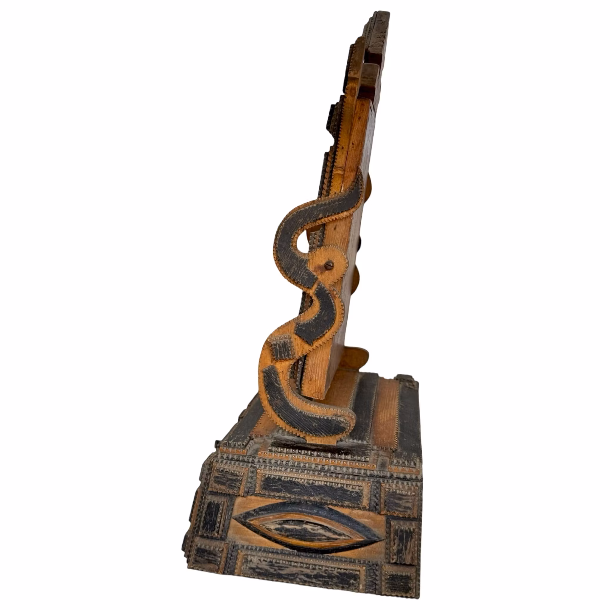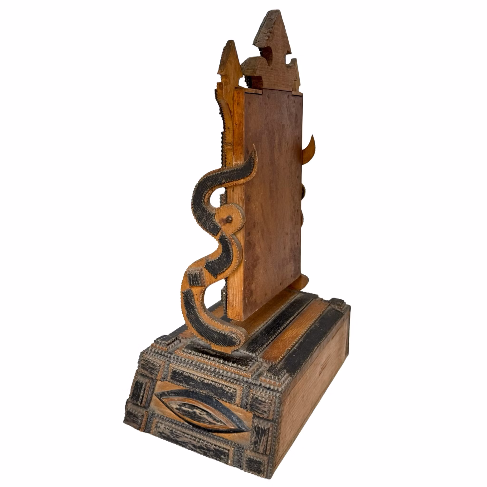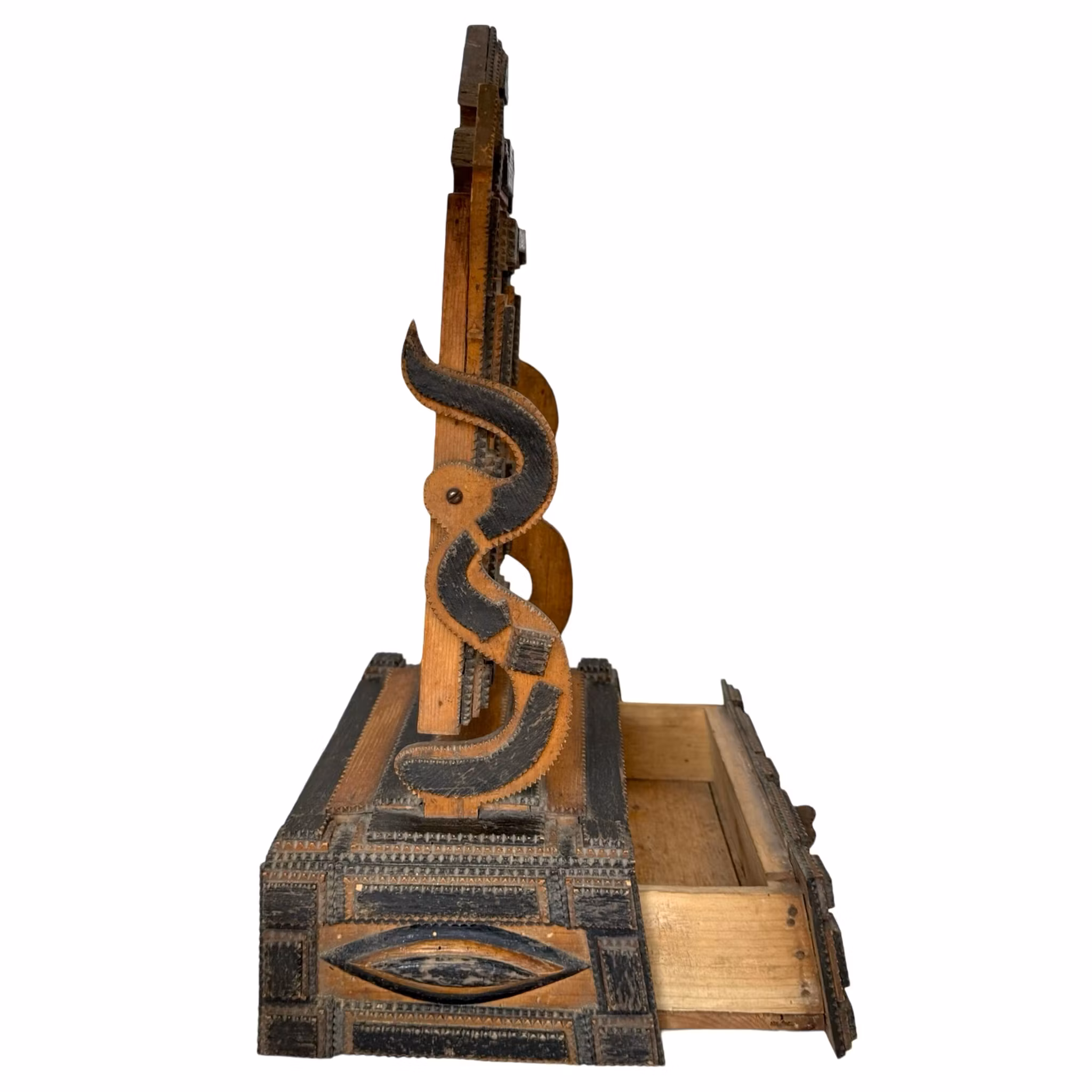 Trästomme med skuren dekor med en låda.