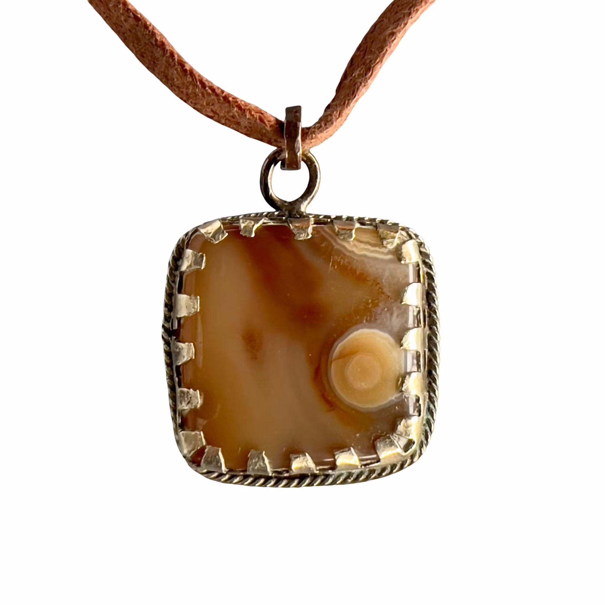 Vackert antik halsband med en fyrkantig agat berlock infattad i dekorativ metall och försedd med en natursten i varma bruna och honungs färgade toner. Stenen har ett naturligt, levande mönster som gör smycket unikt. Designen och patinan ger en tydlig antik känsla som passar både samlare och den som vill bära något speciellt.