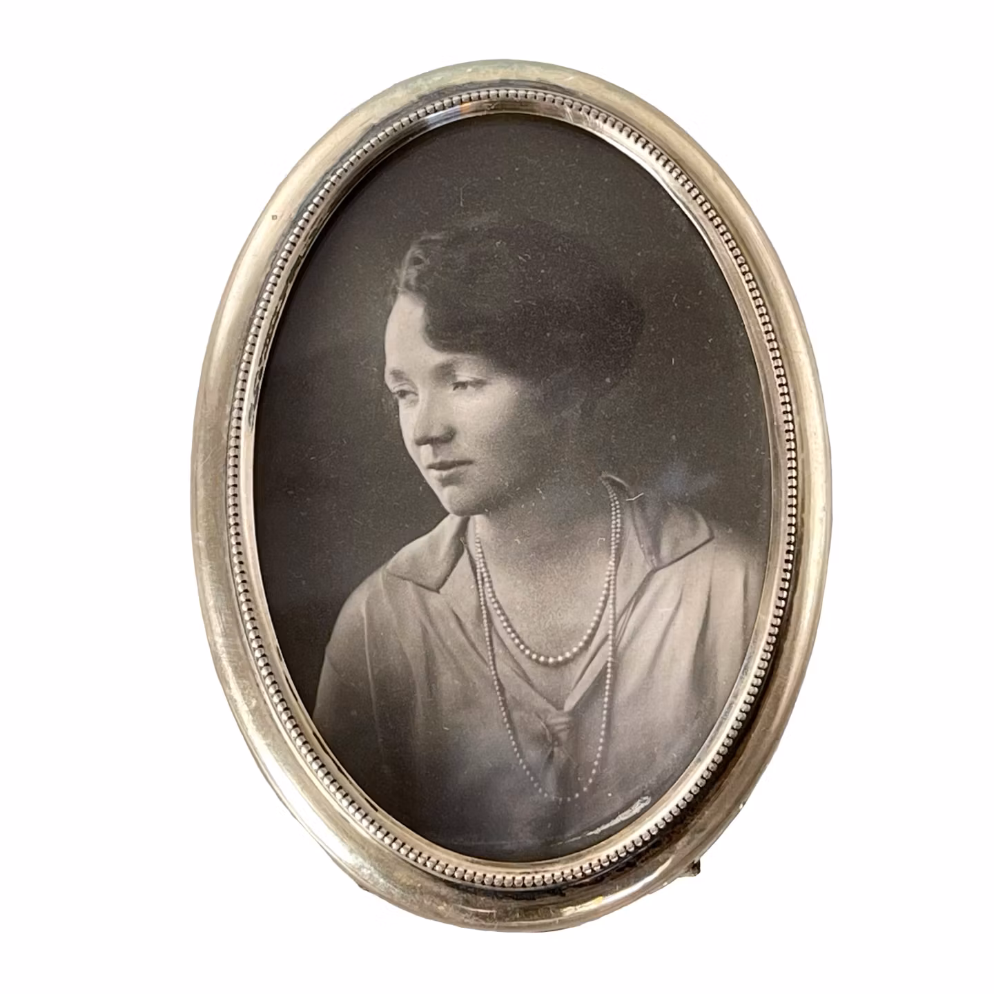 Elegant oval fotoram i äkta silver, Svensk ursprung 830S-stämpel anger 83 % silverhalt, vanligt i Sverige tidigt 1900-tal. Klassisk enkel design med pärlkant och svart originalbaksida i slitet skick. Innehåller ett äldre svartvitt porträttfoto.