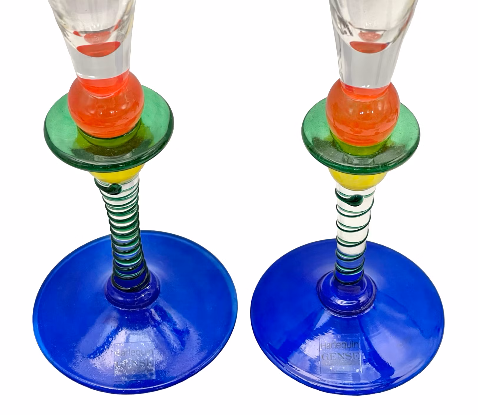 Dekorativa och färgstarka champagneglas i svenskt konstglas, ur Harlequin serien. Glasen har en tydlig handgjord karaktär med spiralformad stam, färgade glaskulor och kraftig blå fot. Original Harlequin etikett finns kvar på båda glasen.