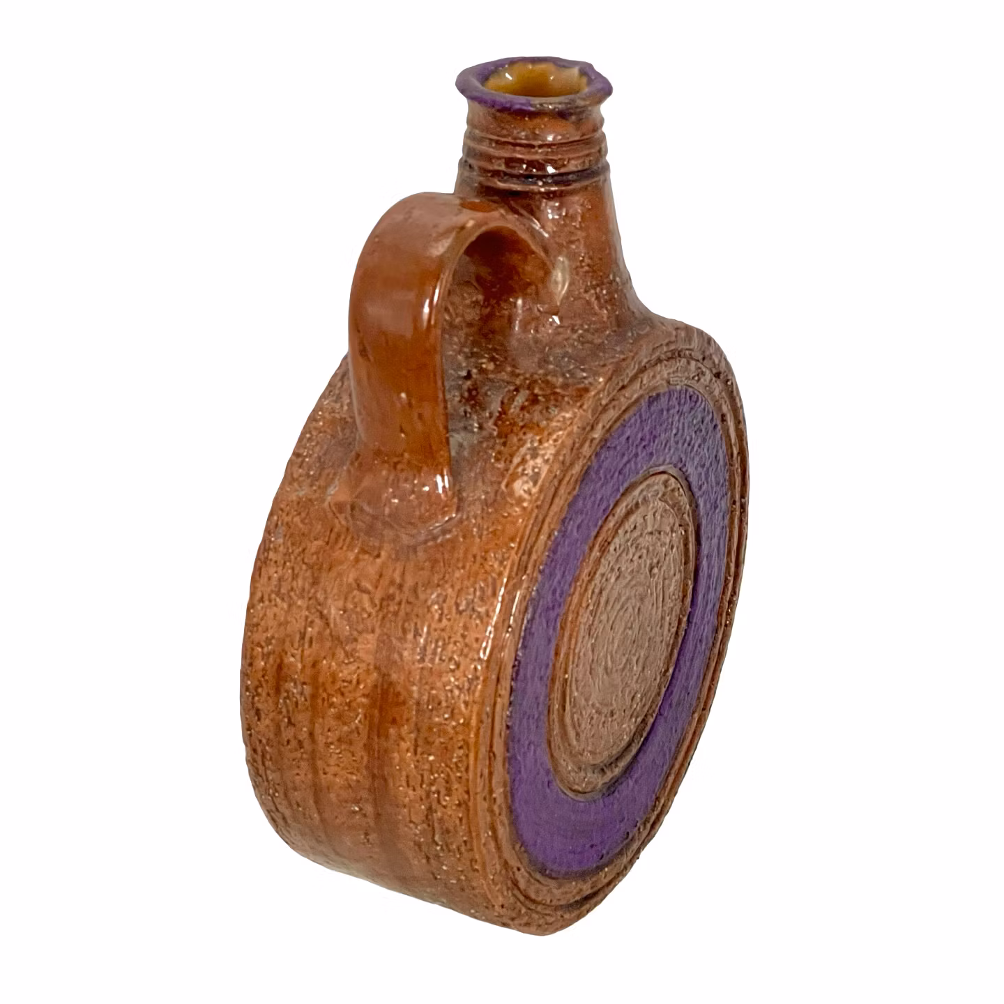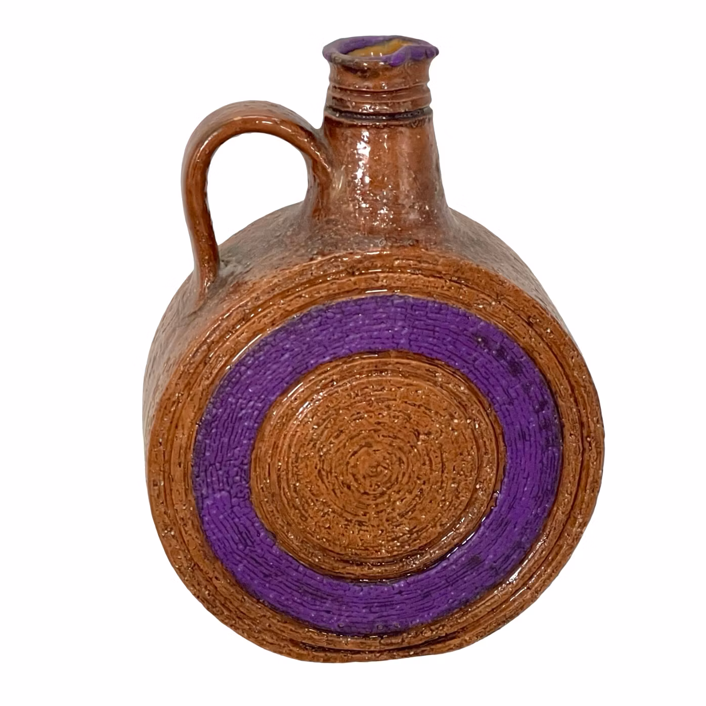 Denna vaskanna är formgiven av Aldo Londi för Bitossi och är ett tydligt exempel på den uttrycksfulla italienska designen från efterkrigstiden. Kombinationen av grov struktur, cirkulärt reliefmönster och brunlila glasyr ger föremålet ett starkt konstnärligt uttryck. En mycket dekorativ och eftertraktad designklassiker.