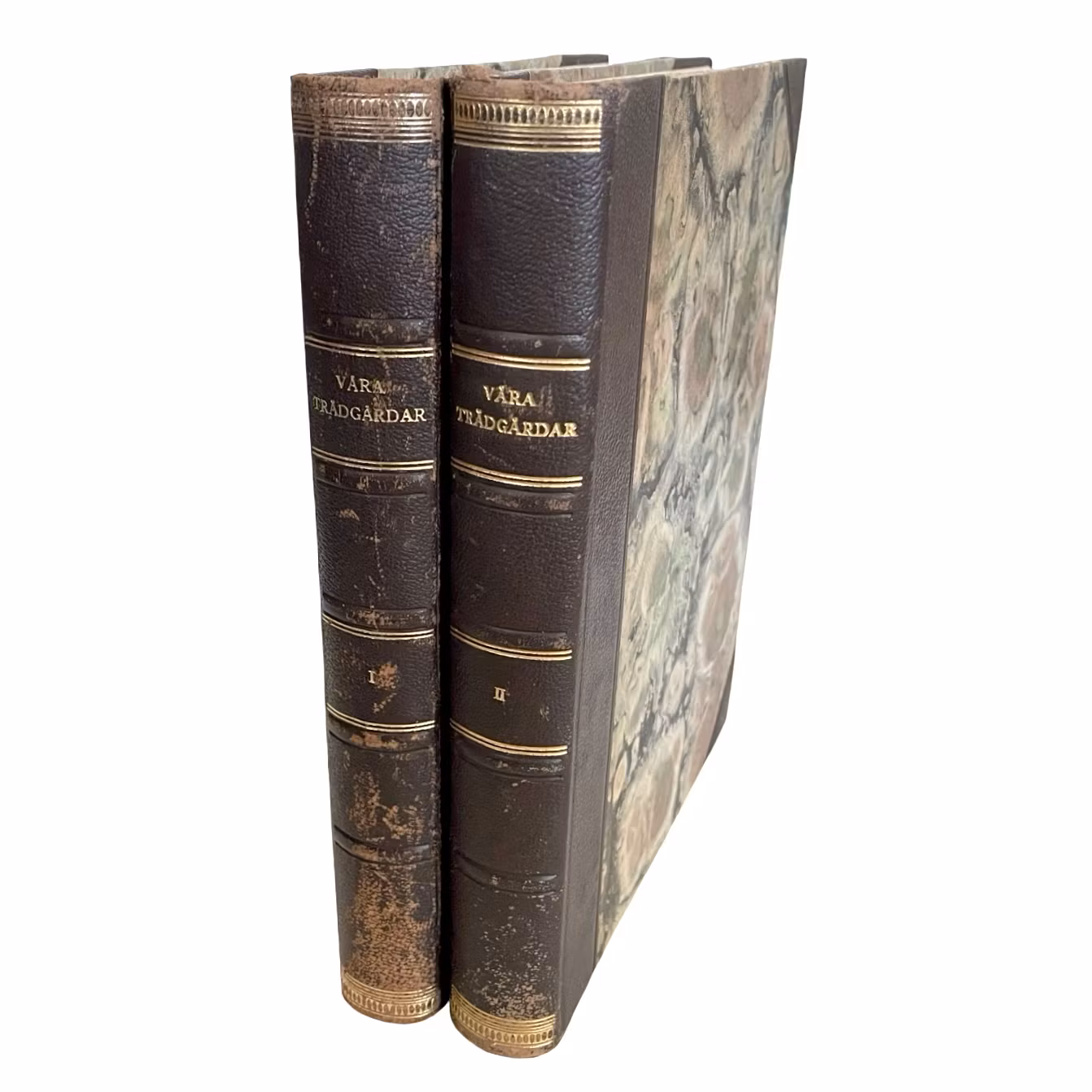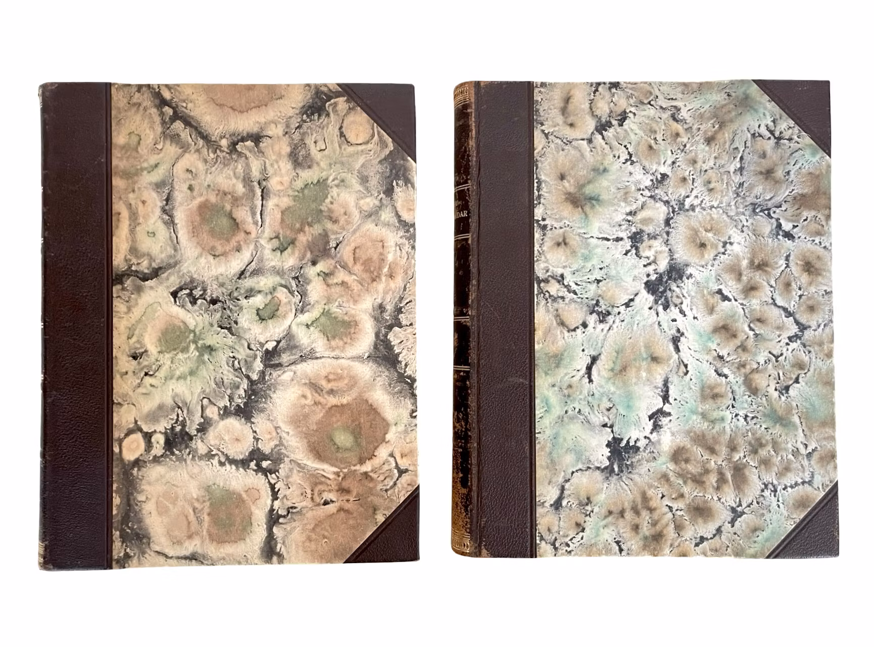 Två band i halvfranskt band med marmorerade pärmar.