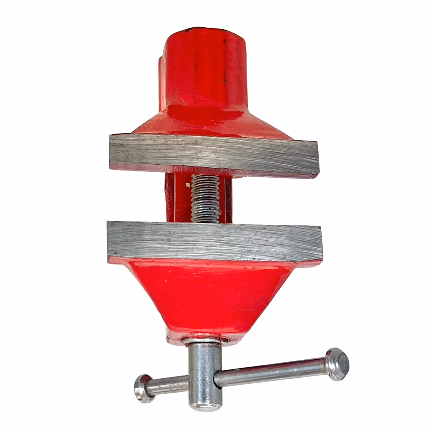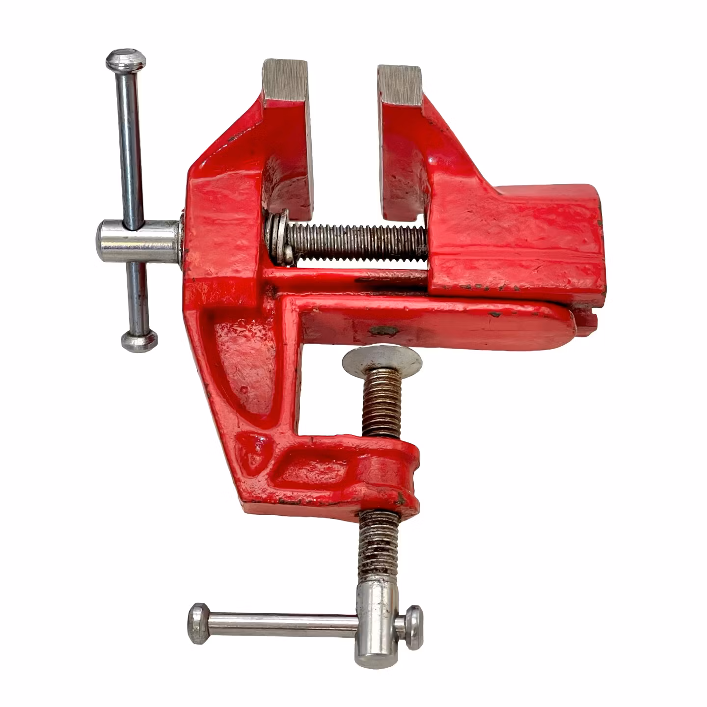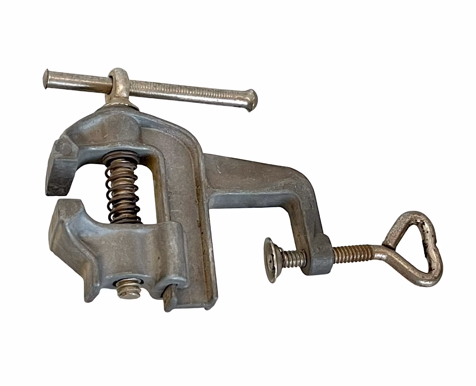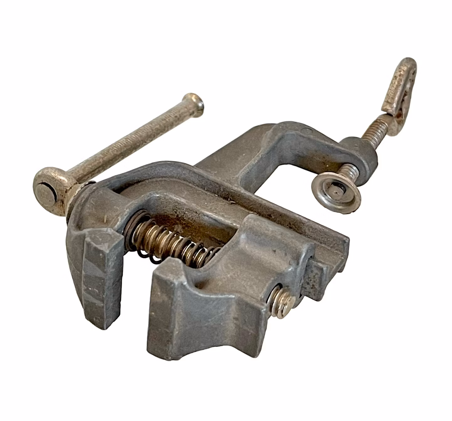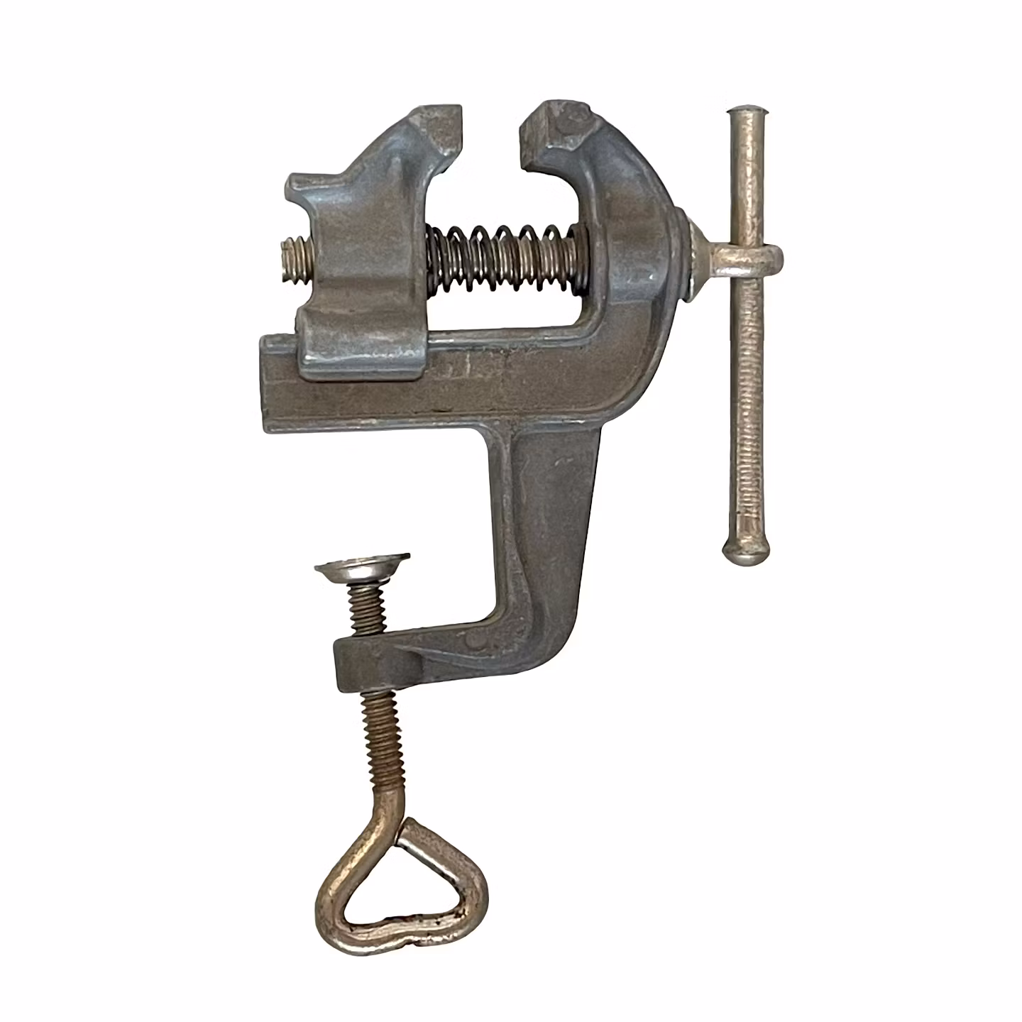 Två små bordsskruvstycken i metall, perfekta för hobby, modellbygge, elektronik, små mekaniska arbeten eller enklare reparationer. Båda fästs enkelt i bordskant med skruv.